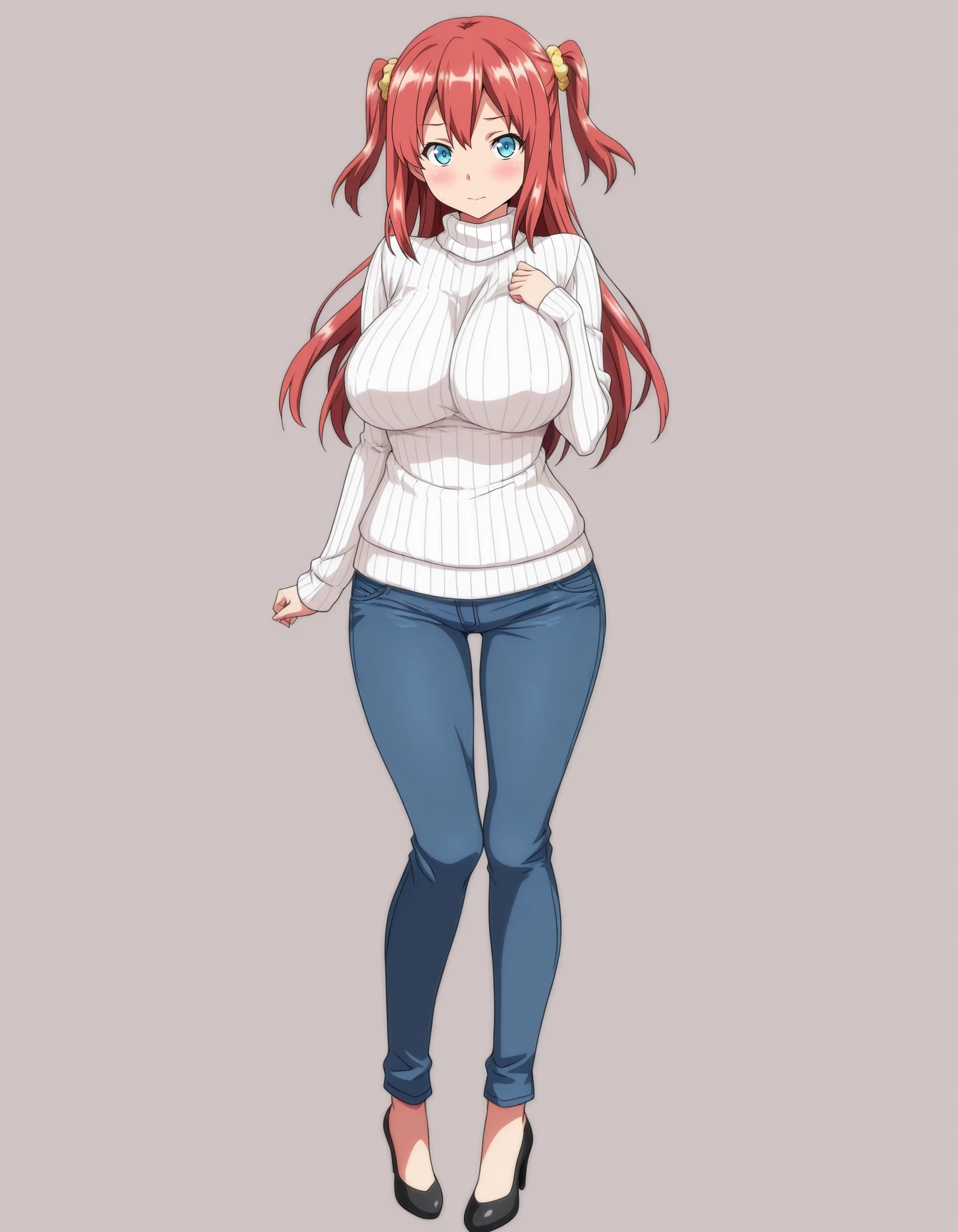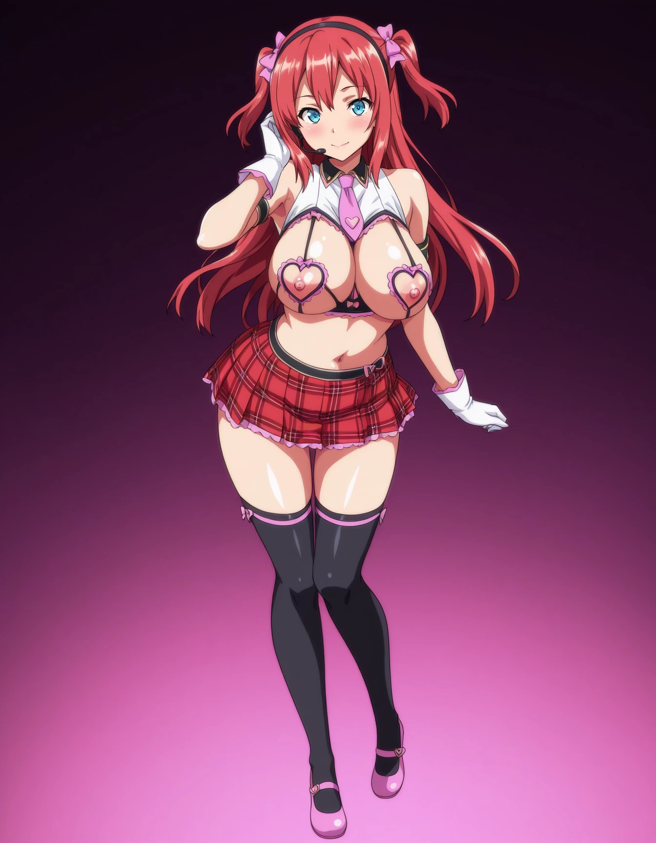mai_honamiim,long_hair,two_side_up,red_hair,blue_eyes,large_breasts,hair_ornament,idol,blue_vest,necktie,short_sleeves,white_thighhighs,pleated_skirt,plaid_skirt,pink_skirt,pink_footwear,footwear_bow