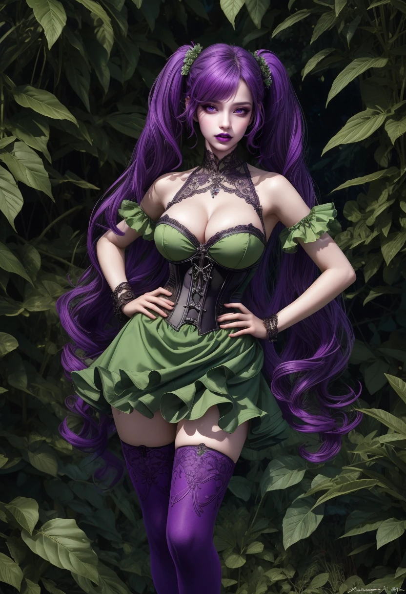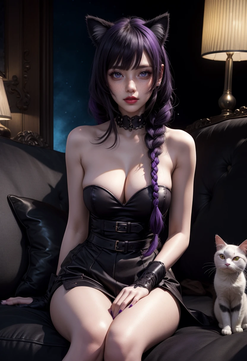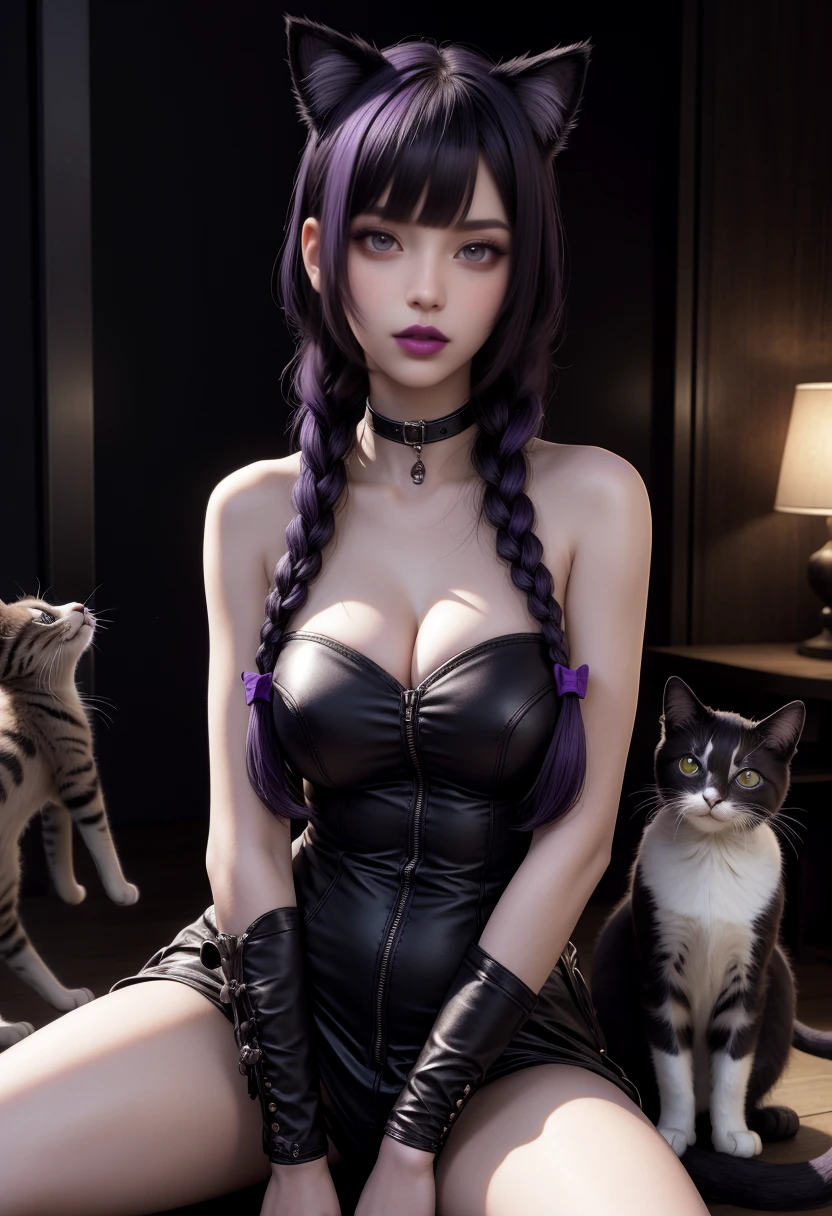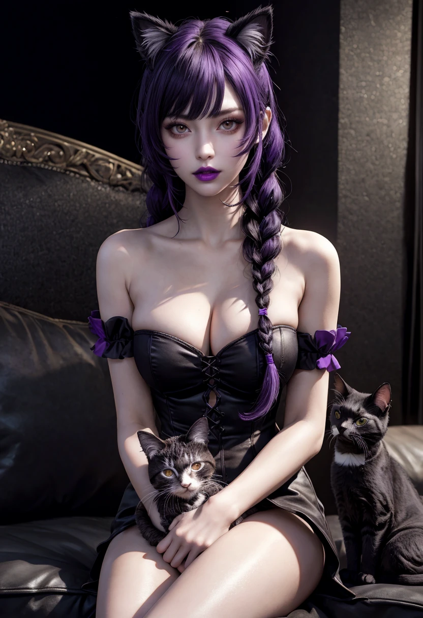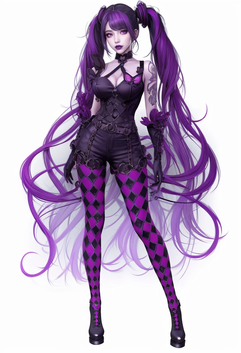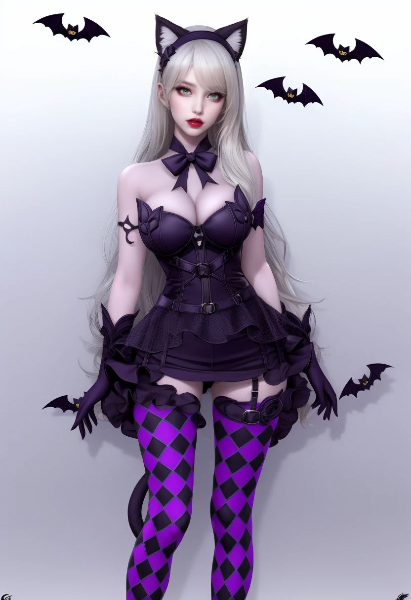 Prompts for best resemblance: corset, ruffled skirt, argyle legwear, argyle, harlequin-patterned thighhighs, cat tail accessory, gloves, high heels, asymmetrical design, ruffles, sleeveless-dress, (don't use if you want more clothing versatility)