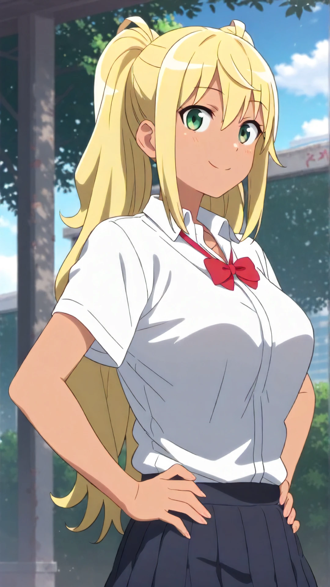 hibiki_sakura, an anime girl, 1girl, solo, long hair, breasts, looking at viewer, smile, skirt, blonde hair, shirt, bow, twintails, closed mouth, school uniform, green eyes, white shirt, short sleeves, pleated skirt, outdoors, sky, day, collared shirt, cloud, dark skin, bowtie, red bow, dark-skinned female, red bowtie, hands on hips, gyaru