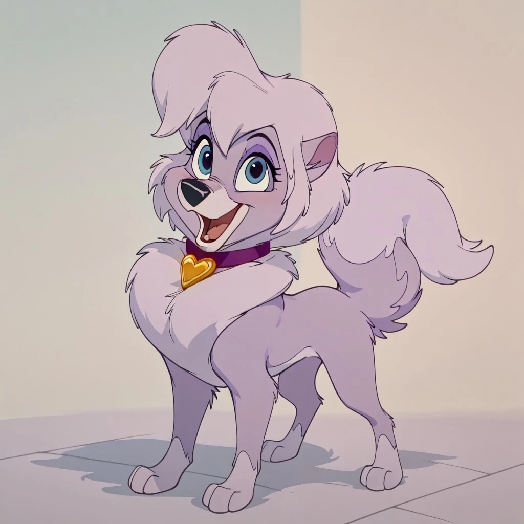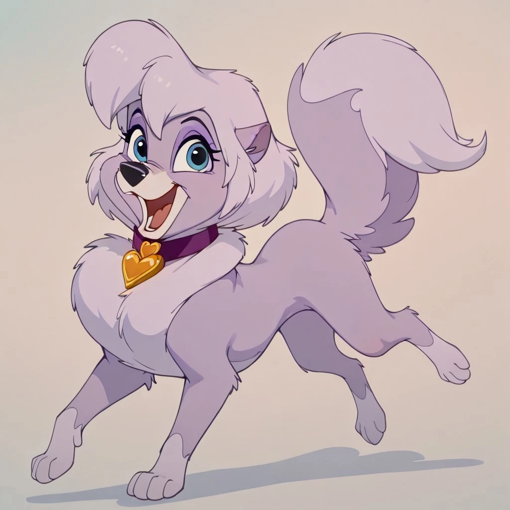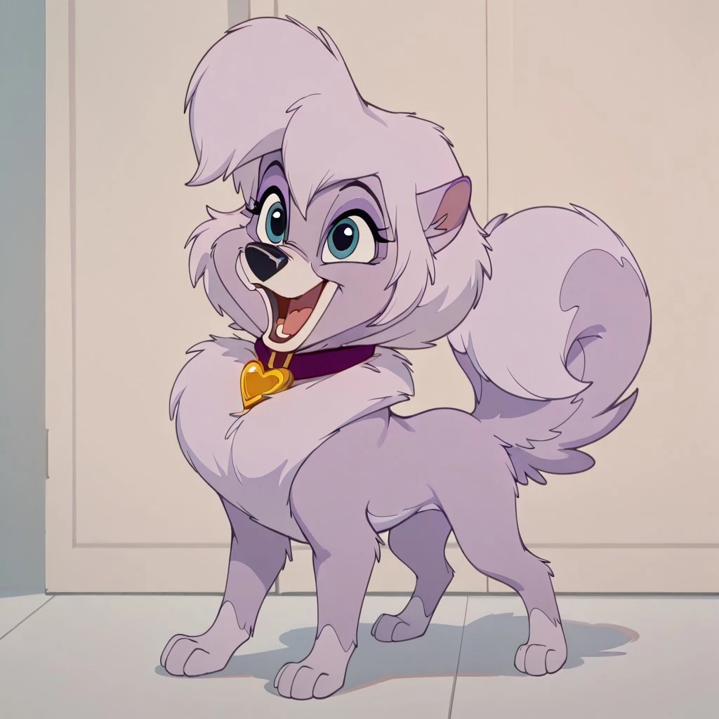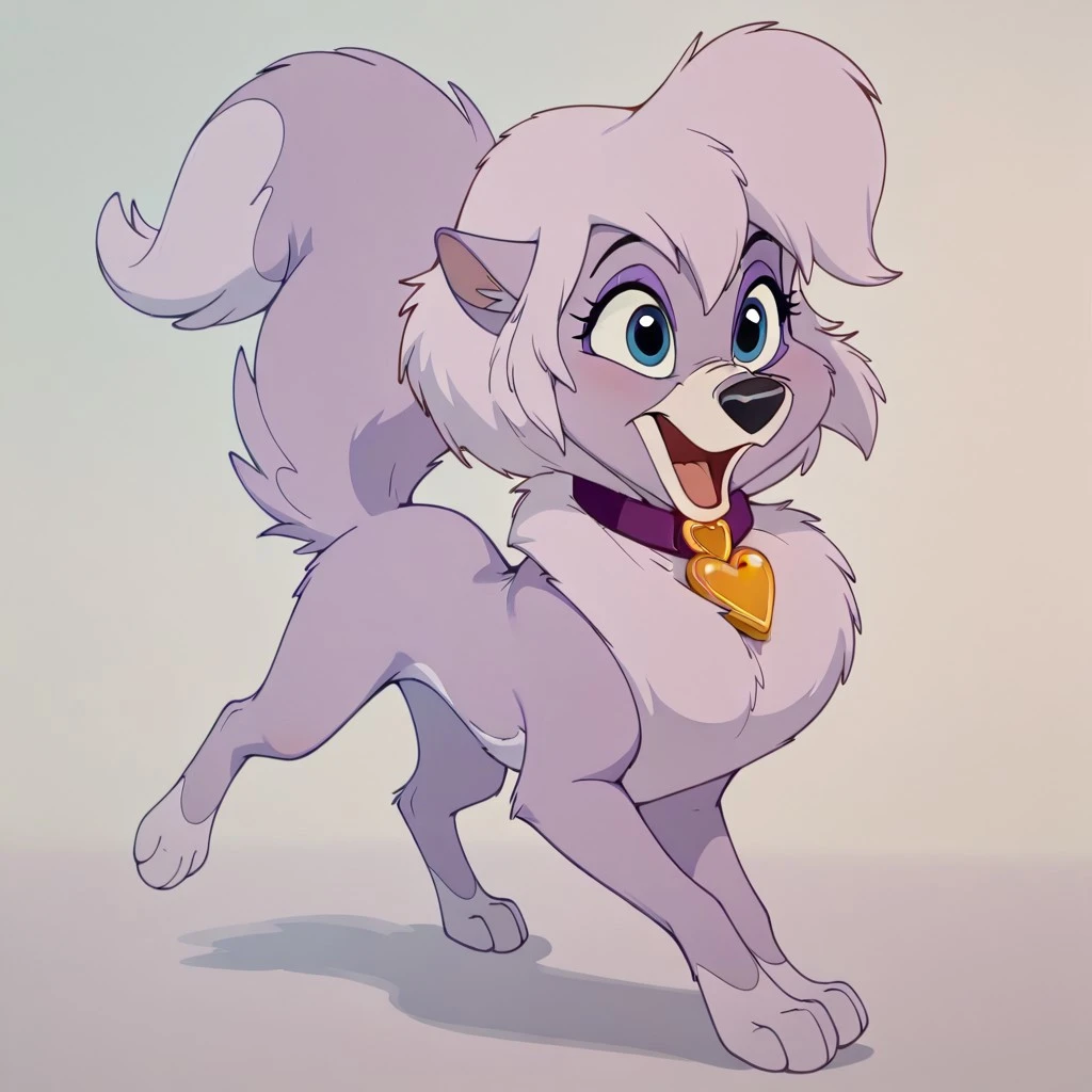 dixie, female, dog, disney, pomeranian, lavender fur, light lavender hair, light lavender ruff, light lavender paws, purple patches around eyes, light lavender tail, brown hair, blue eyes, purple collar with golden heart pendant
