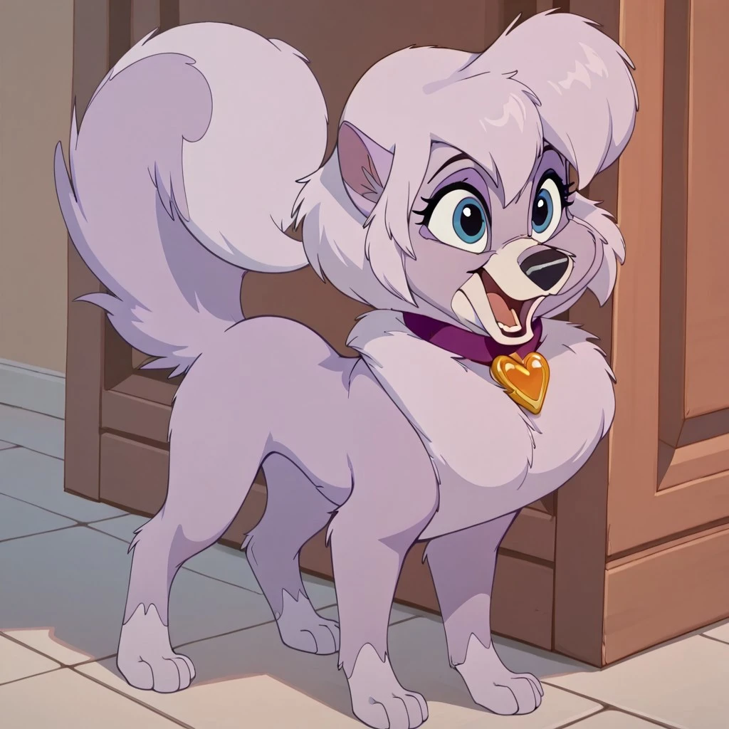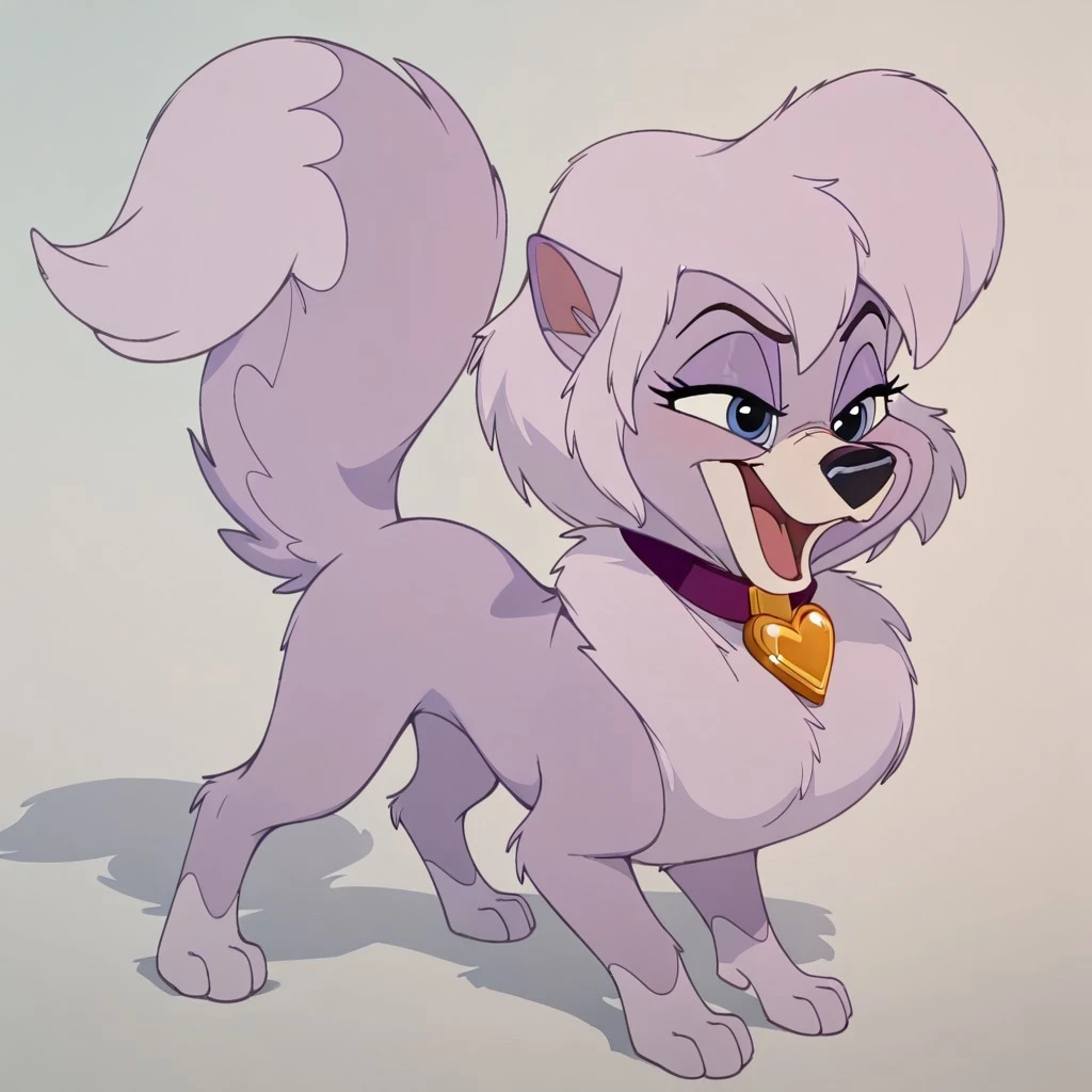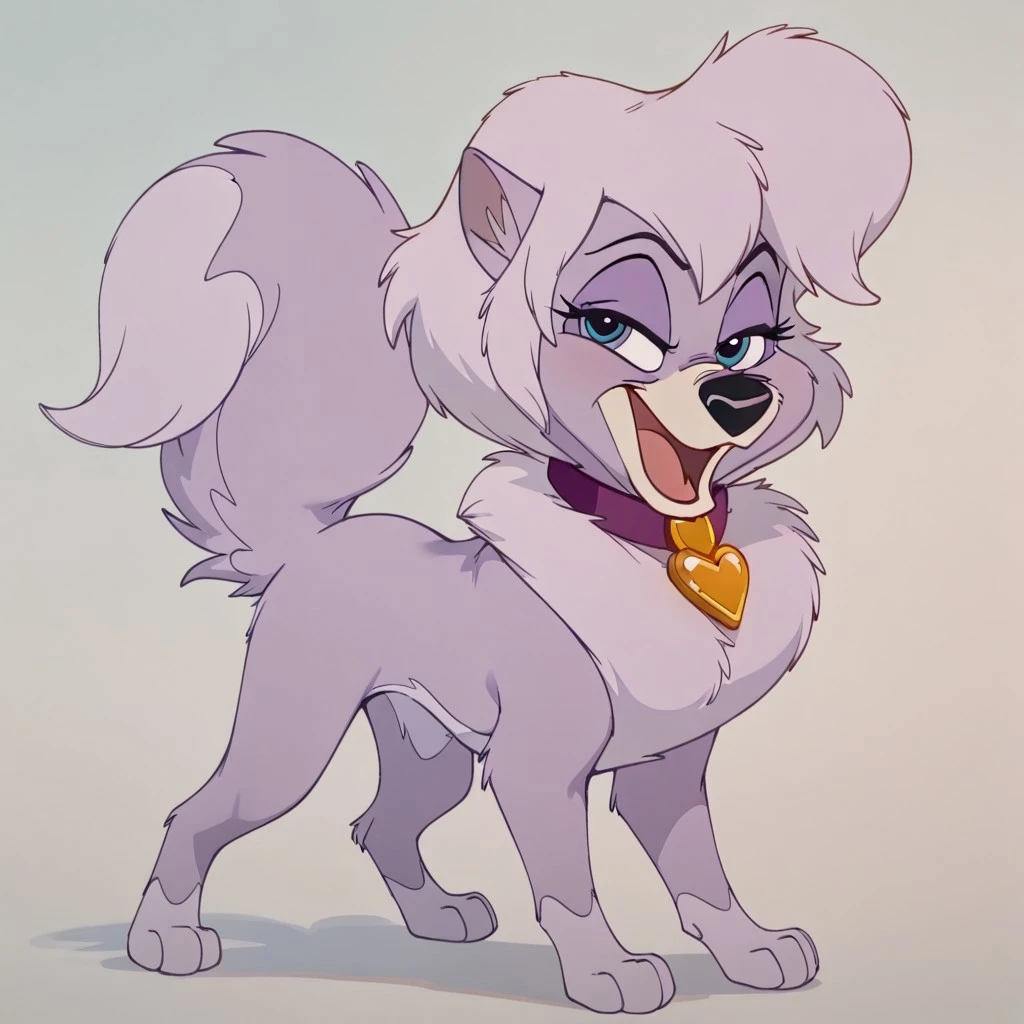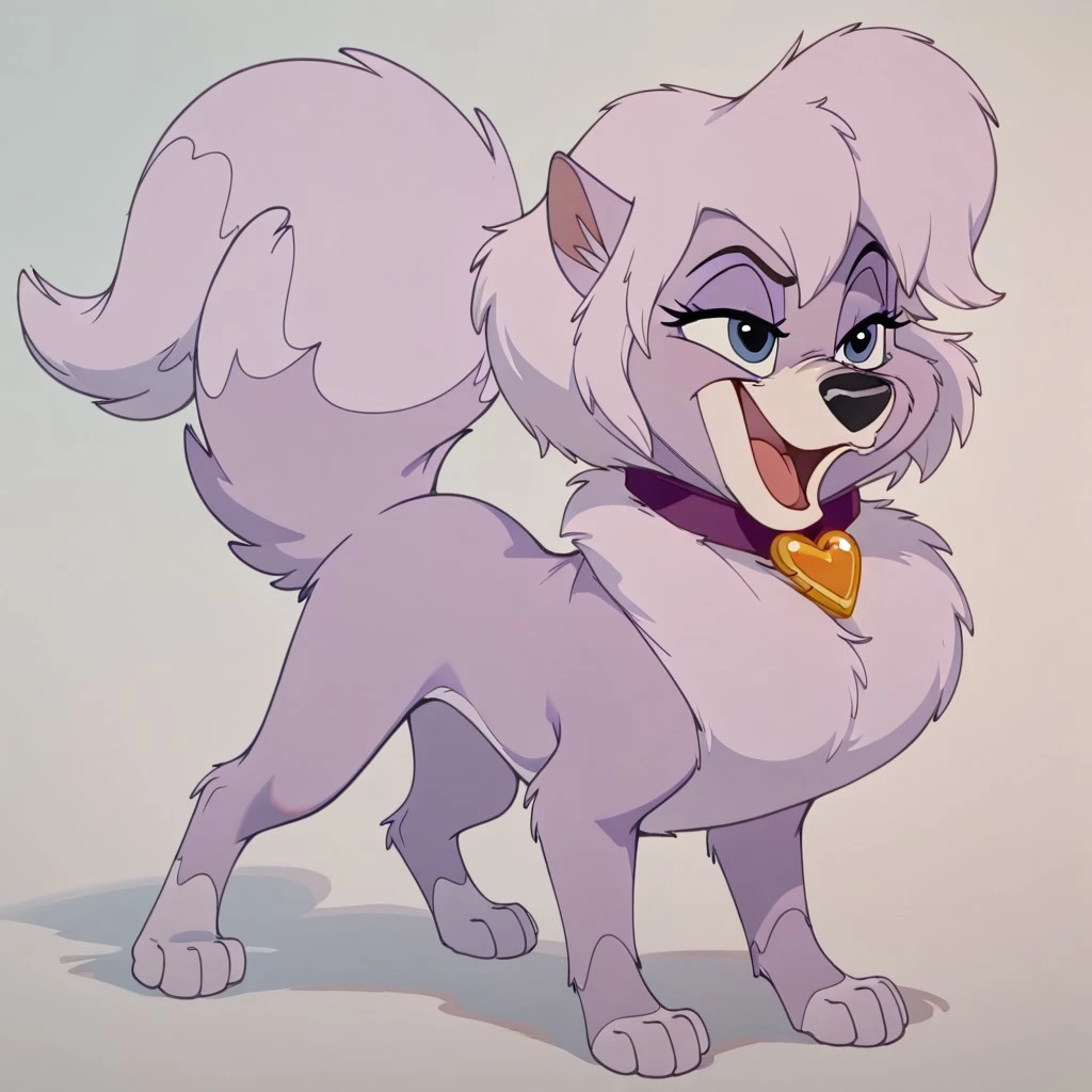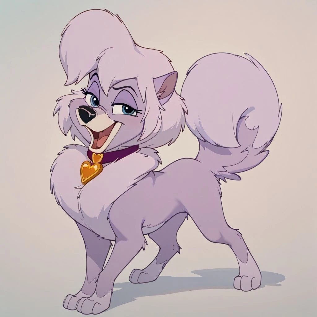 dixie, female, dog, disney, pomeranian, lavender fur, light lavender hair, light lavender ruff, light lavender paws, purple patches around eyes, light lavender tail, brown hair, blue eyes, purple collar with golden heart pendant