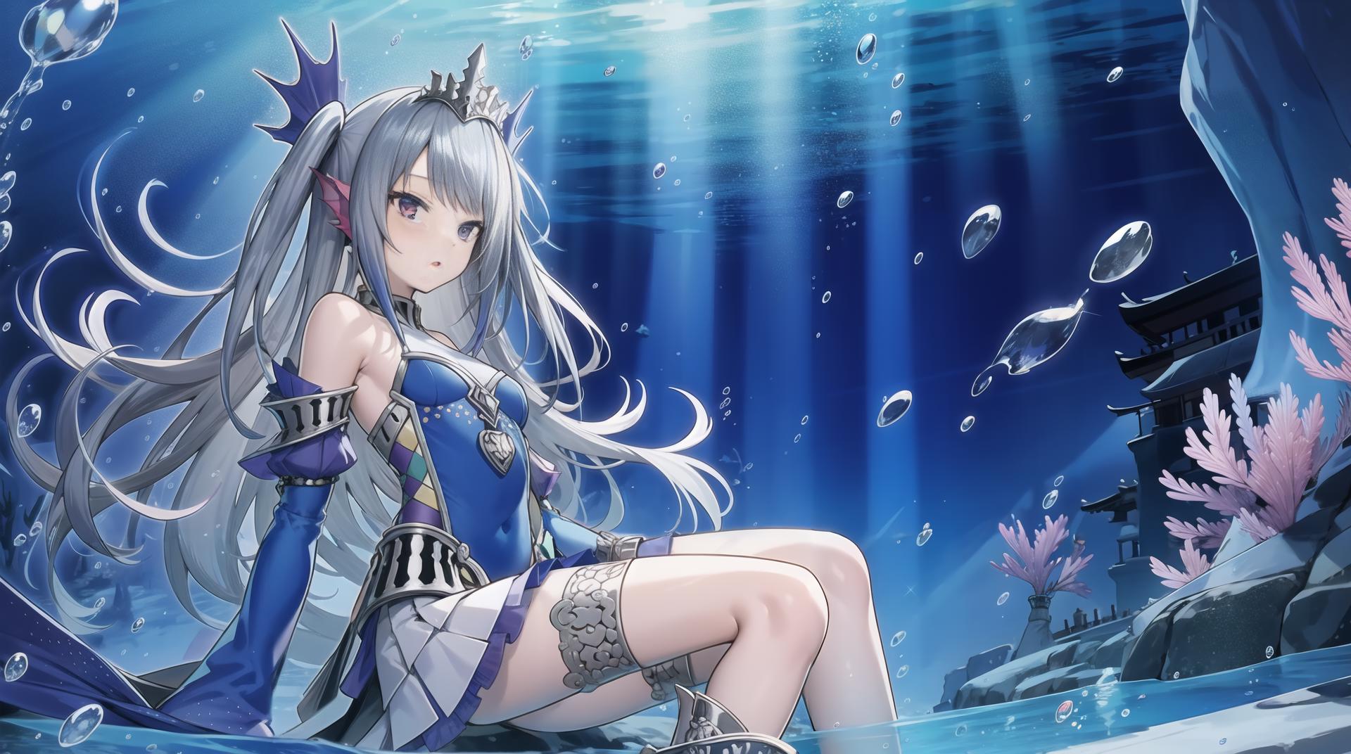 Trigger:1girl, solo, long hair, purple eyes,head fins,grey hair, blue hair, multicolored hair, small breasts, blue dress, detached sleeves, sleeves past wrists, tiara, skirt, outstretched arms, crown, parted lips