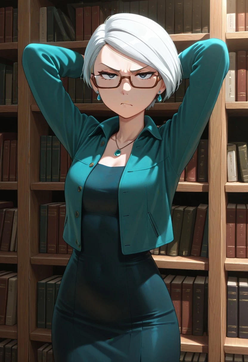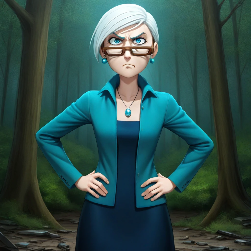 joy_je, white hair, short hair, brown-framed_eyewear, blue eyes, jacket, dress, necklace, earrings