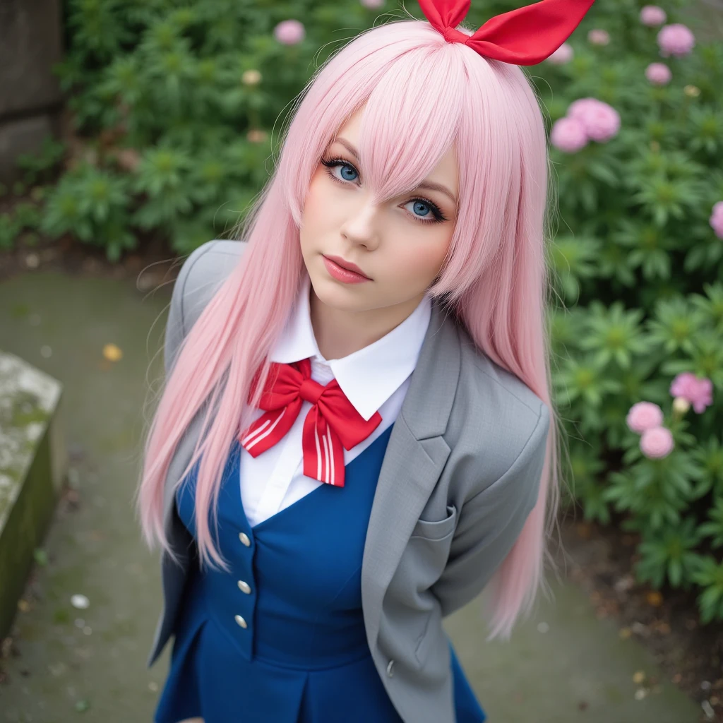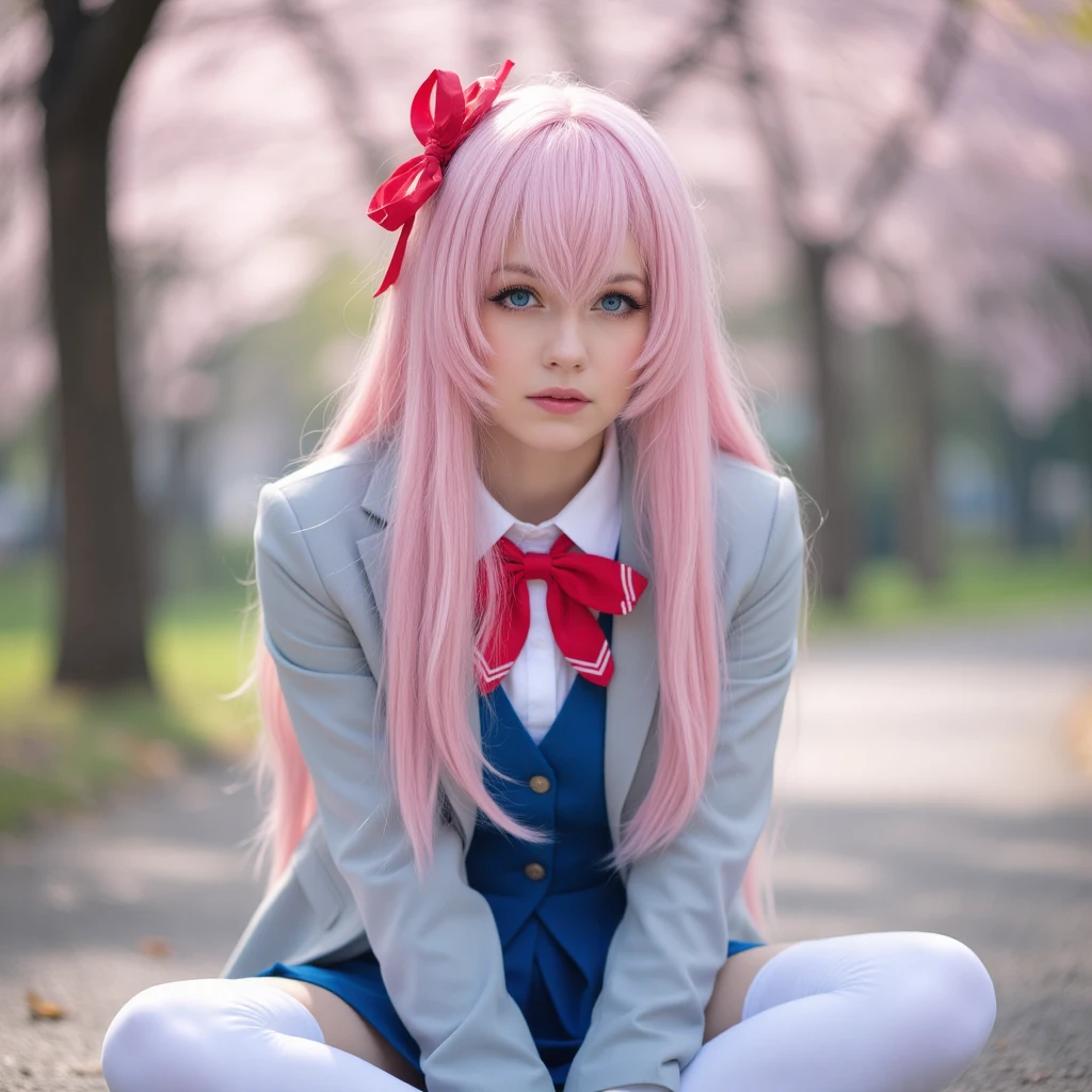 Alya - {Alya cosplay, long pastel pink hair, blue eyes, red ribbon in hair, red bowtie with white stripes, grey blazer, blue vest and skirt, white undershirt, white thighhighs}
