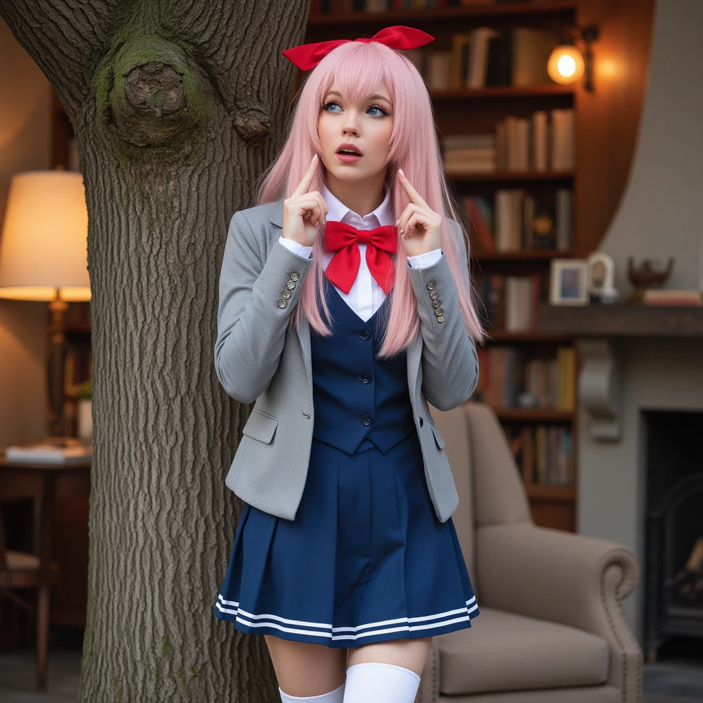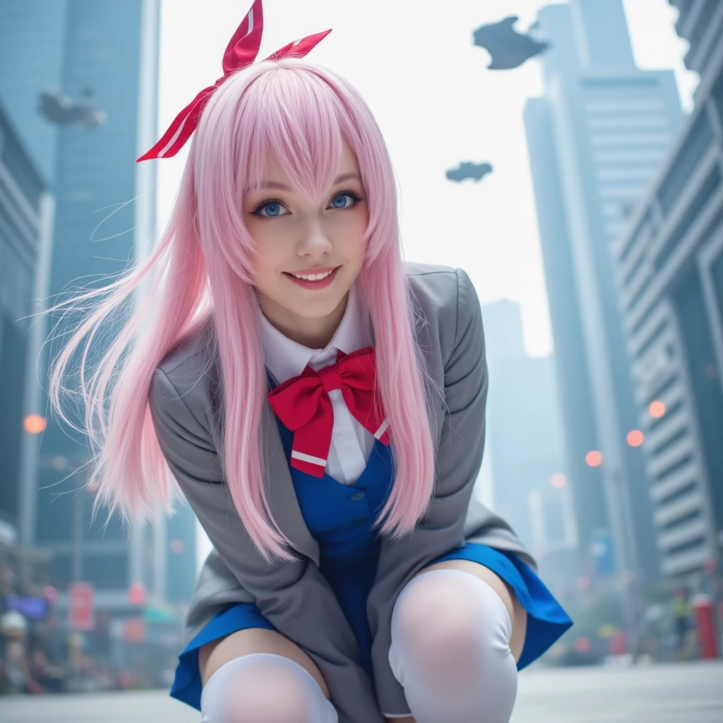 Alya - {Alya cosplay, long pastel pink hair, blue eyes, red ribbon in hair, striped red bowtie, grey blazer, blue vest and skirt, white undershirt, white thighhighs}