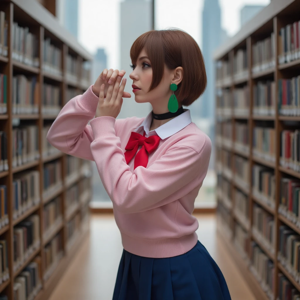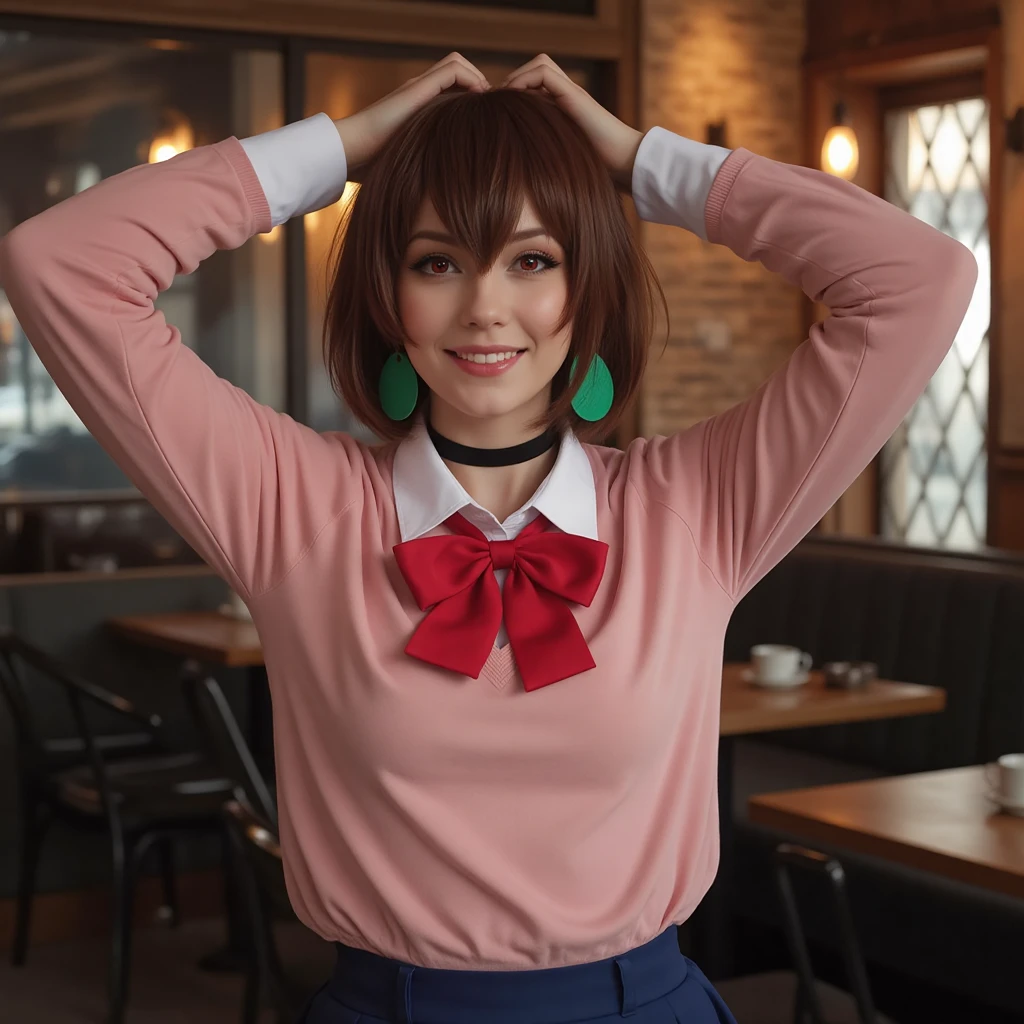 Momo - {Momo cosplay, short brown hair, red eyes, large green earrings, black choker, white shirt collar, pink sweater, red bowtie, blue skirt, white leg warmers}