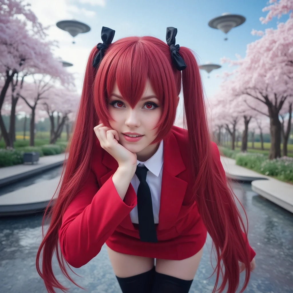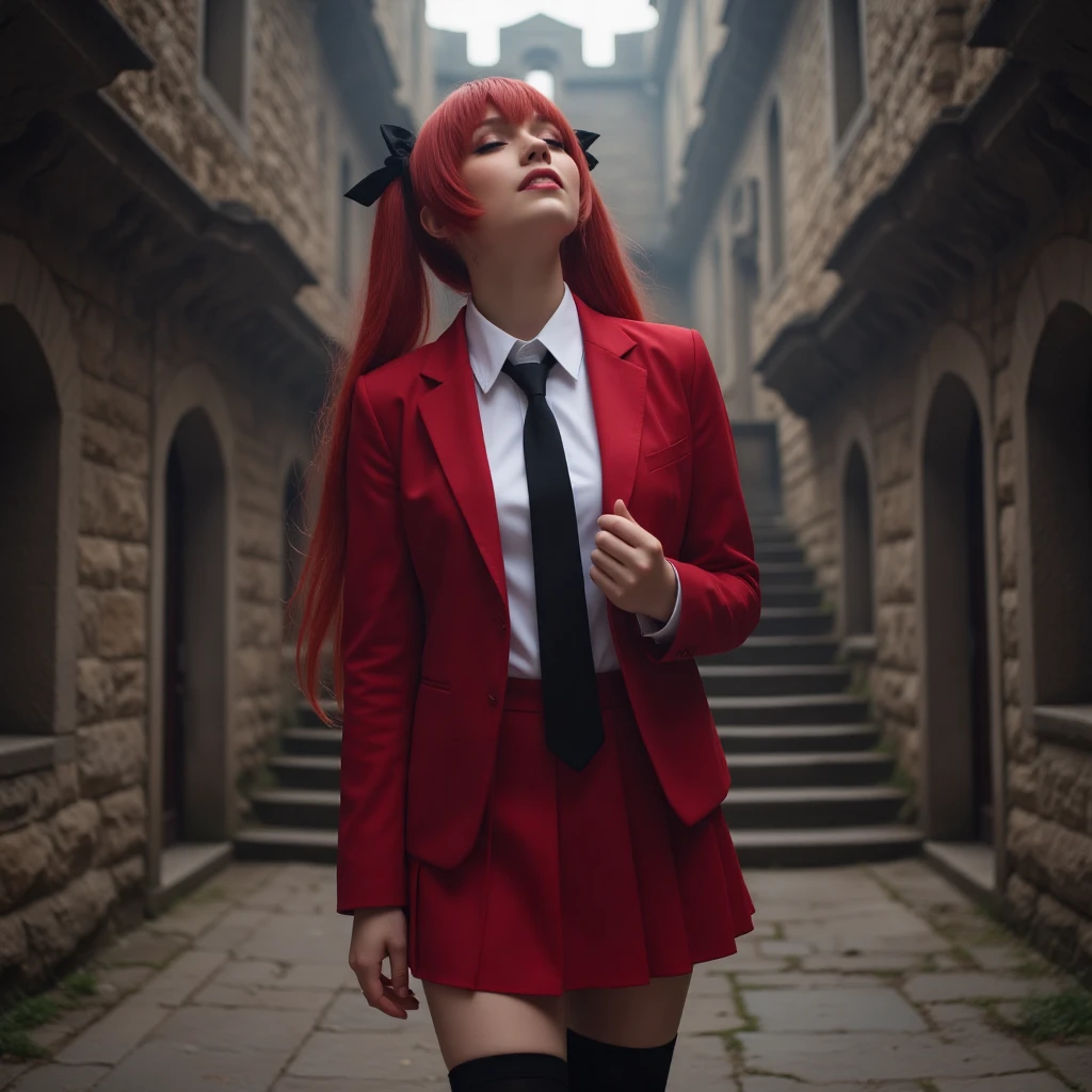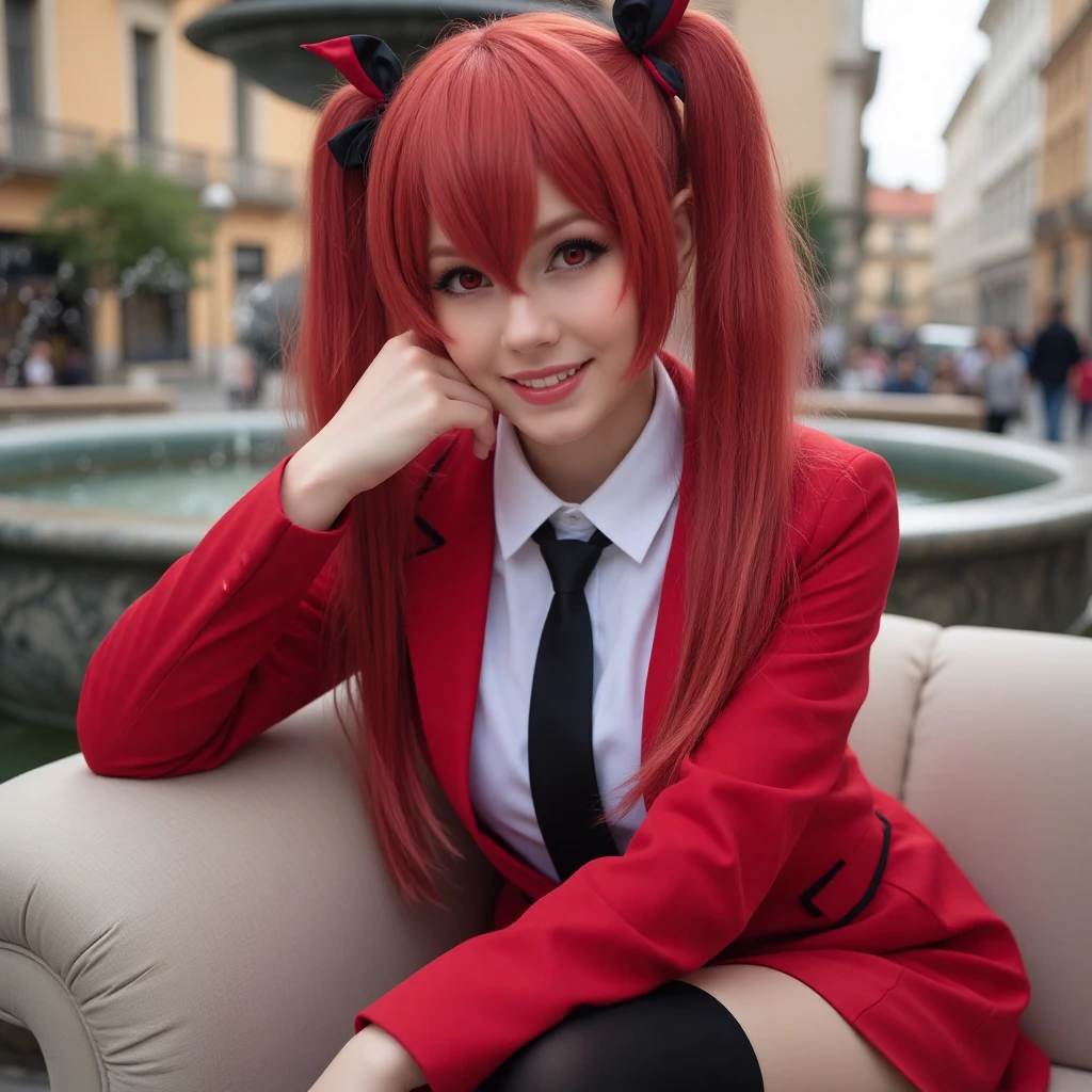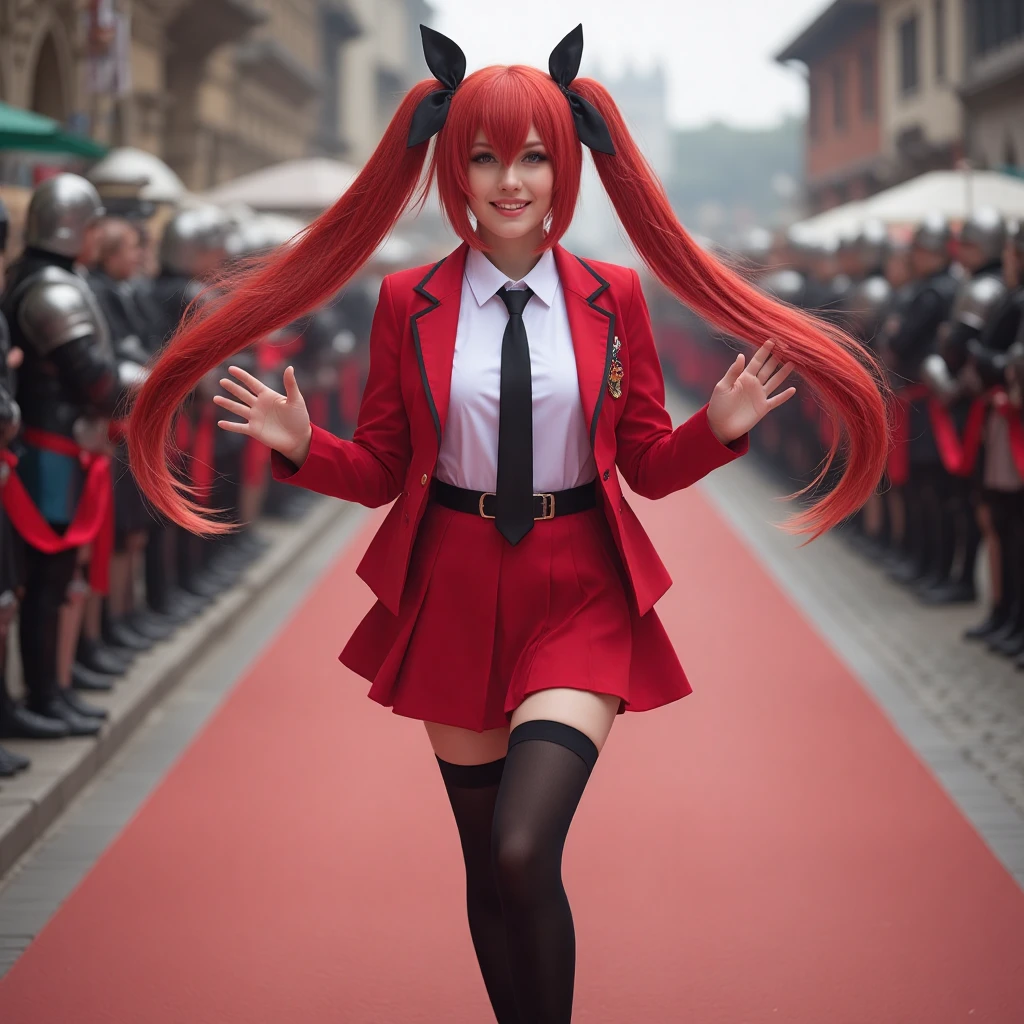 Kotori - {Kotori cosplay, long red hair, twintails, red eyes, two-tone bow, black tie, red blazer, white undershirt, red skirt, black thighhighs}