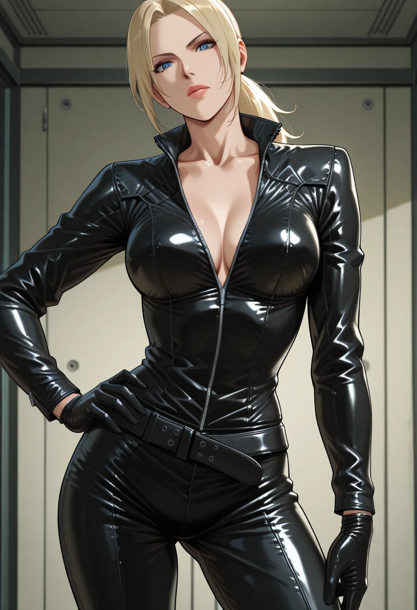 black leather suit, black leather pants, black leather gloves, black leather boots, belt, leg beltsDescription