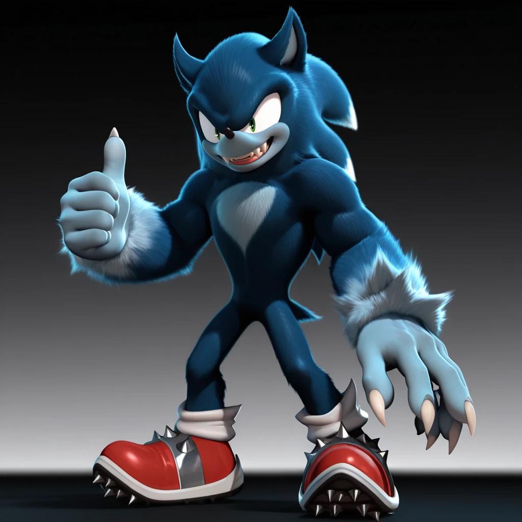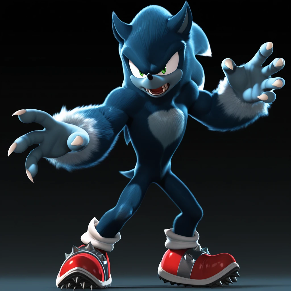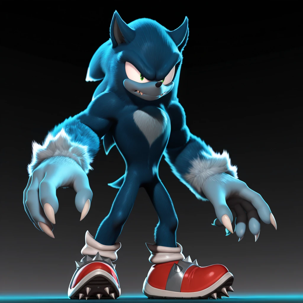 1boy, male, furry, anthro, werewolf-like, solo, dark blue-grey fur, two-tone fur, green eyes, black nose, fangs, pointed ears, sharp nails, short tail