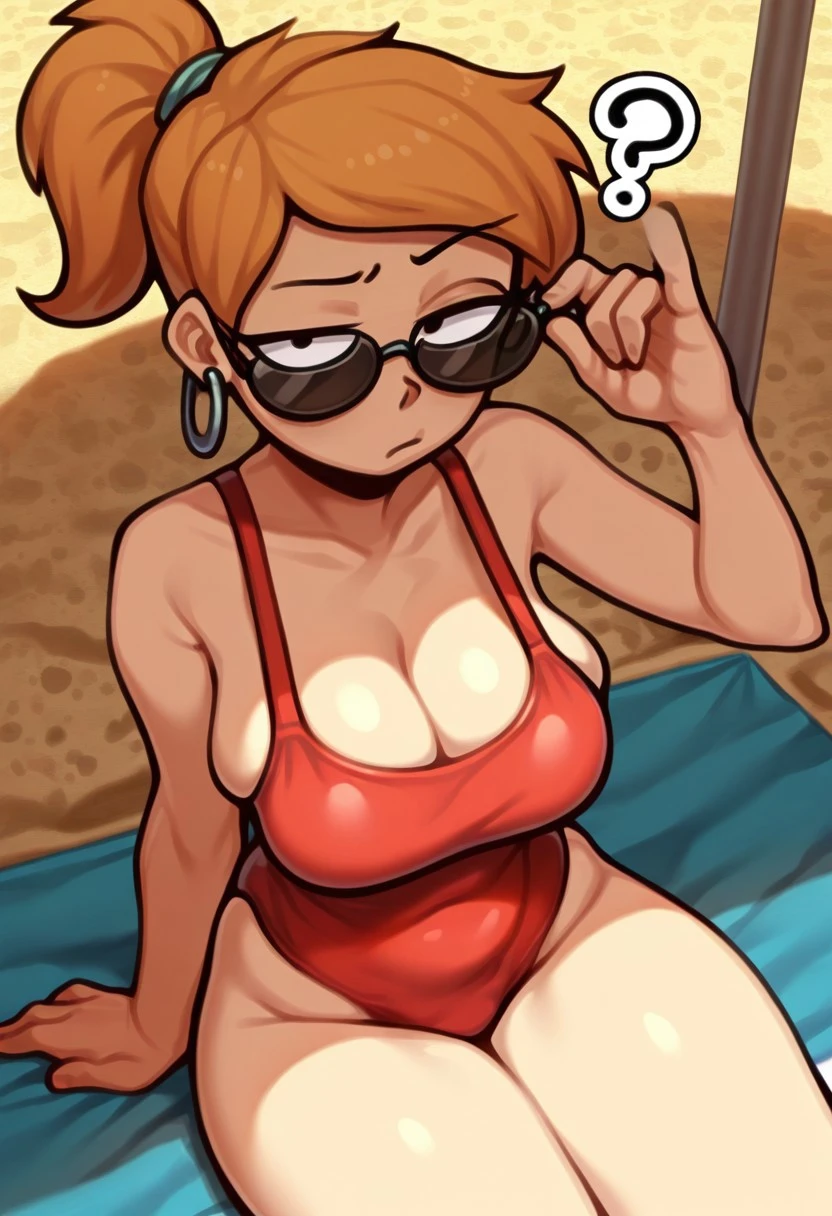 1girl, zoey_sf, dot eyes, ginger, ponytail, glasses,