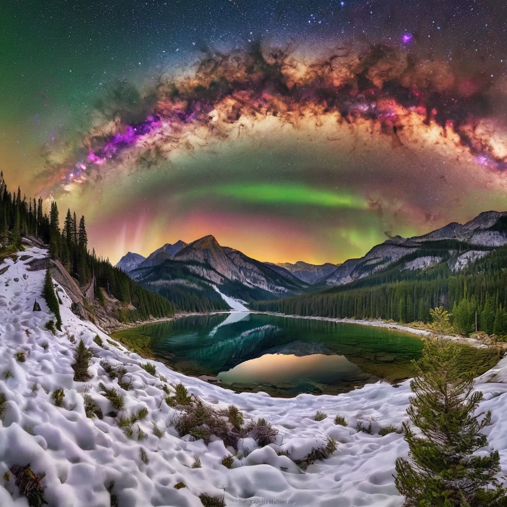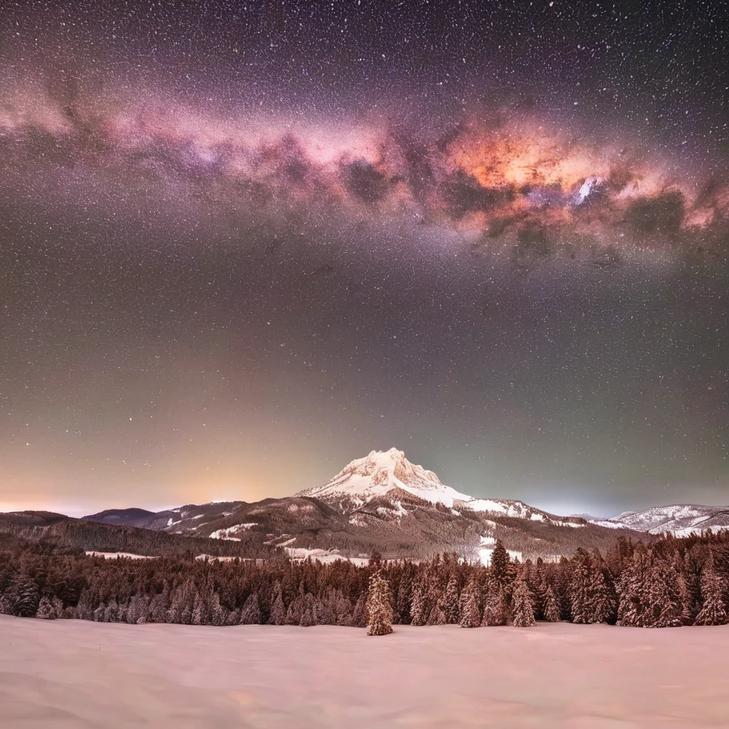 photorealistic wide-angle shot of the Milky Way arching over snow-capped mountains,