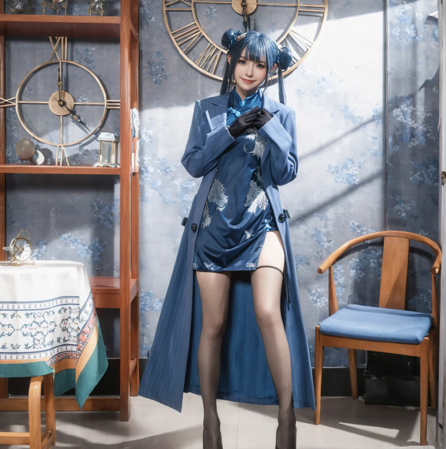 可以用这些词:Blue Archives - Fei Saki cos, 1girl, breasts, ???????, solo, dress, realistic, gloves, sitting, kisaki \(blue archive\), long hair, hair ornament, english text, jacket, small breasts, clothes pull, breasts out, indoors, pinstripe pattern, lips, sleeveless, coat, off shoulder, bare shoulders, medium breasts, looking at viewer, dress pull, hand on own chest, Light and shadow, indoor environment