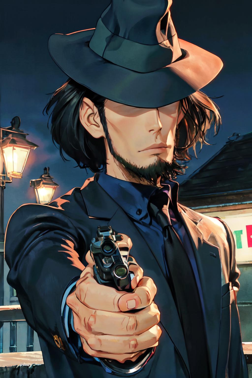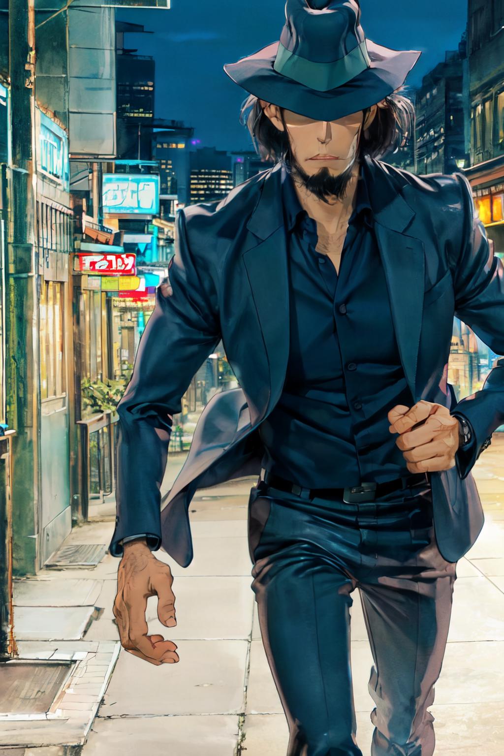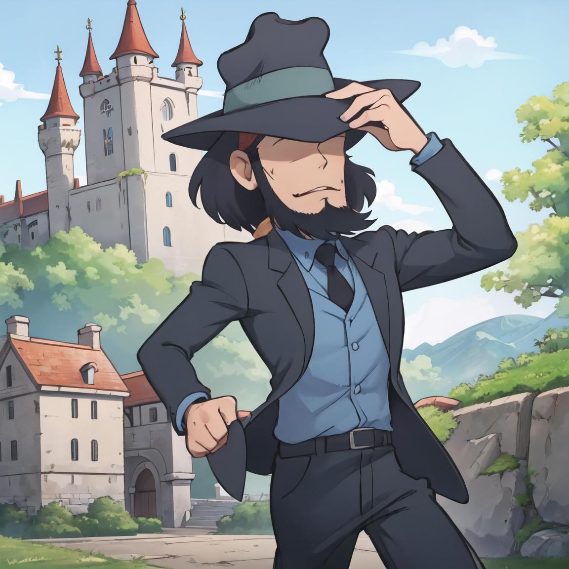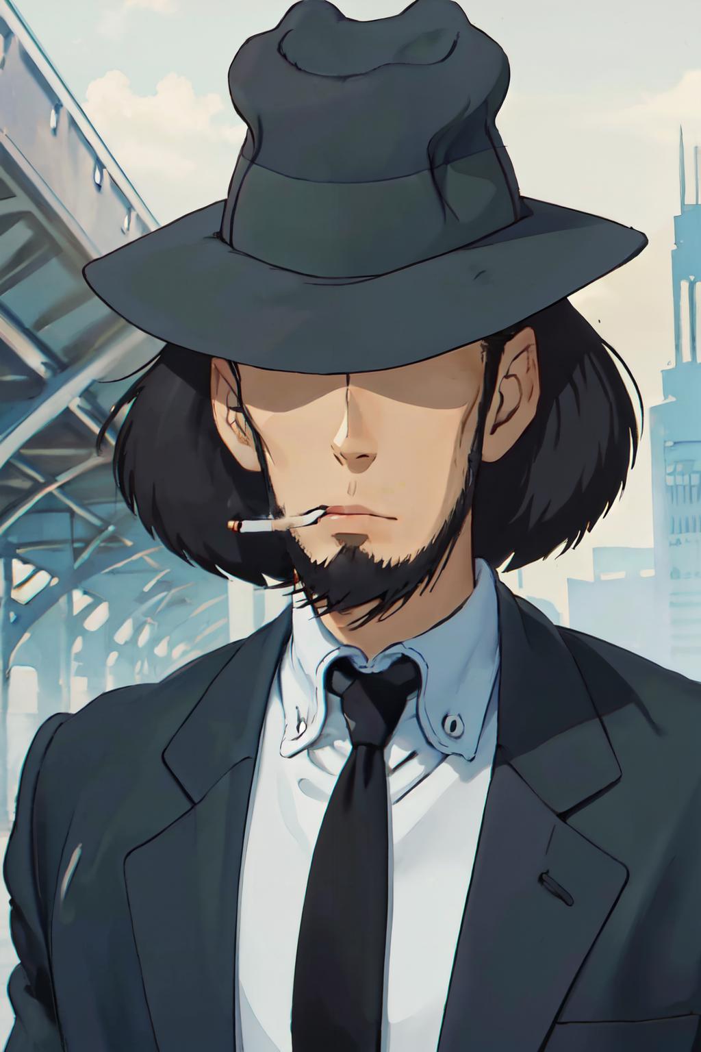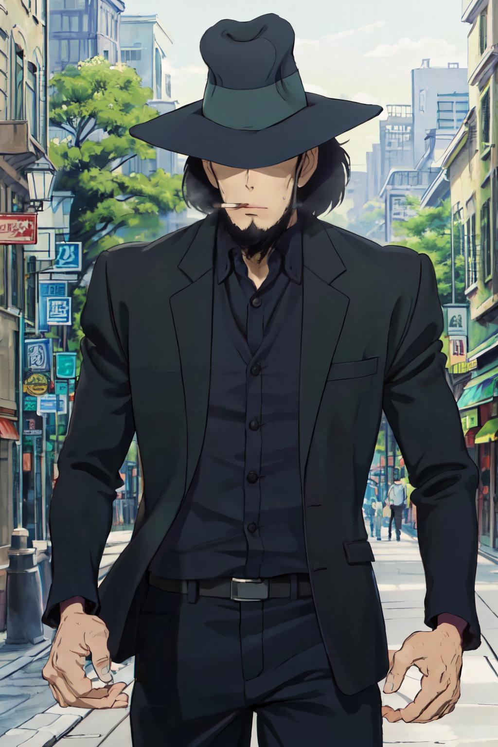 "Jigen" activation, "hat, formal" for outfit. He's apparently mastered shadow cloning ju-jitsu, add "1boy" to curb that