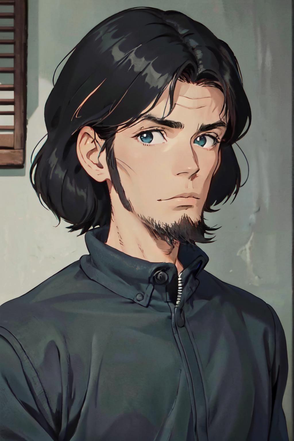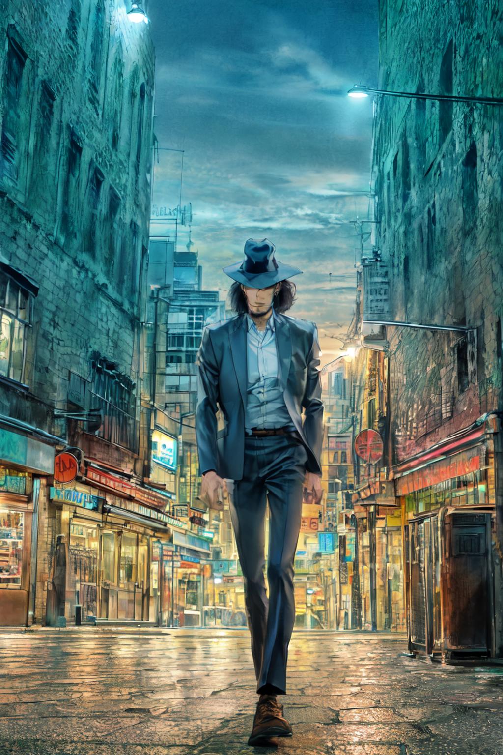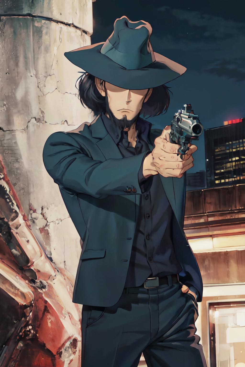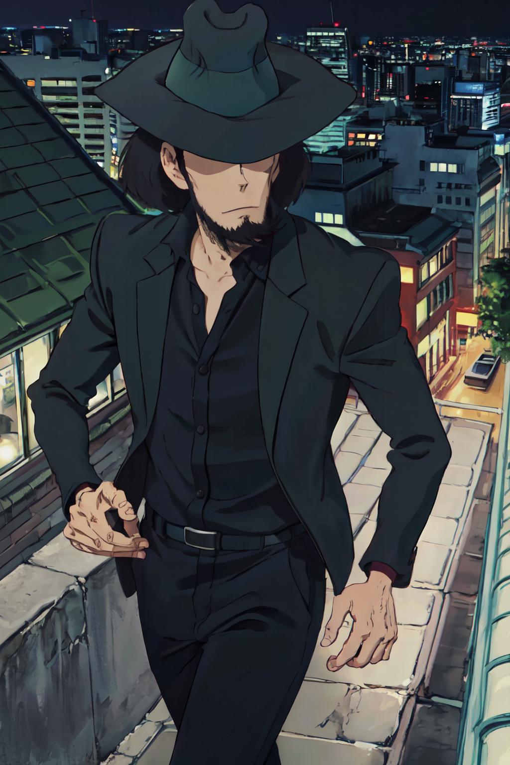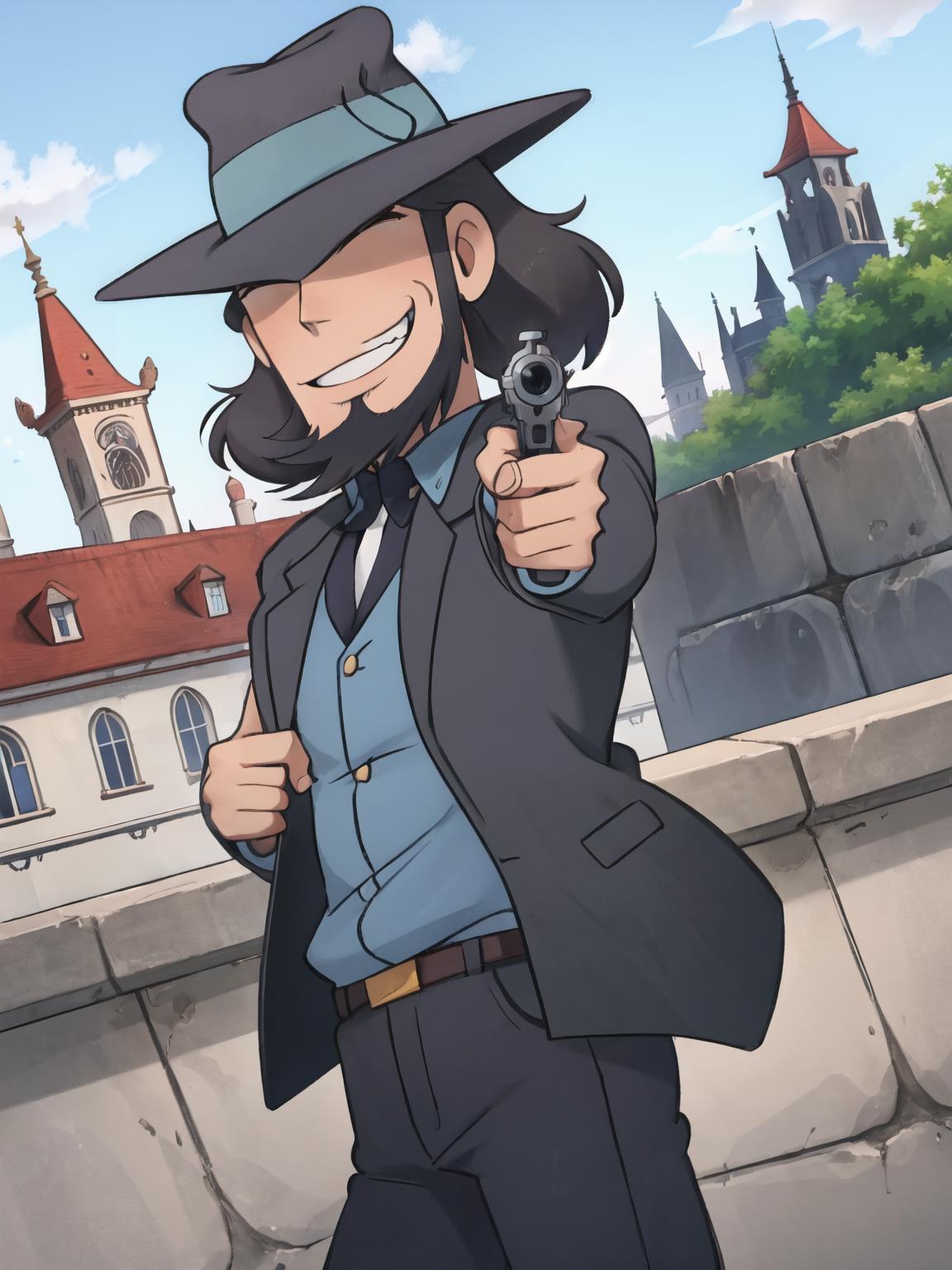 "Jigen" activation, "hat, formal" for outfit. He's apparently mastered shadow cloning ju-jitsu, add "1boy" to curb that
