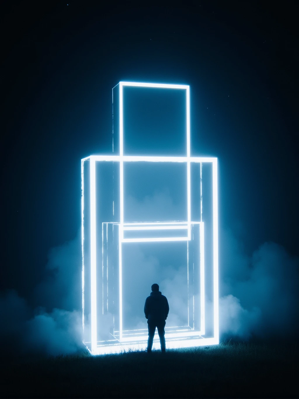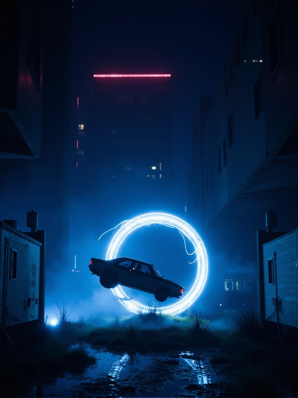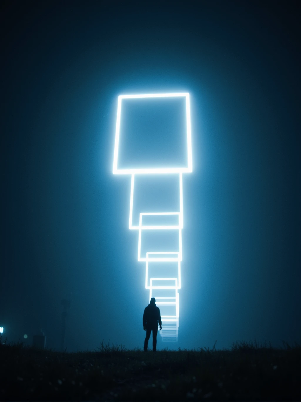 A solitary figure stands atop a camper van, silhouetted against an eerie night sky. 3DFuturistic