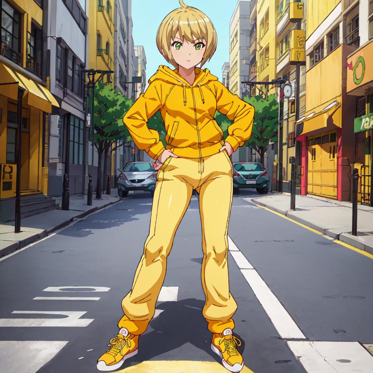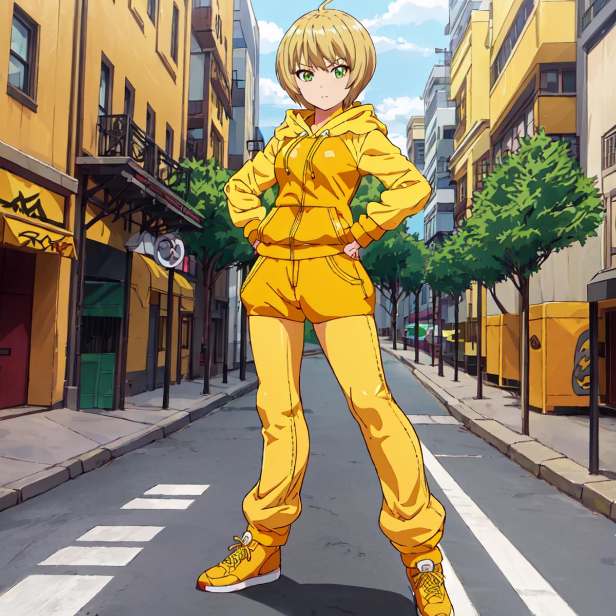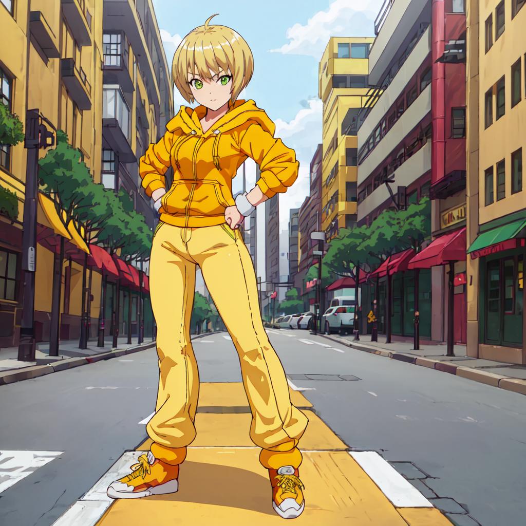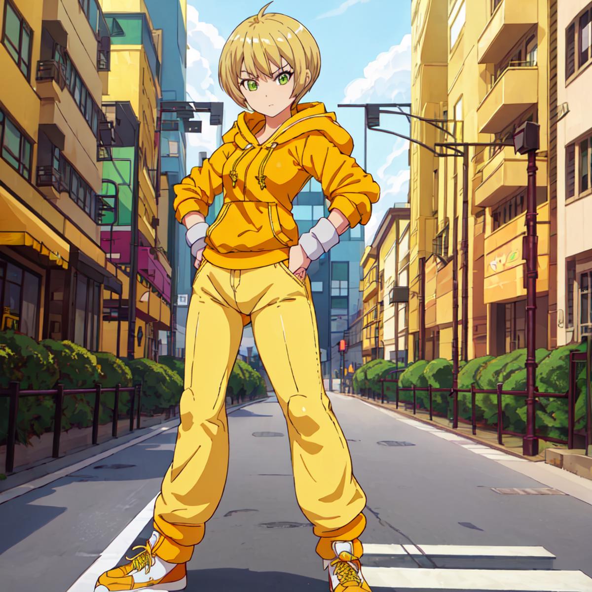 Set 2 : Dragon_Kid, 1girl, solo, short hair, blonde hair, green eyes, yellow jacket, yellow shoes, yellow pants,yellow hoodie, yellow sneakers