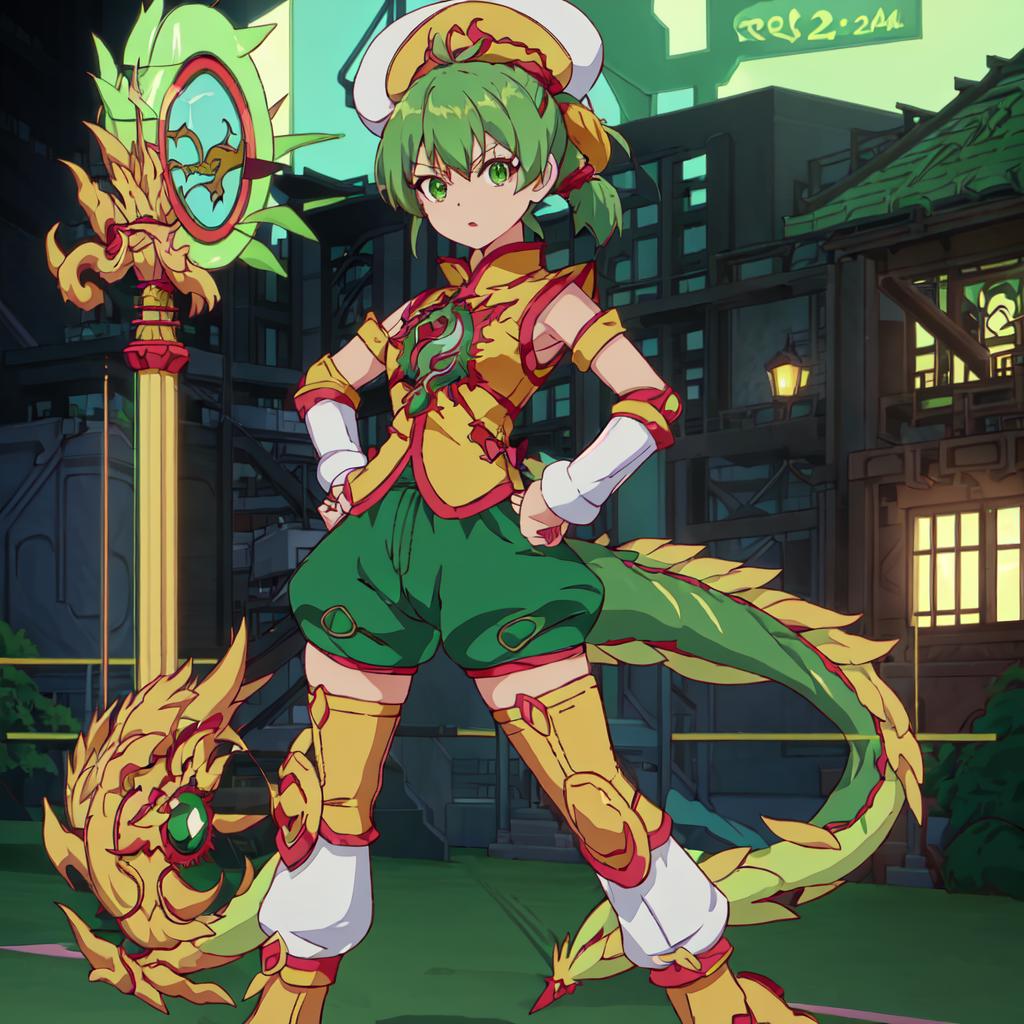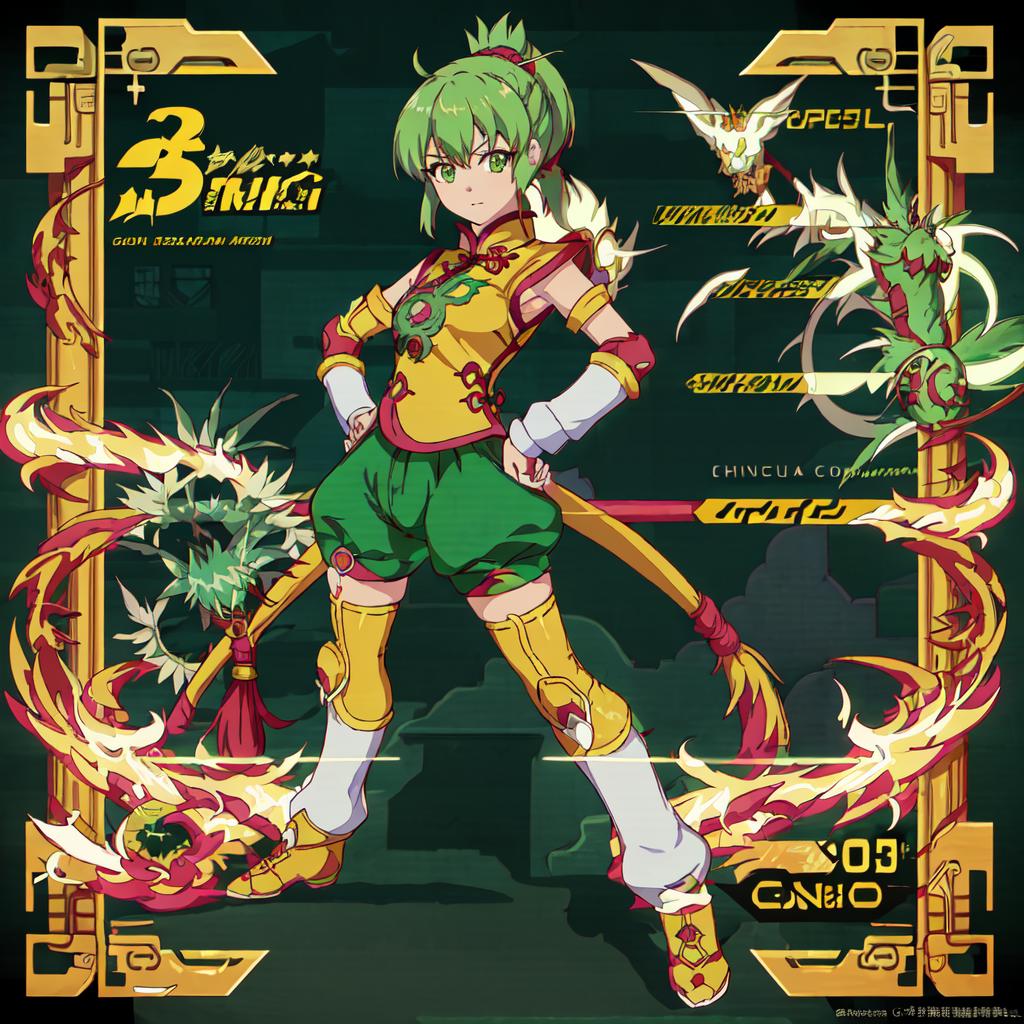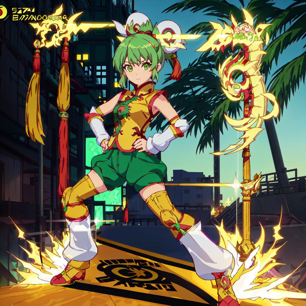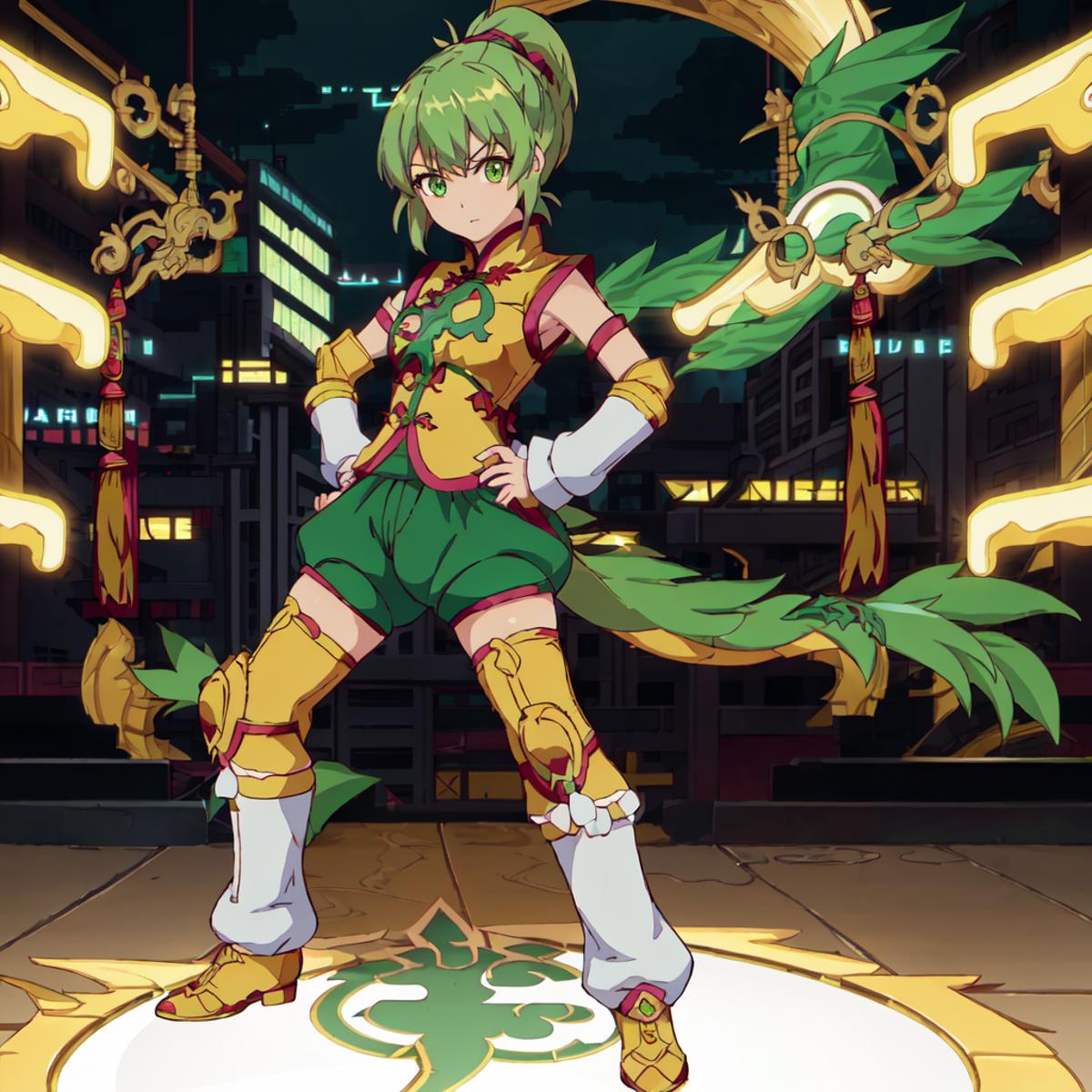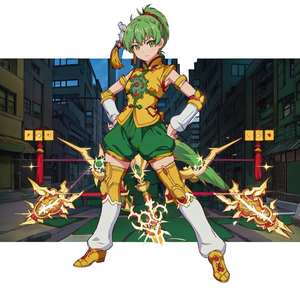 Set 1 : Dragon_Kid, 1girl, solo, short hair, gold thighhighs, green eyes, detached sleeves, green hair, yellow chinese clothes, short ponytail, green shorts, superhero, hat, product placement
