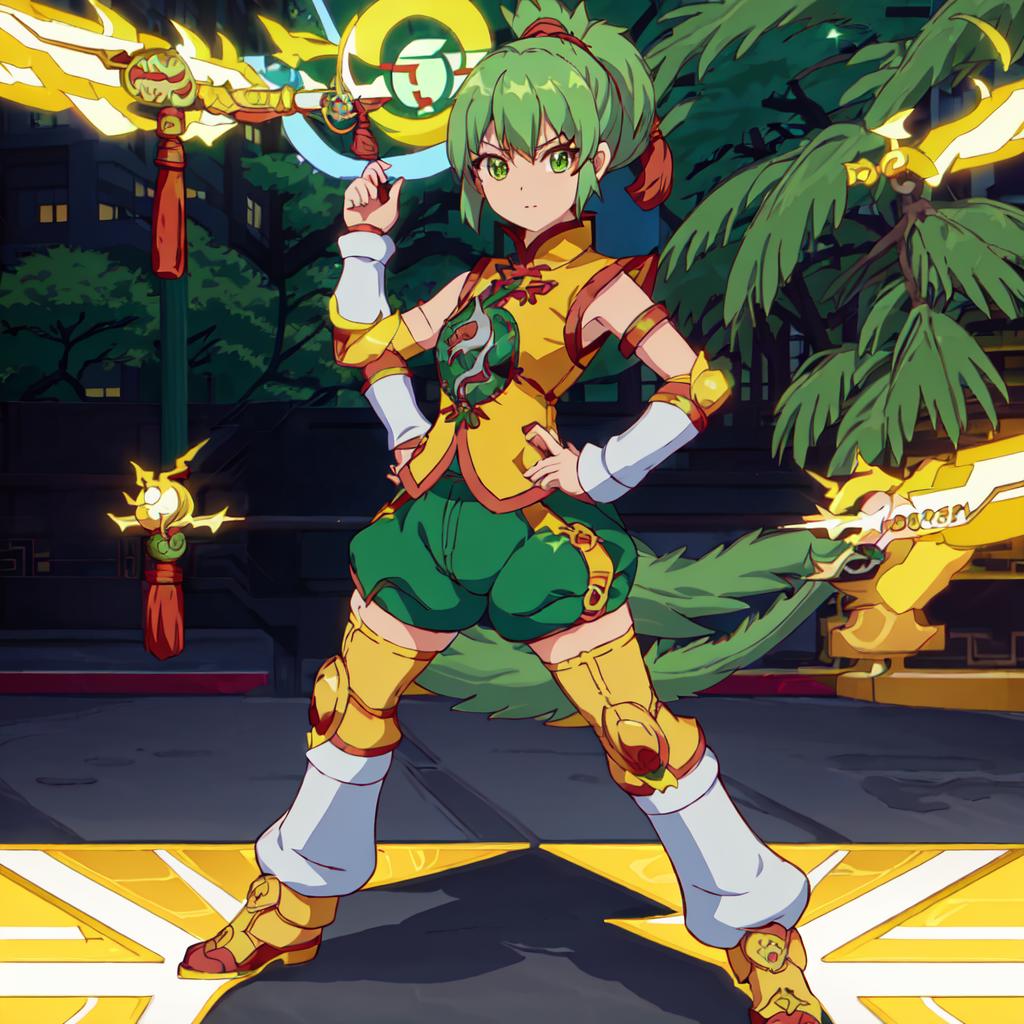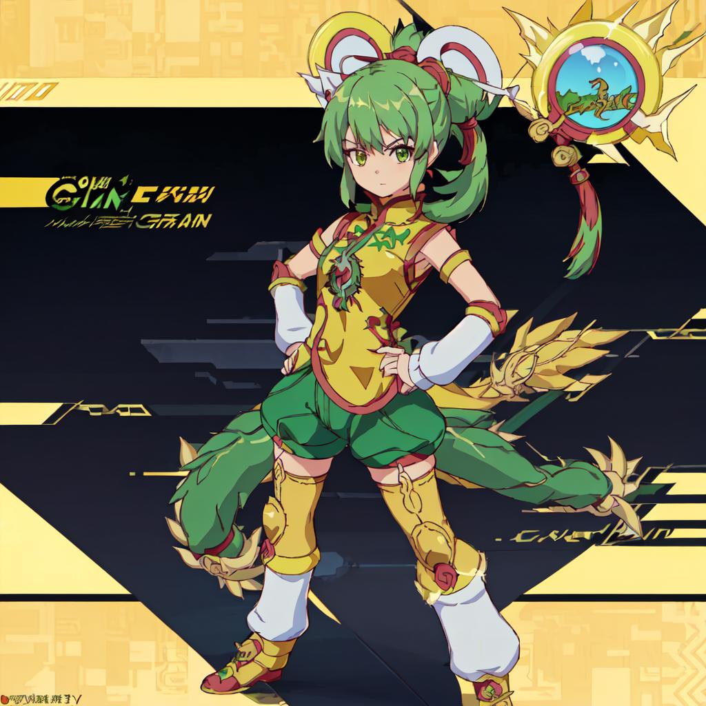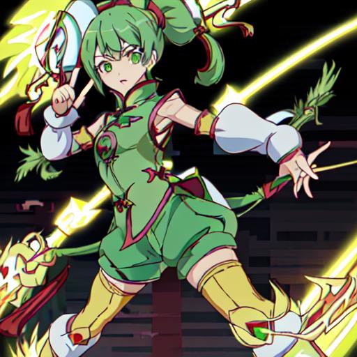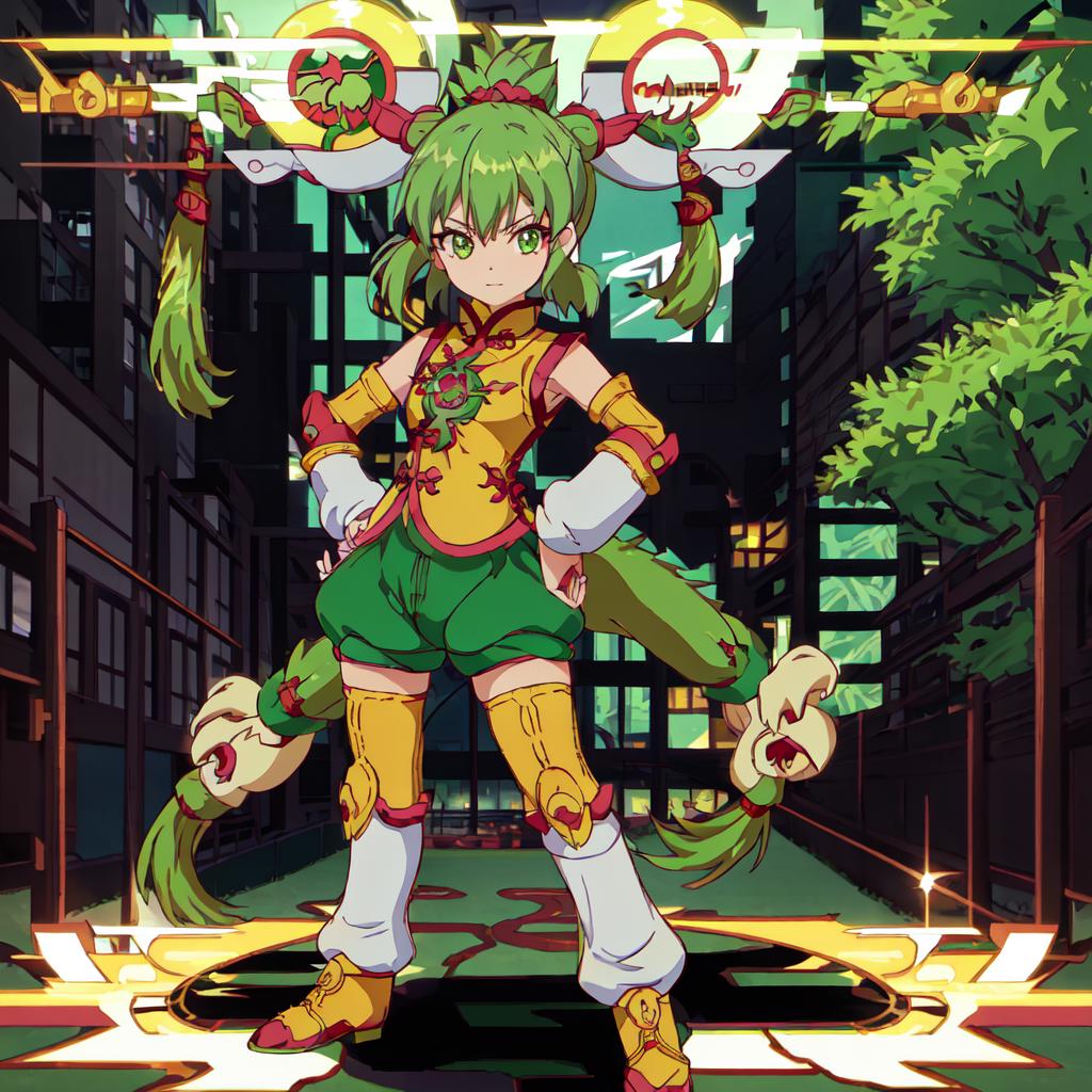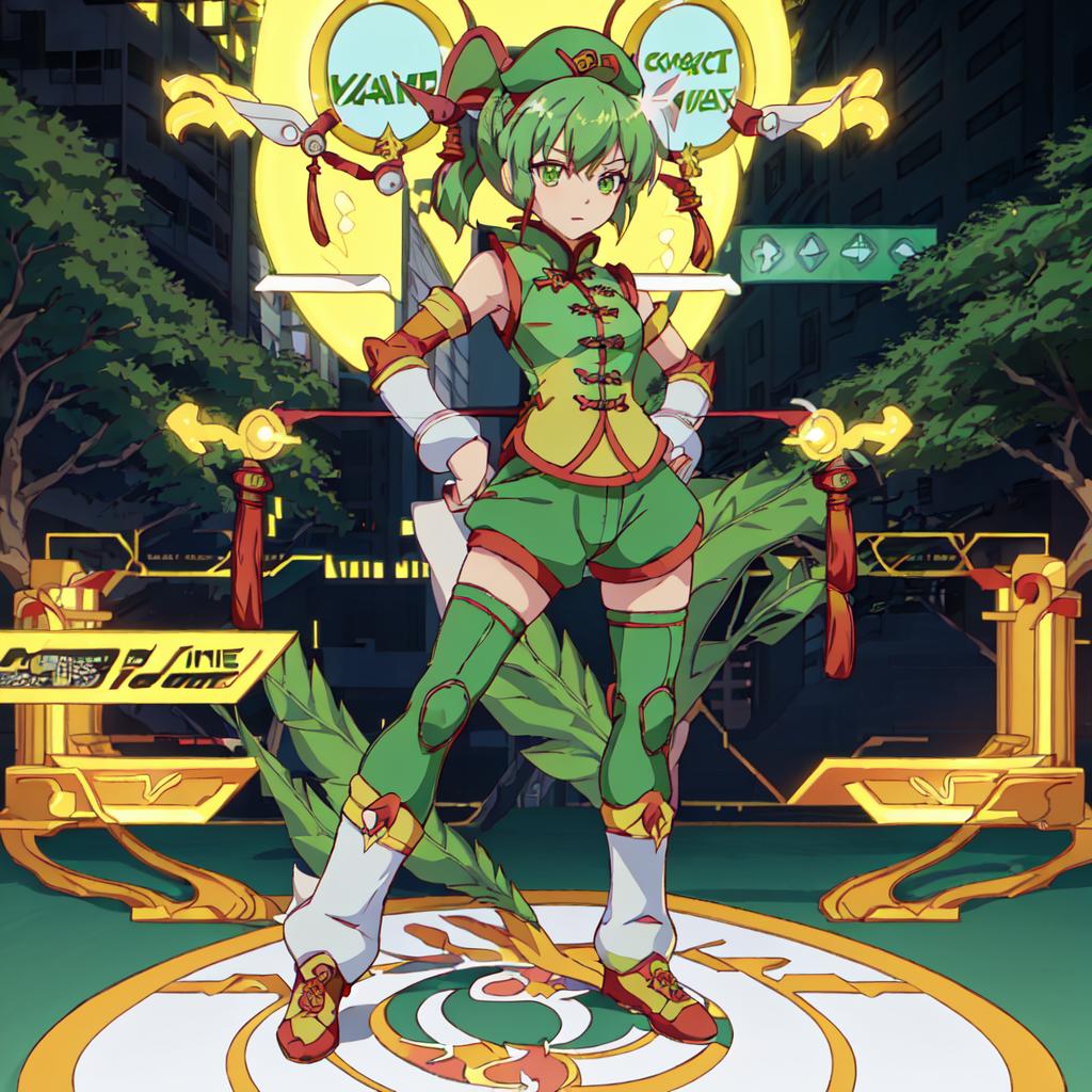Set 1 : Dragon_Kid, 1girl, solo, short hair, gold thighhighs, green eyes, detached sleeves, green hair, yellow chinese clothes, short ponytail, green shorts, superhero, hat, product placement