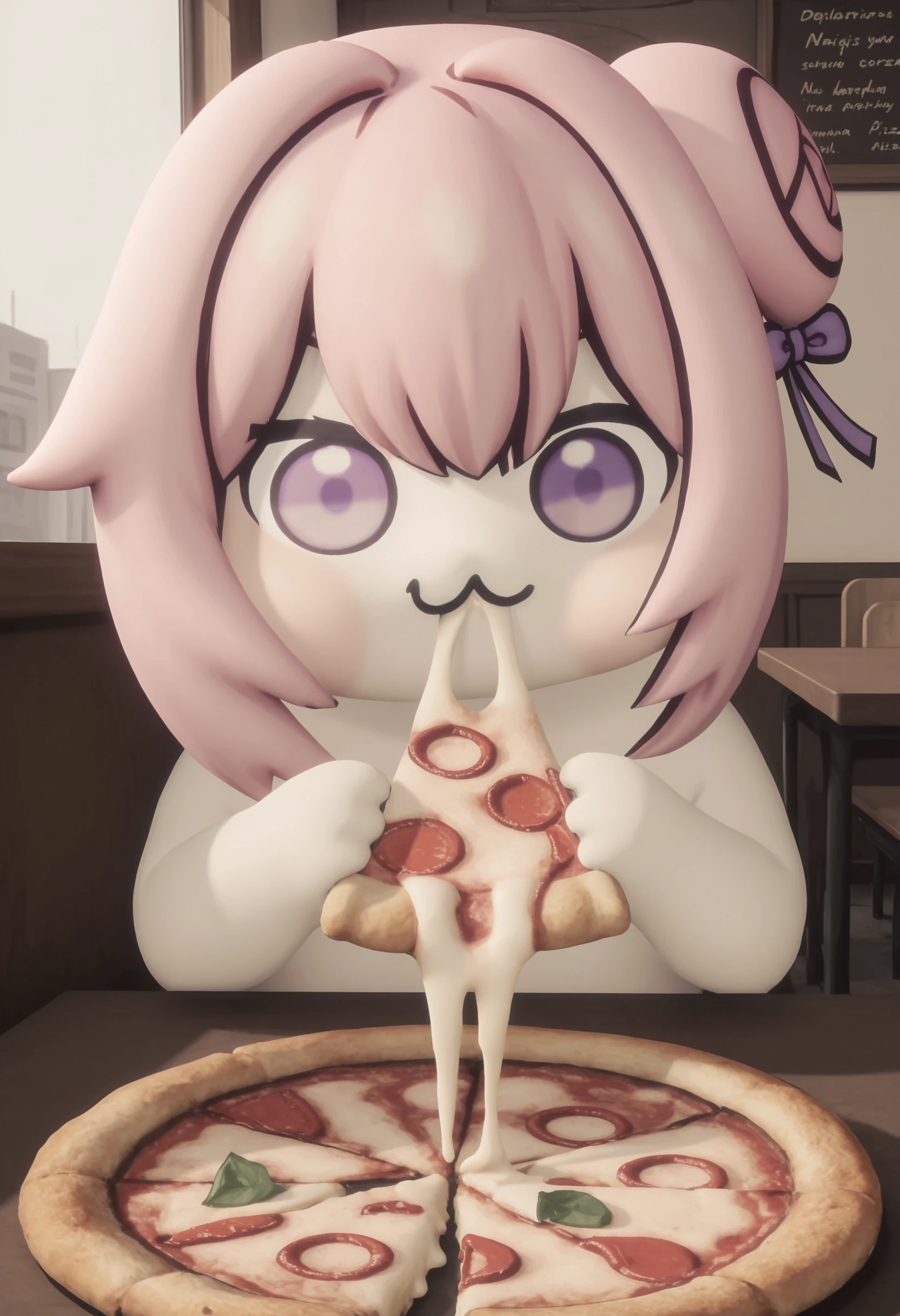 • d0rilf, purple eyes, hair bun, pink hair, bangs, hair bow, :3,
