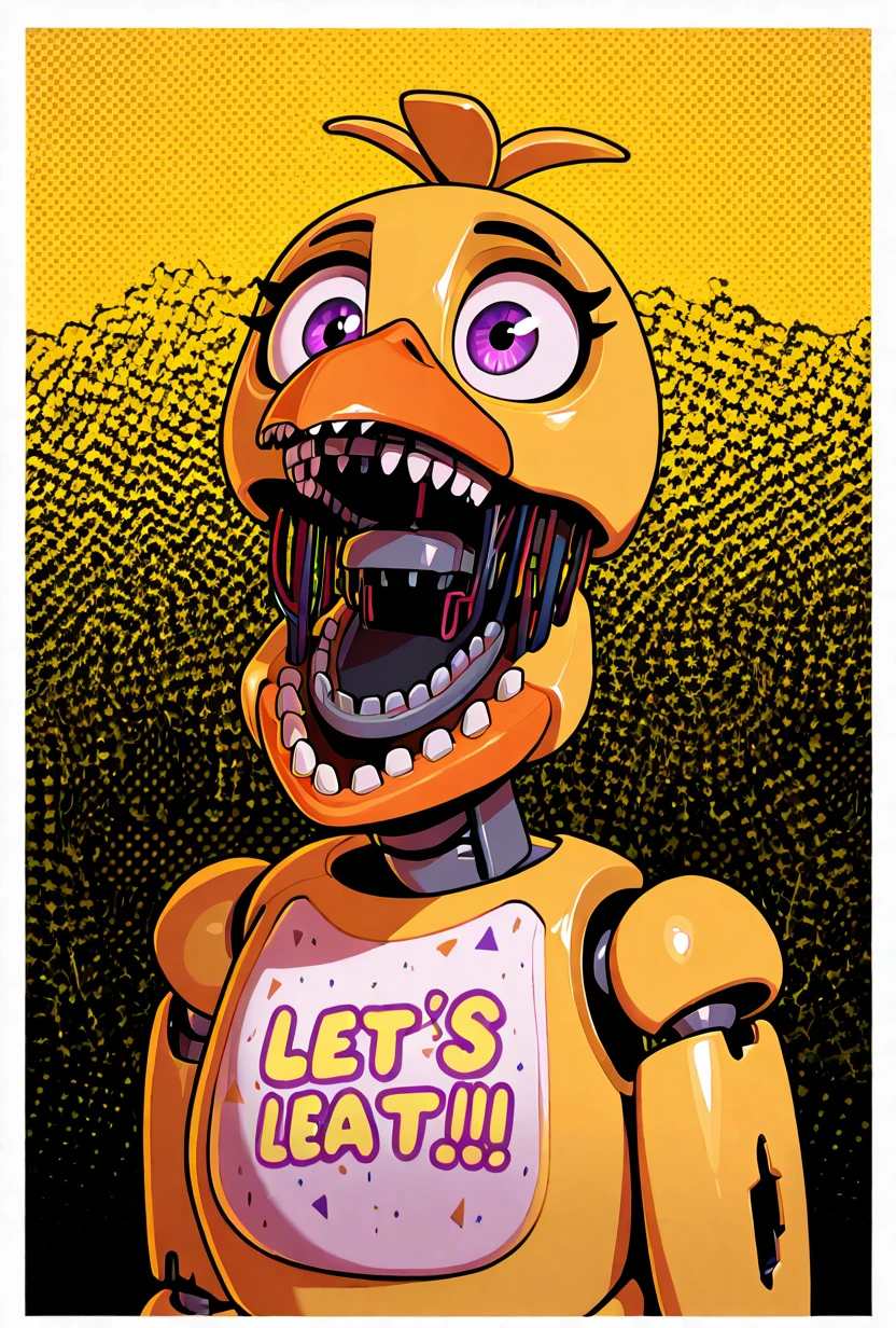 withchica, 1girl, teeth, robot, open mouth, solo, yellow skin, bib , no humans, joints, beak, bird, purple eyes, wires