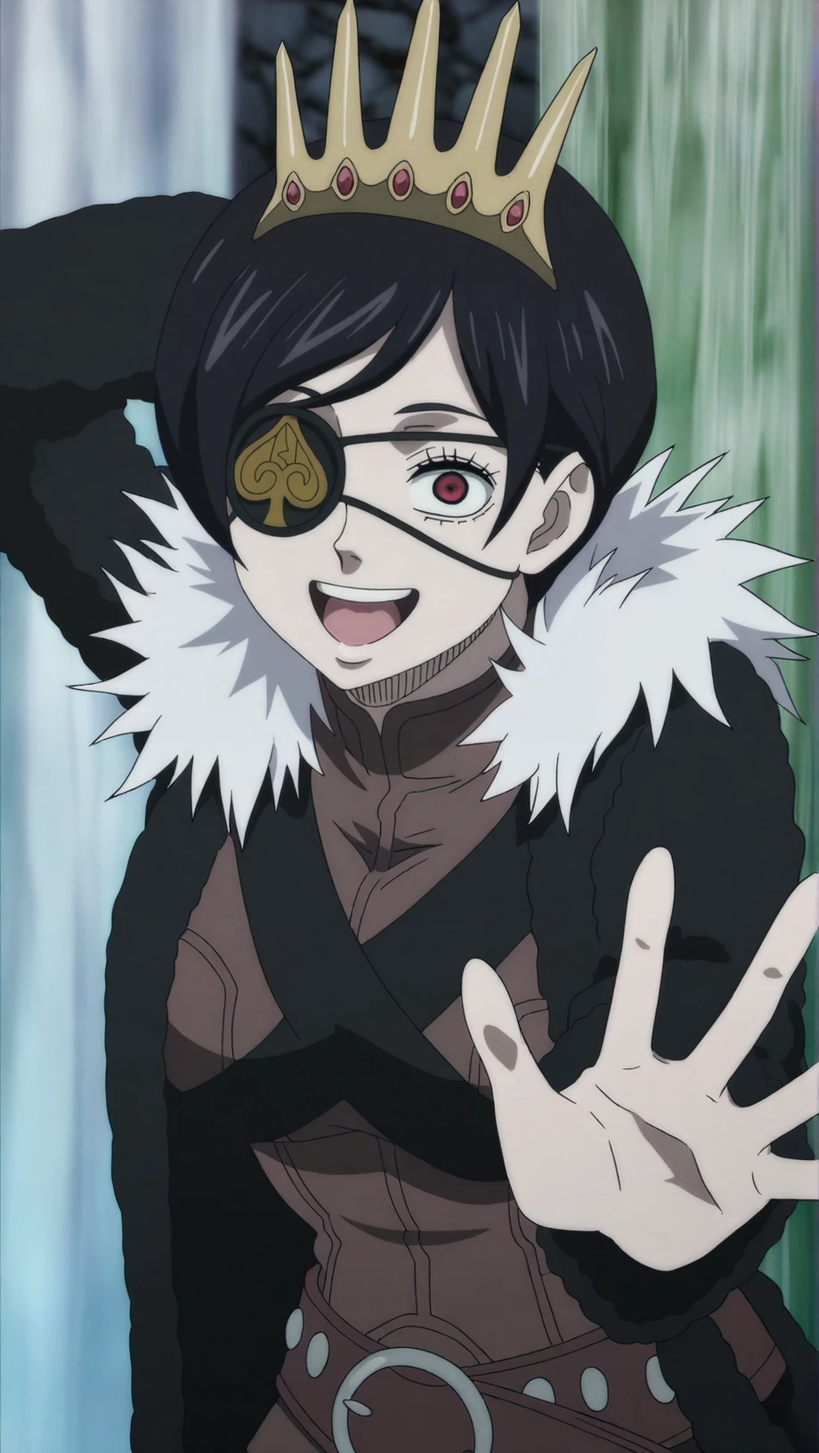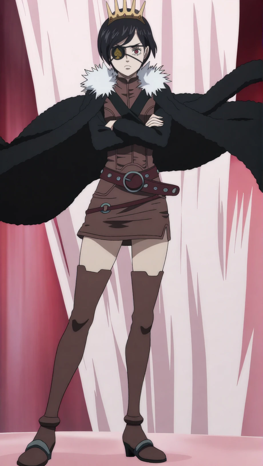 normal outfit, eyepatch, brown top, skirt, brown skirt, thighhighs, long sleeves, dress, jacket, boots, open clothes, belt, high heels, zettai ryouiki, coat, fur trim, thigh boots, facial mark, brown footwear, short dress, eyepatch, crown, belt buckle, brown belt, brown dress, fur-trimmed coat,