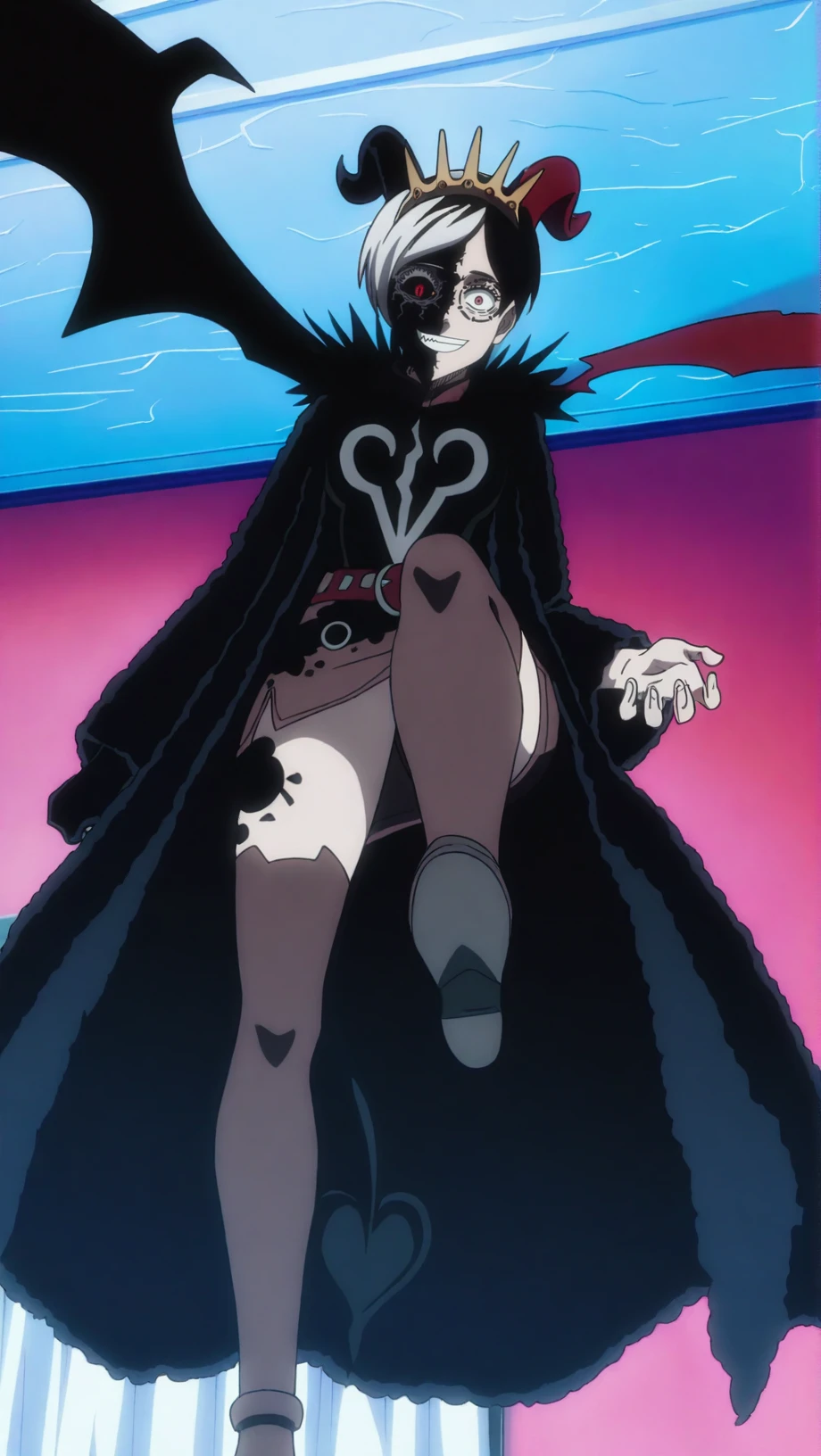 devil form, multicolored hair, black and white hair, white hair, thighhighs, zettai ryouiki, two-tone hair, facial mark, wings, demon wings, demon tail, horns, crown, tiara, black coat,