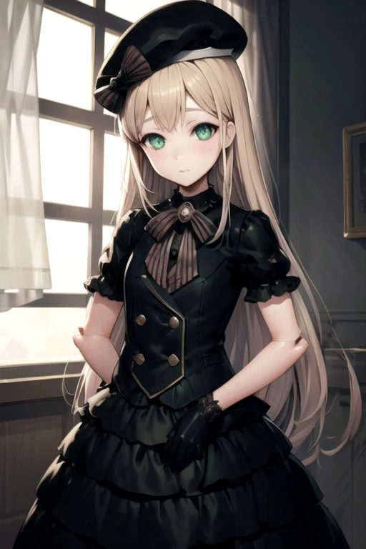 MaryKujou, 1girl, solo, very long hair, skirt, blonde hair, brown hair, black gloves, black dress, bow, green eyes, frills, buttons, beret, lace, doll joints