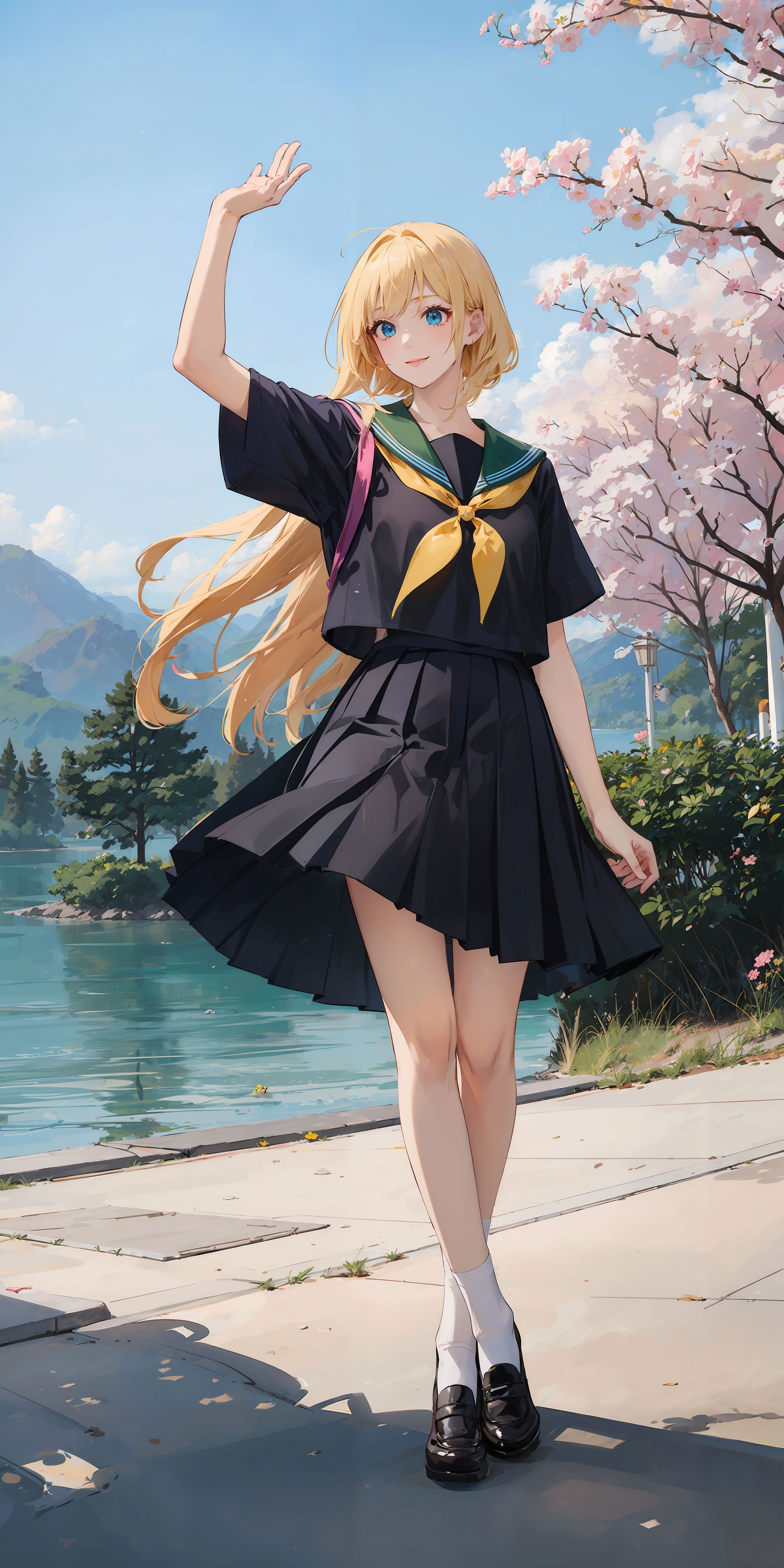 关键词:1girl, long hair, white/black/green/blue/pink/yellow japanese school shirt, white/black/green/blue/pink/yellow sailor collar, white/black/green/blue/pink/yellow neckerchief, long/short sleeves, white/black/green/blue/pink/yellow skirt, socks, black shoes