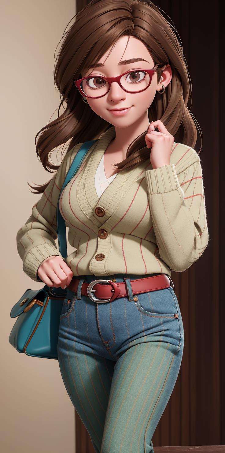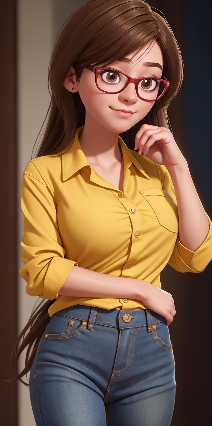Golden brown hair, (brown eyes:1.2), red rimmed glasses, outdoors, ocean, sand, (yellow shirt with leaf patterns), <lora:Rileys_Mom:1>, (chubby face:1), good eyes, (pinkish skin:1.2), mature body, pigtail, tall, detailed eyes, mature woman, closed mouth, jeans, short hair, looking at viewer, smile, girlfriend hair, teeth,