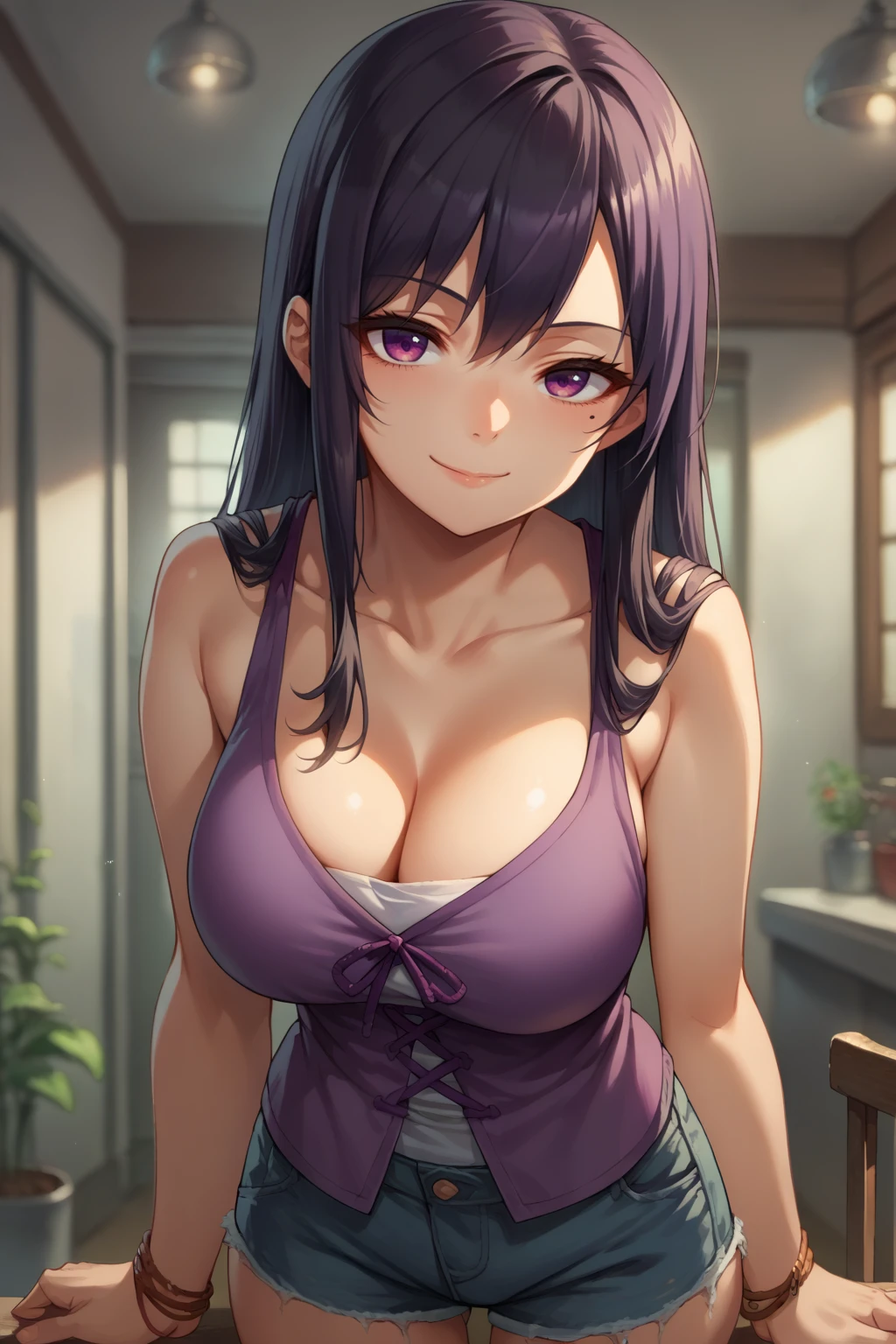 Outfit : purple cross-laced vest, grey undershirt, midriff, sleeveless, cleavage, denim shorts, bracelet