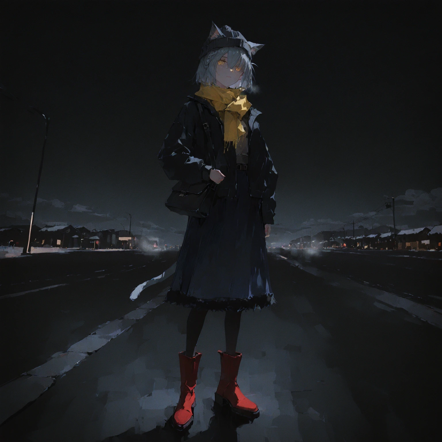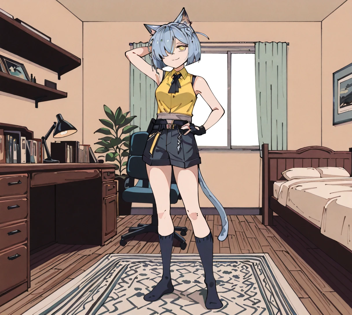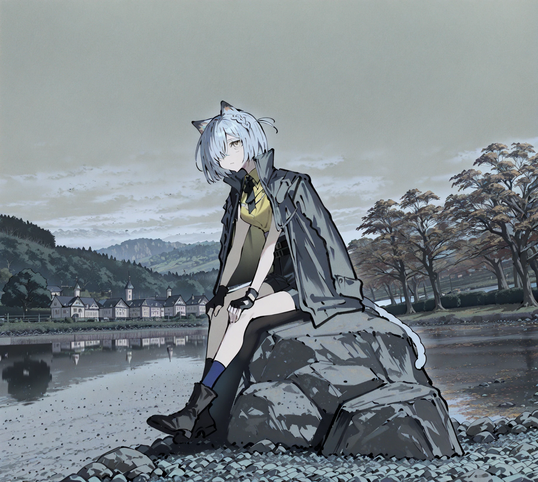 delphine, grey hair, short hair, hair over one eye, braid, cat ears, yellow eyes, cat tail,