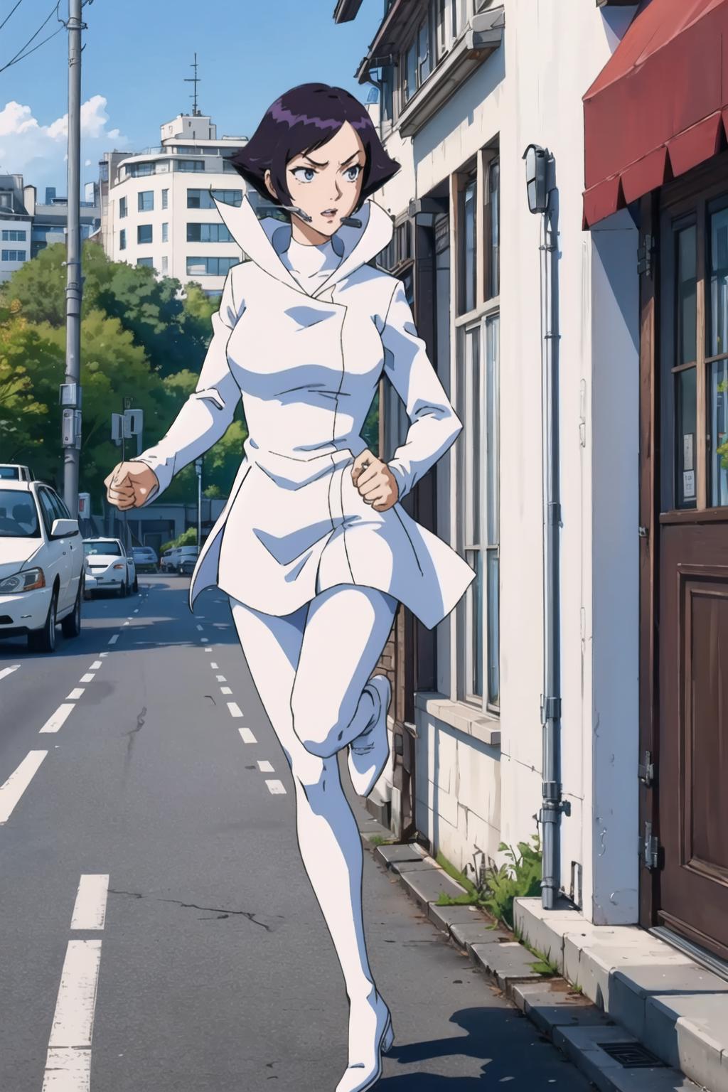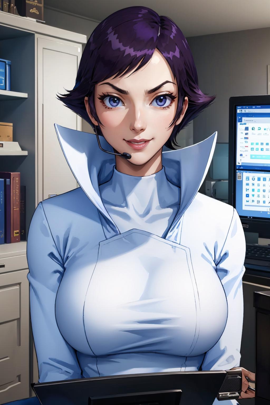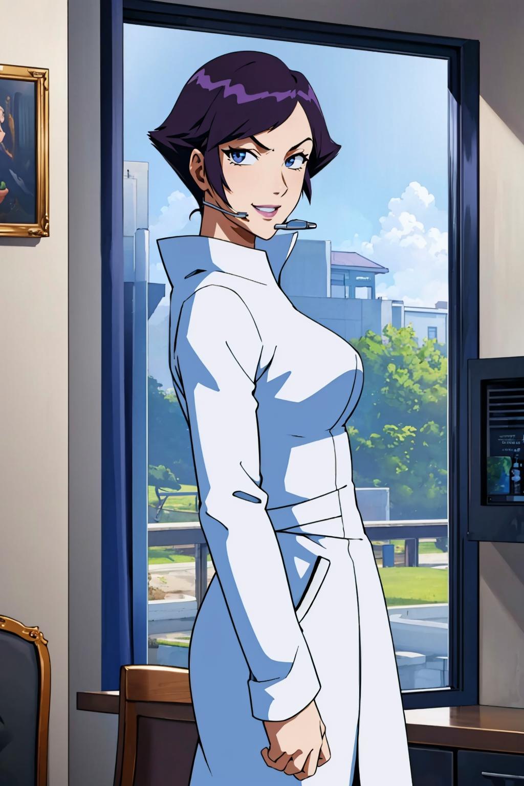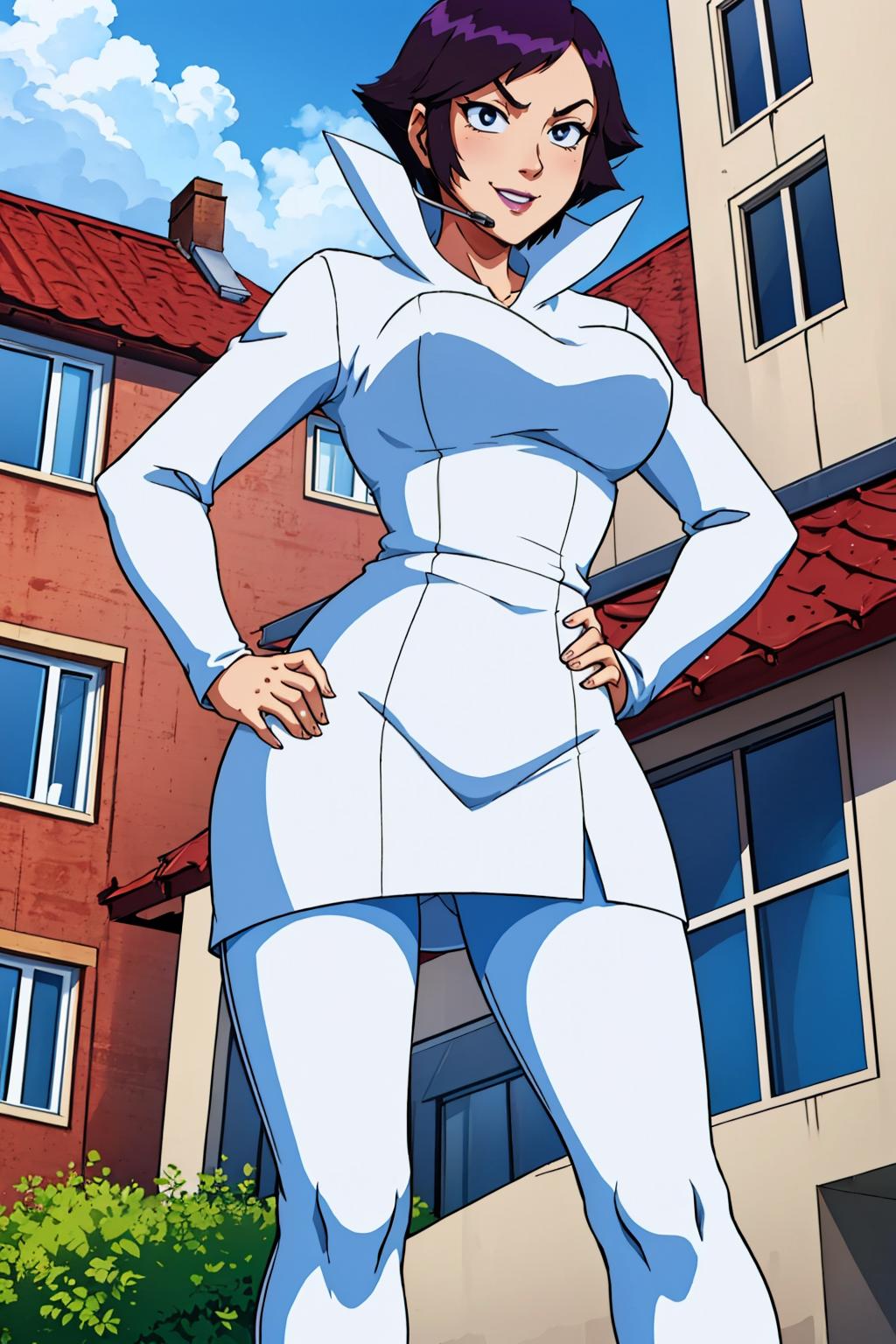 Add "white coat, headset, white pantyhose, white boots" for her typical look.