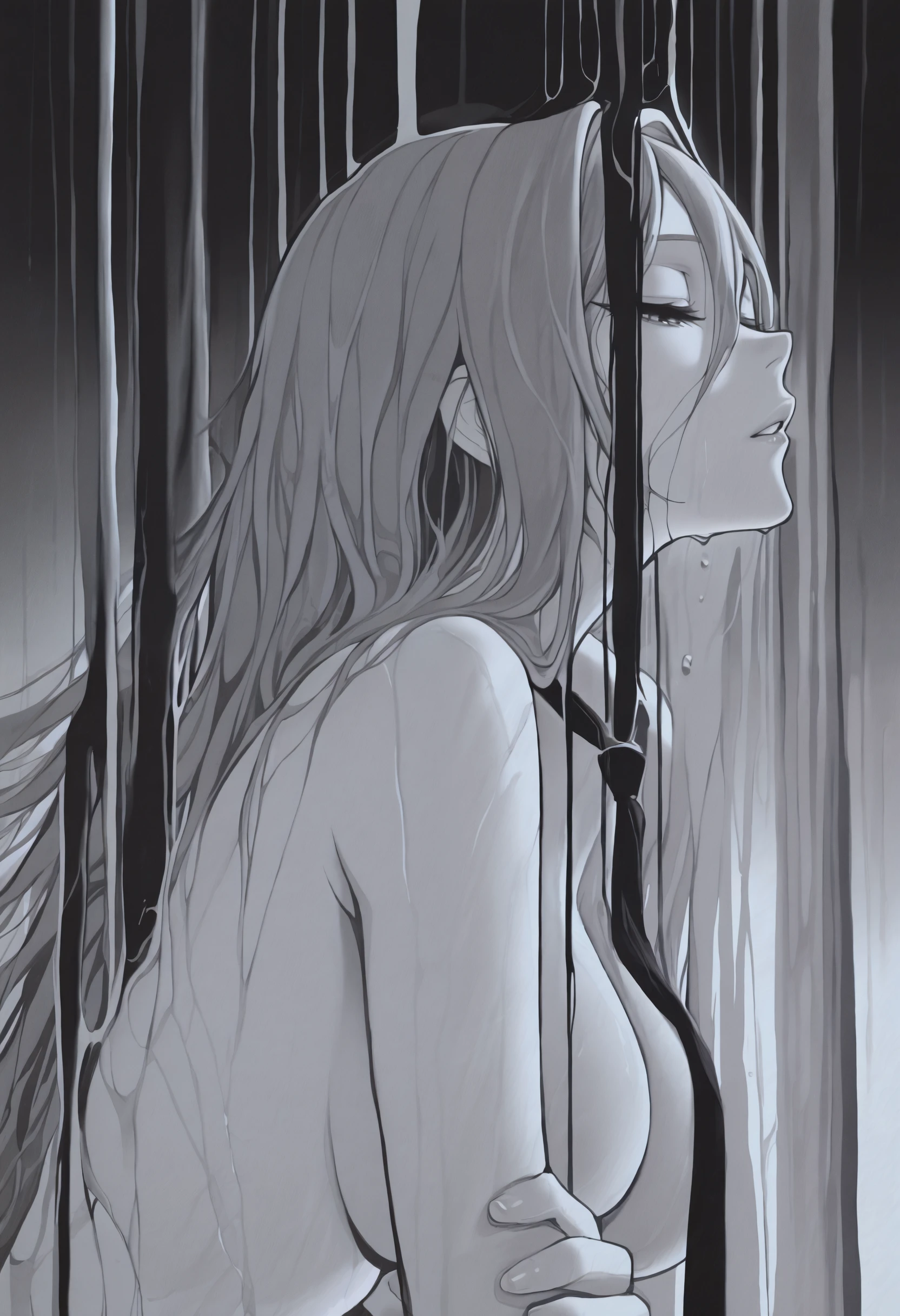 1girl, solo, liquid, surreal, sketch, profile, abstract, no lineart