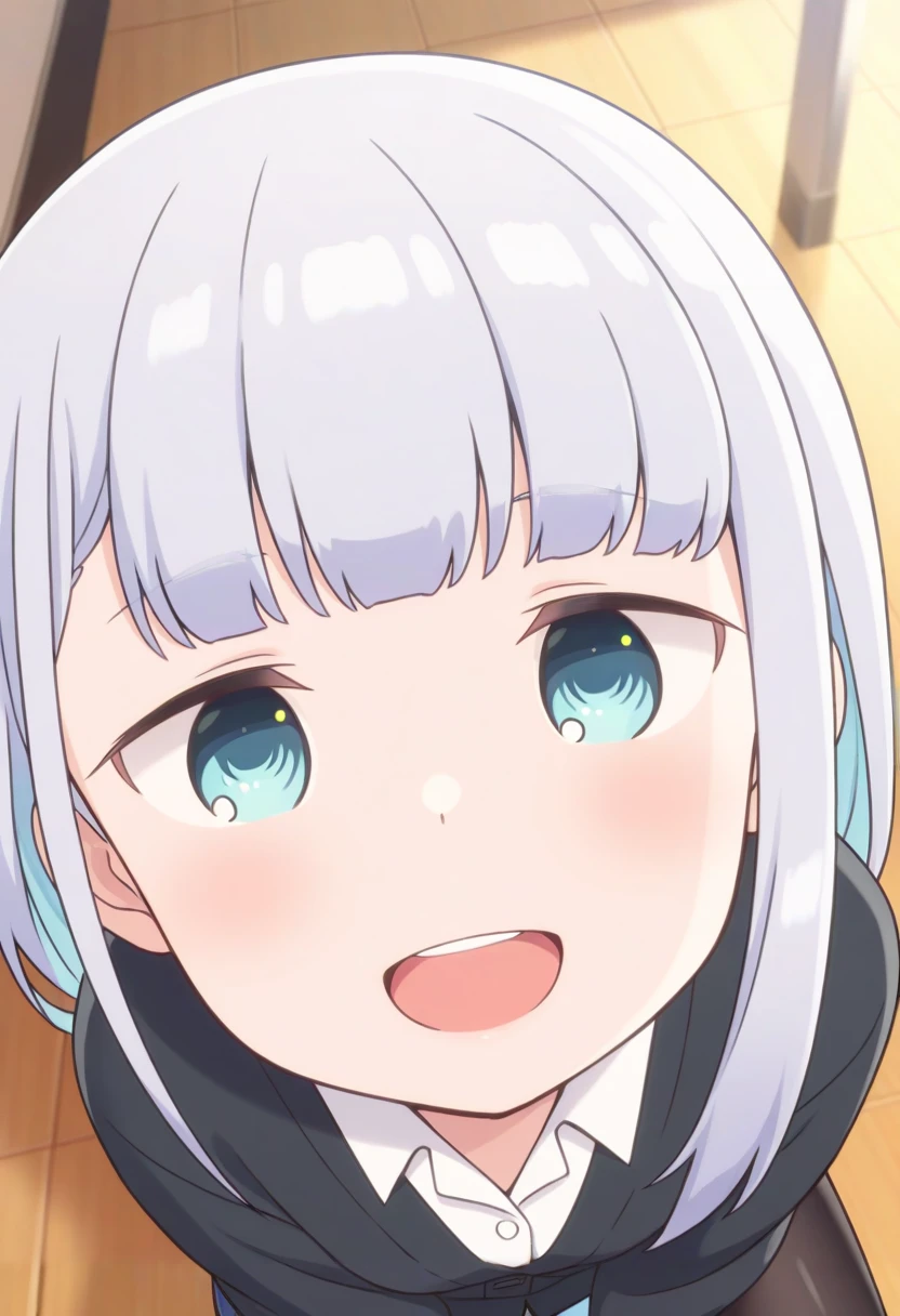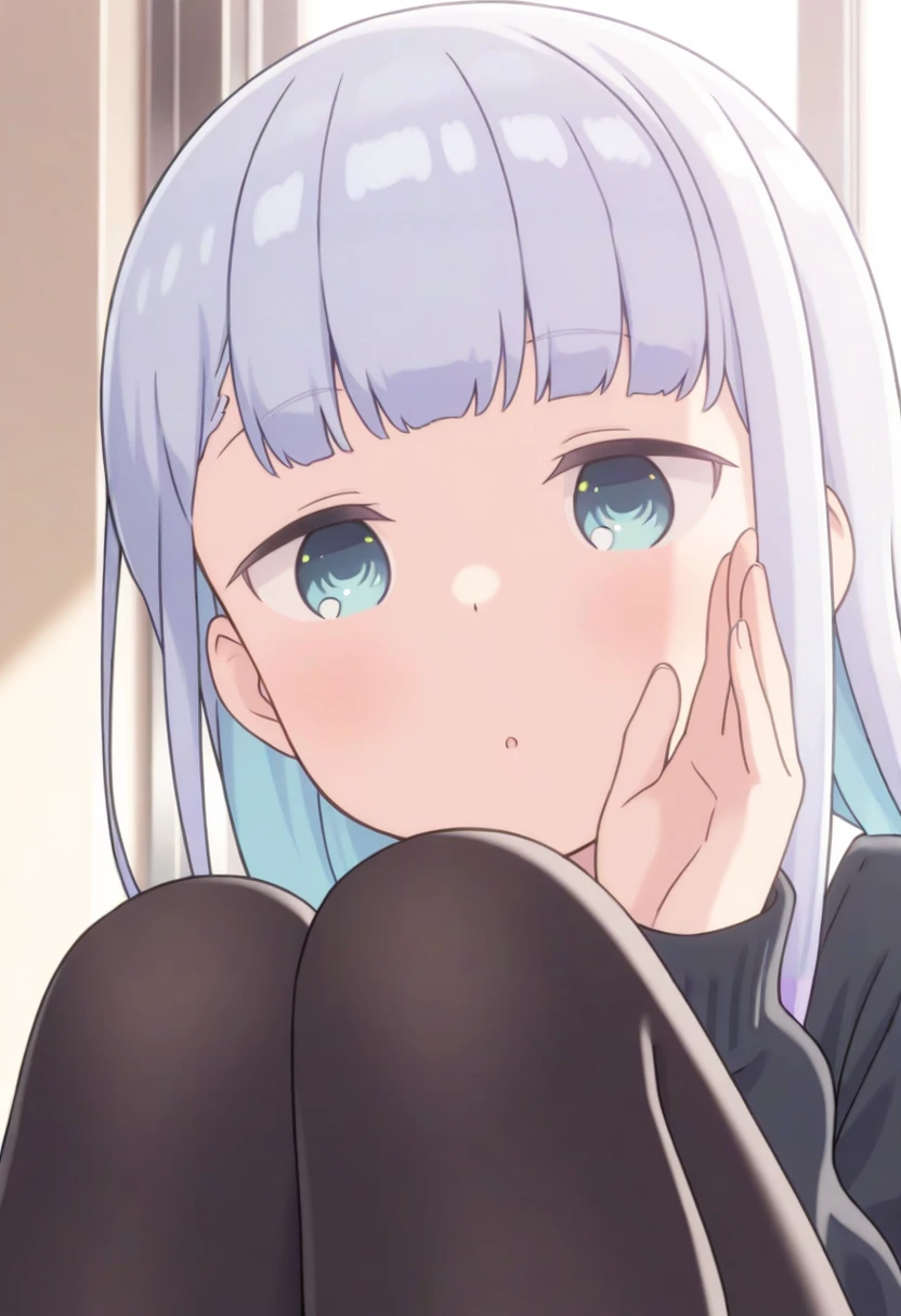 outfit1: grey hair, blue hair, multicolored hair, blunt bangs, long hair, blue eyes, school uniform, white shirt, cardigan, long sleeves, black pantyhose,