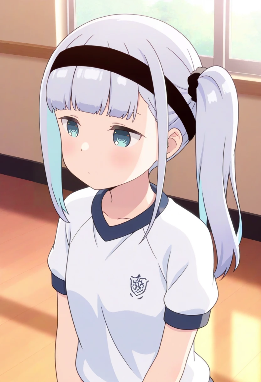 outfit2:grey hair, blue hair, multicolored hair, blunt bangs, long hair,side ponytail, blue eyes, school gym uniform,