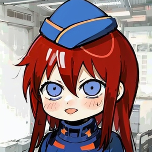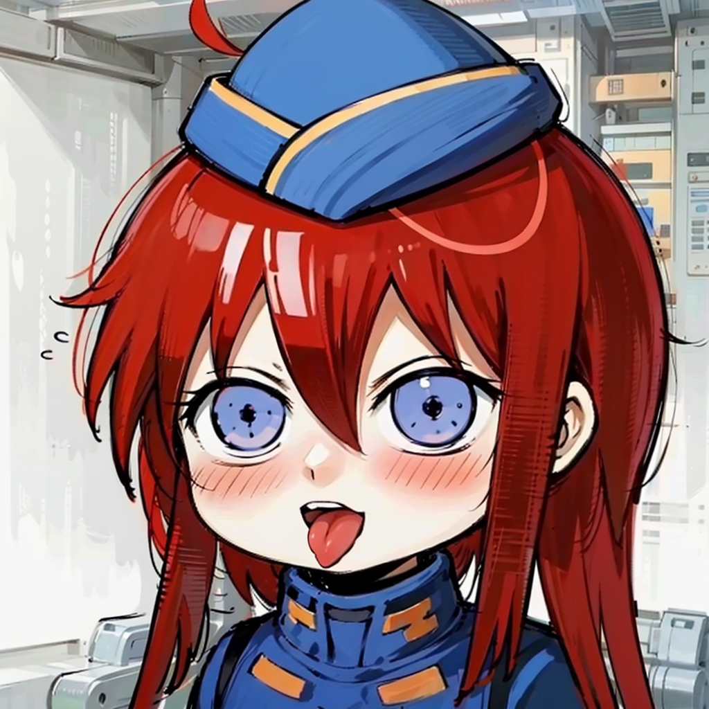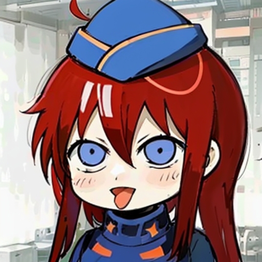 huangyuzhongSB, chibi, meme, parody, ahegao, rolling eyes, looking up, (tongue out:1.3), blush, red hair, blue eyes, open mouth, long hair, blue headwear, military hat, military uniform,