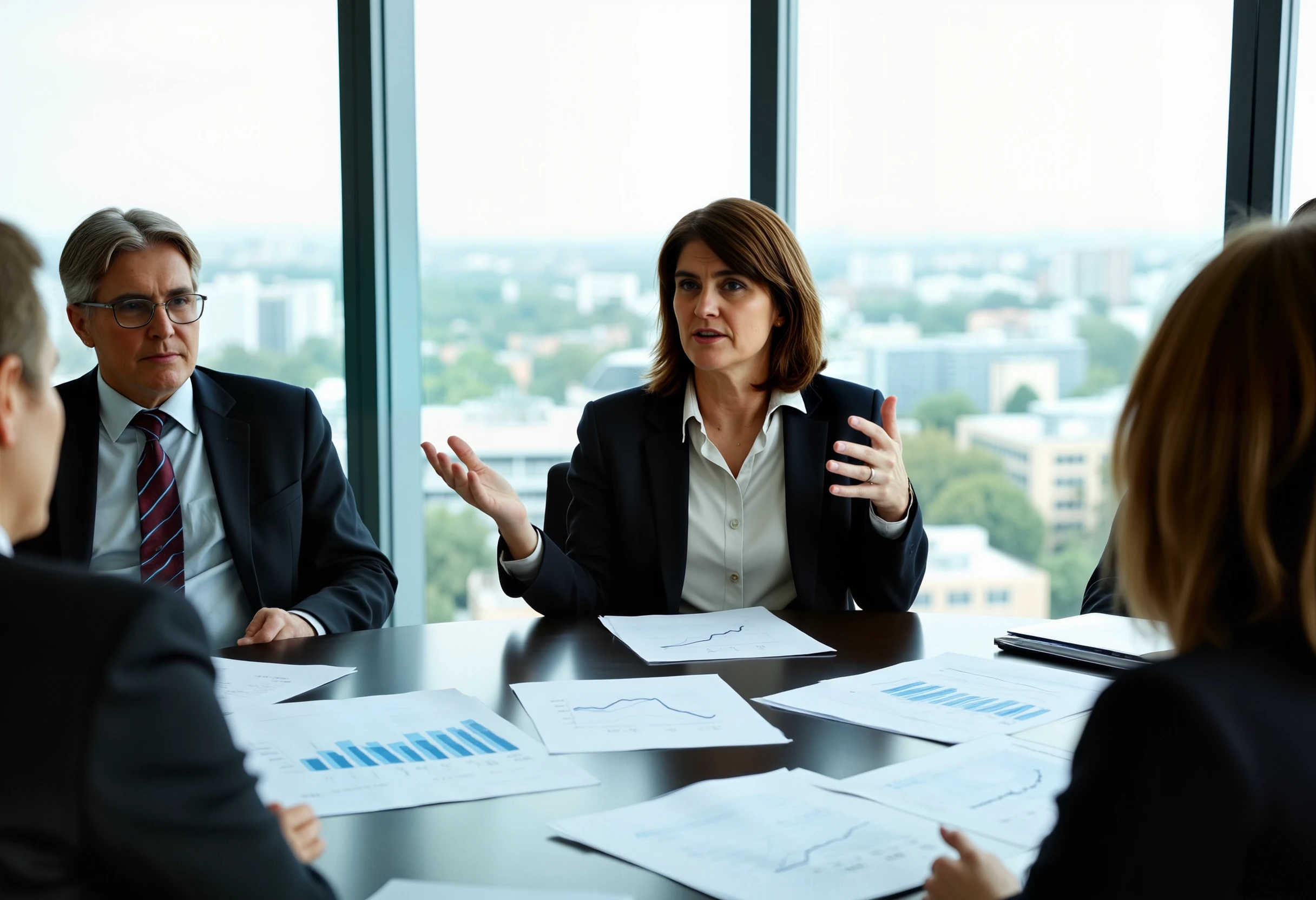 "A professional woman with shoulder-length brunette hair, seated at a desk, hands resting on financial reports, in a modern office setting. mbul"