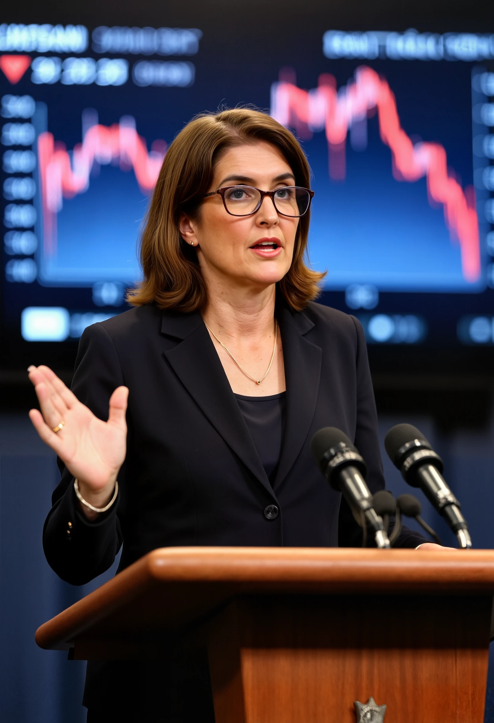 "A woman with shoulder-length brunette hair, wearing a dark blazer, gesturing confidently at a podium with microphones, a financial chart in the background. mbul"