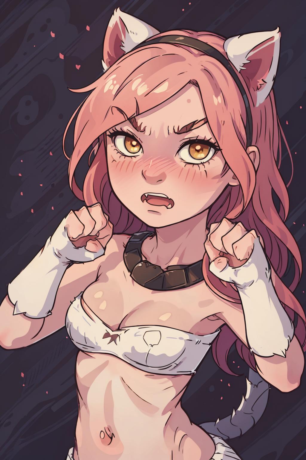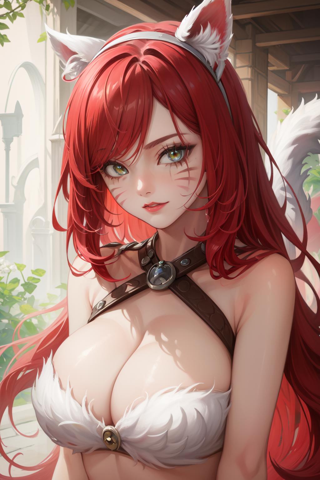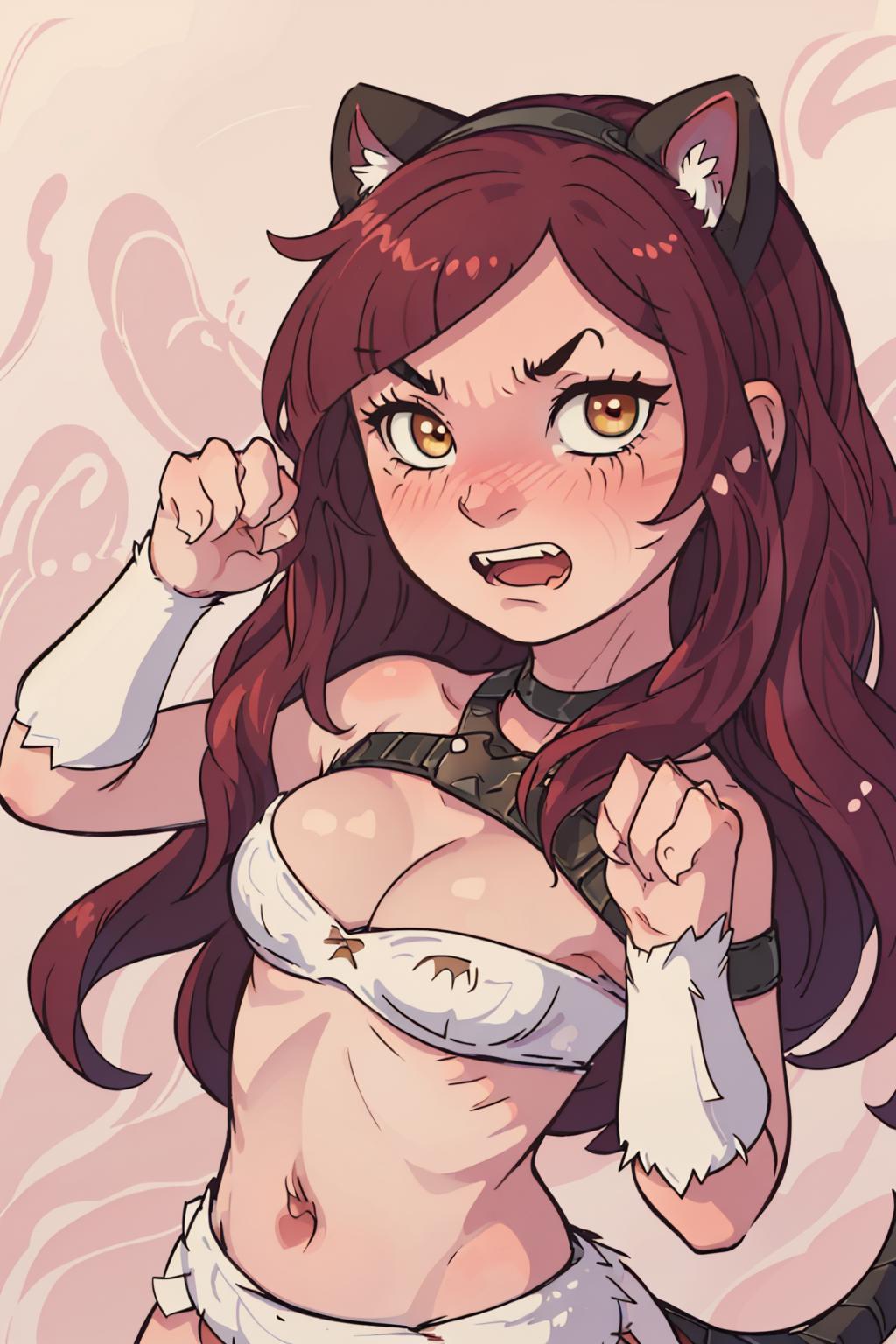 tags: kitty cat katarina, 1girl, fur trim, strapless bra, cleavage, red hair