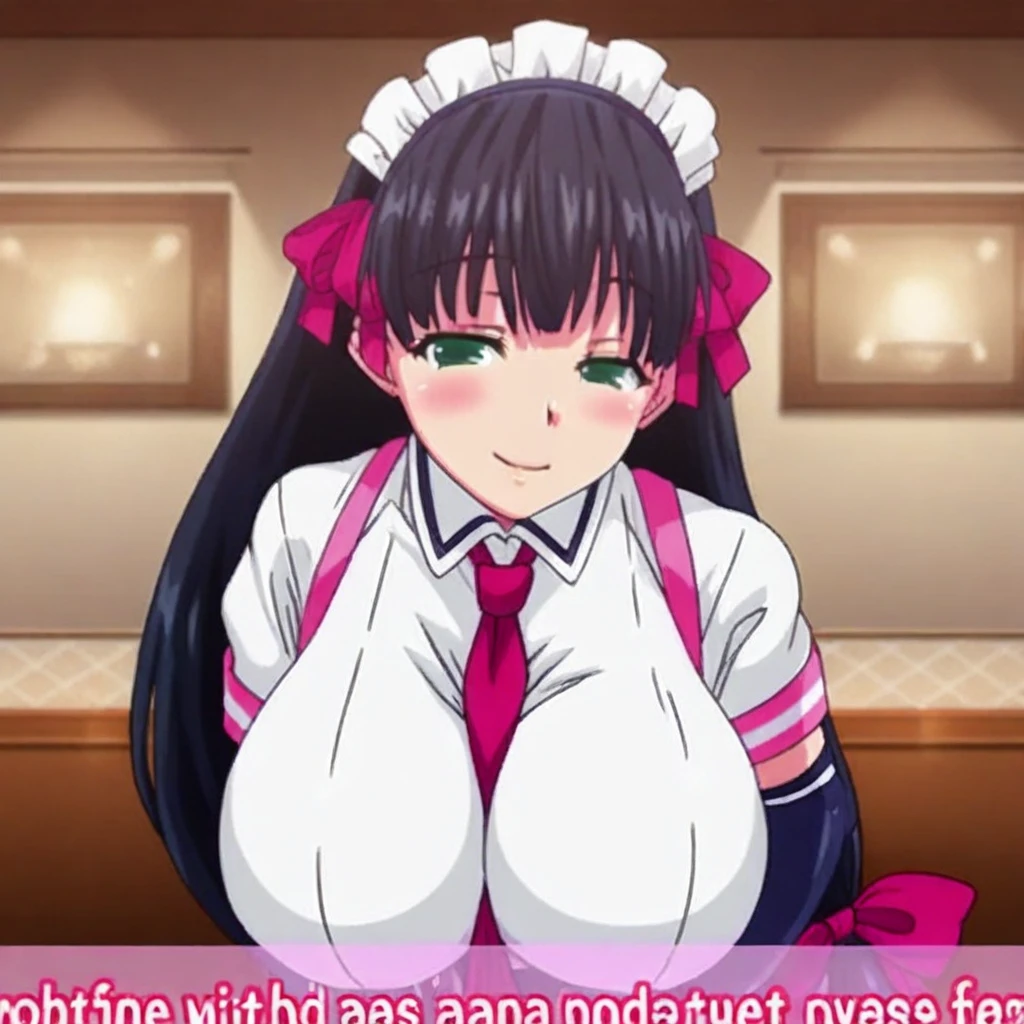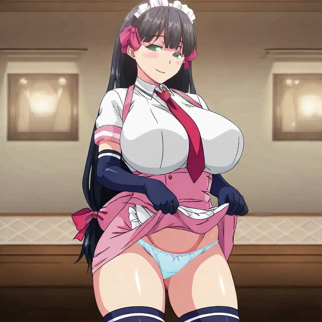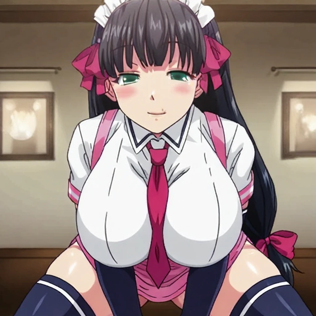 1girl,akiha_(mayoiga_no_onee_san), green_eyes, hot body thick thighs wide hips slender waist very endowed, blessed with very big breasts, voluptuous body, very long_hair, black_hair, huge_breasts ribbons in hair