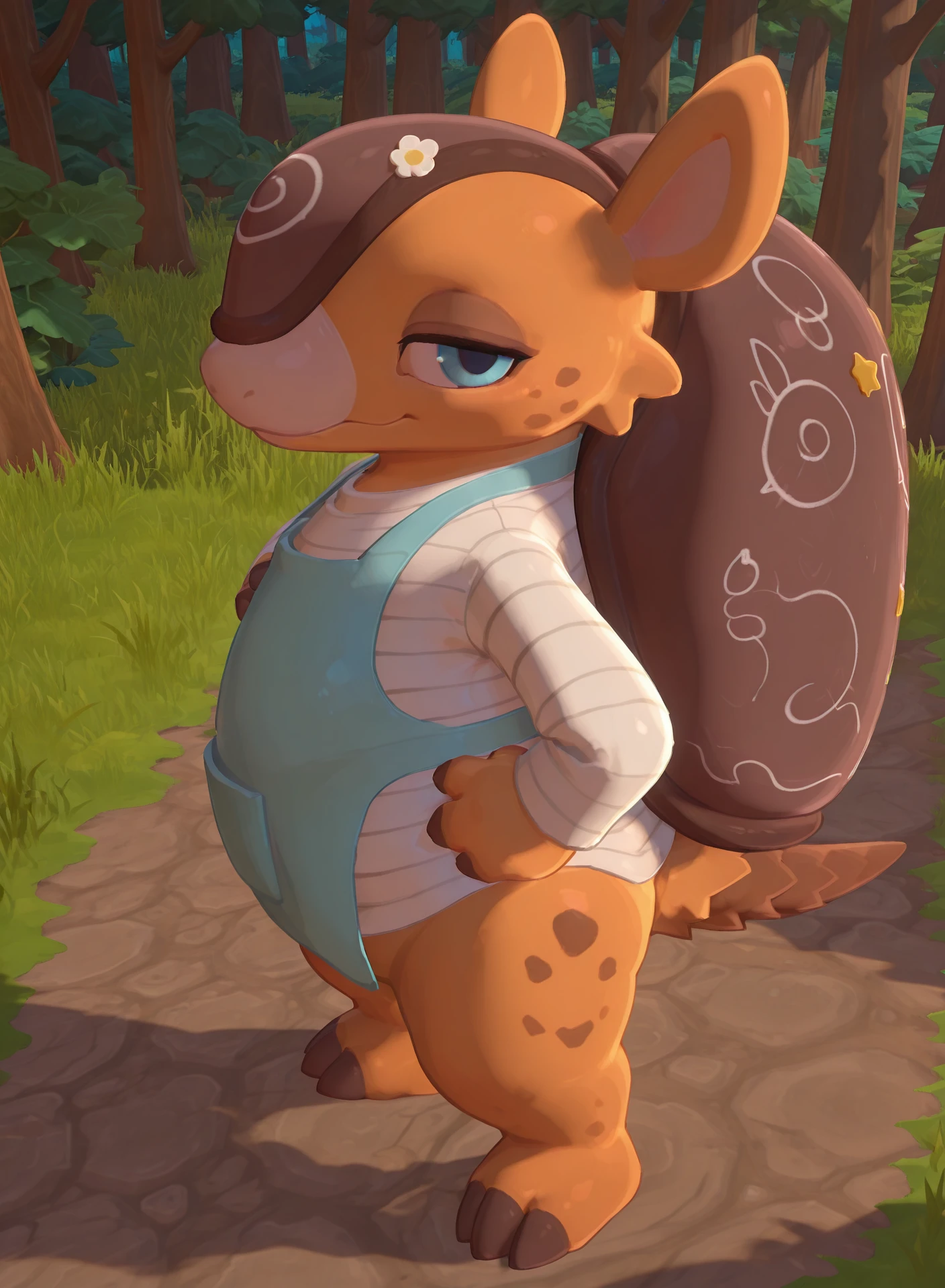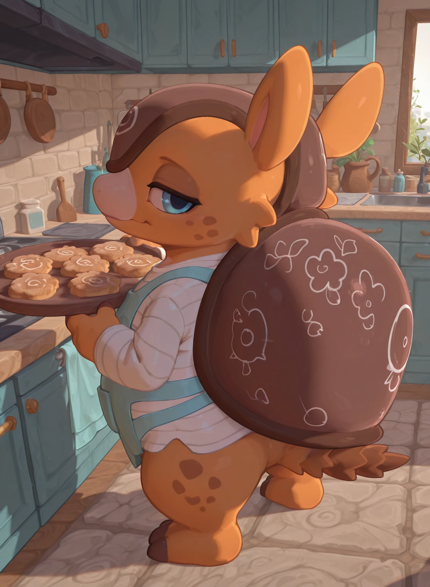 orla, female, Glyptodon, orange skin, blue eyes, 4 fingers, 3 toes, white shirt, blue apron, brown shell on the back