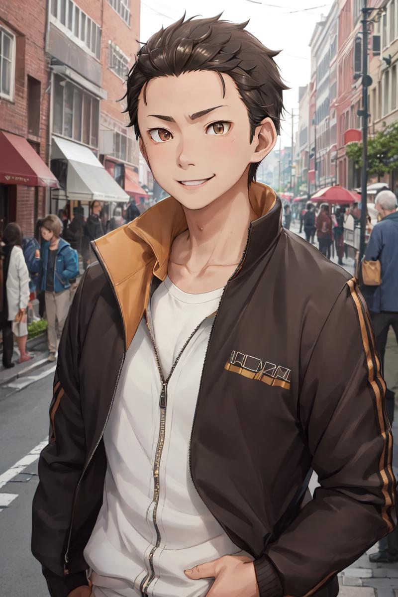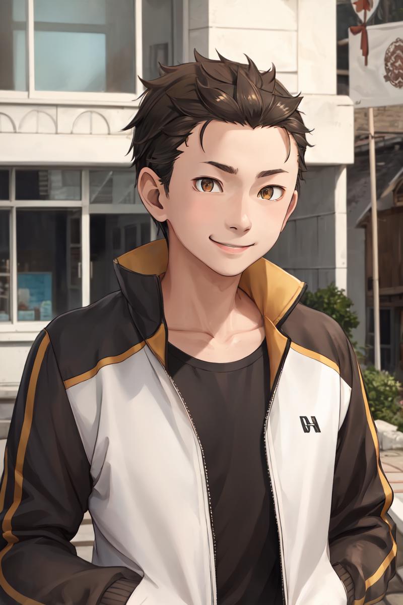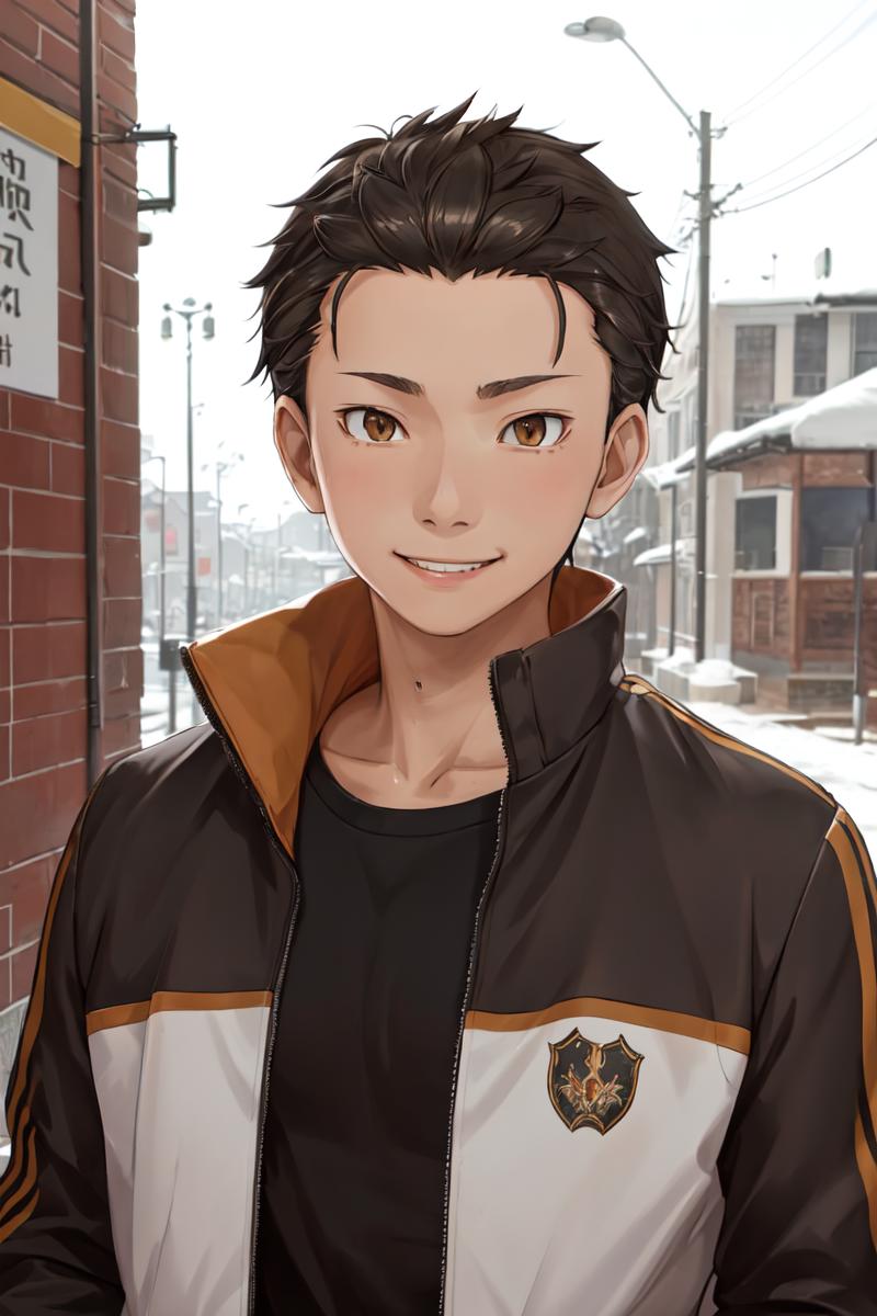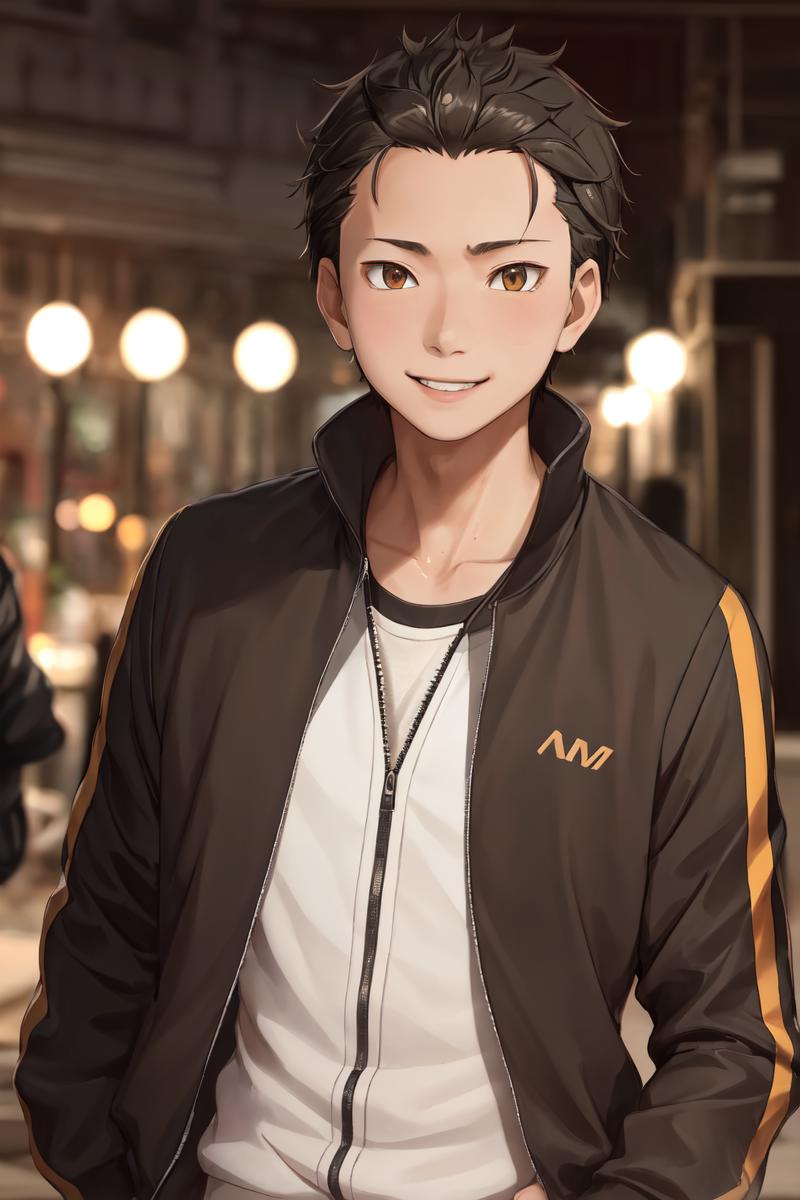 For better appearance add "brown eyes, jacket, black hair, smile, track jacket, hair slicked back"
