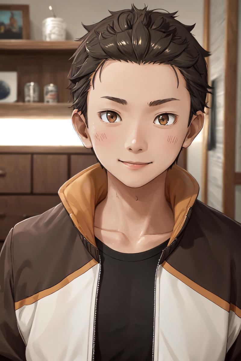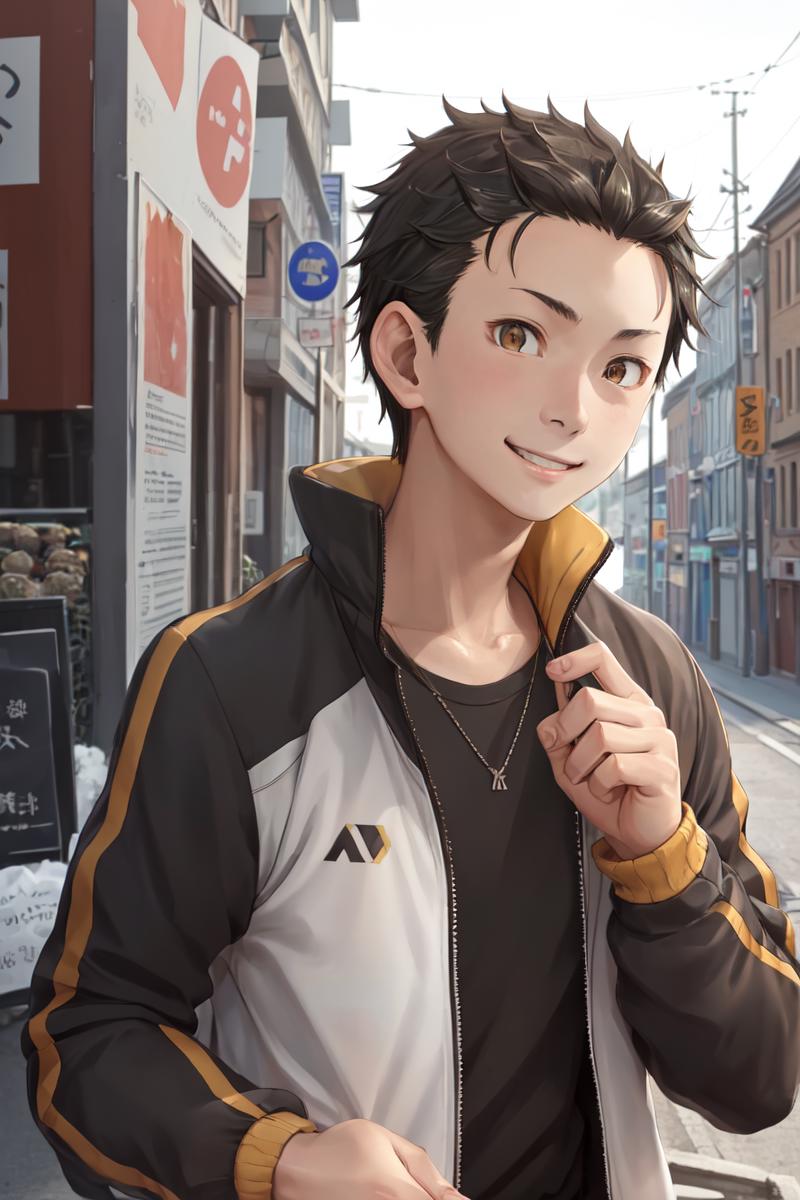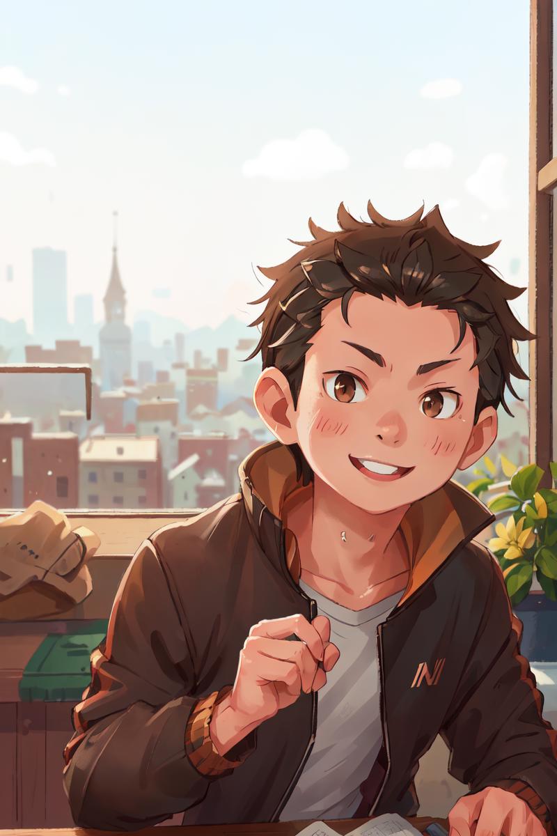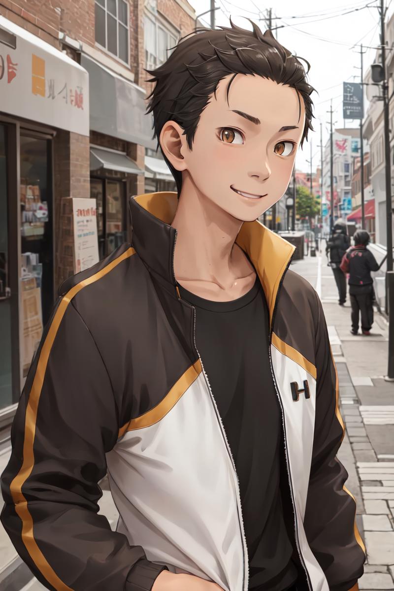 For better appearance add "brown eyes, jacket, black hair, smile, track jacket, hair slicked back"