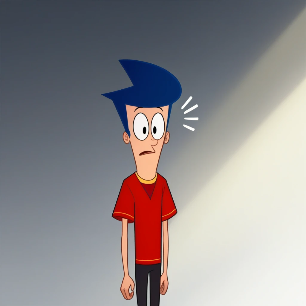 1boy, solo, Blake, blue hair, black eyes, red shirt,