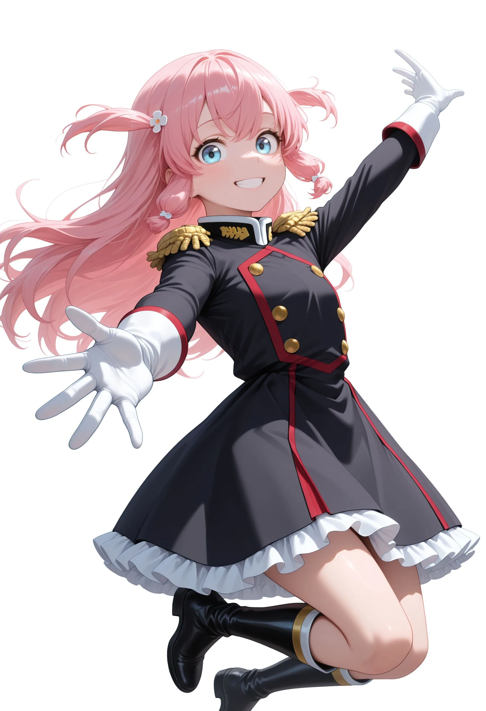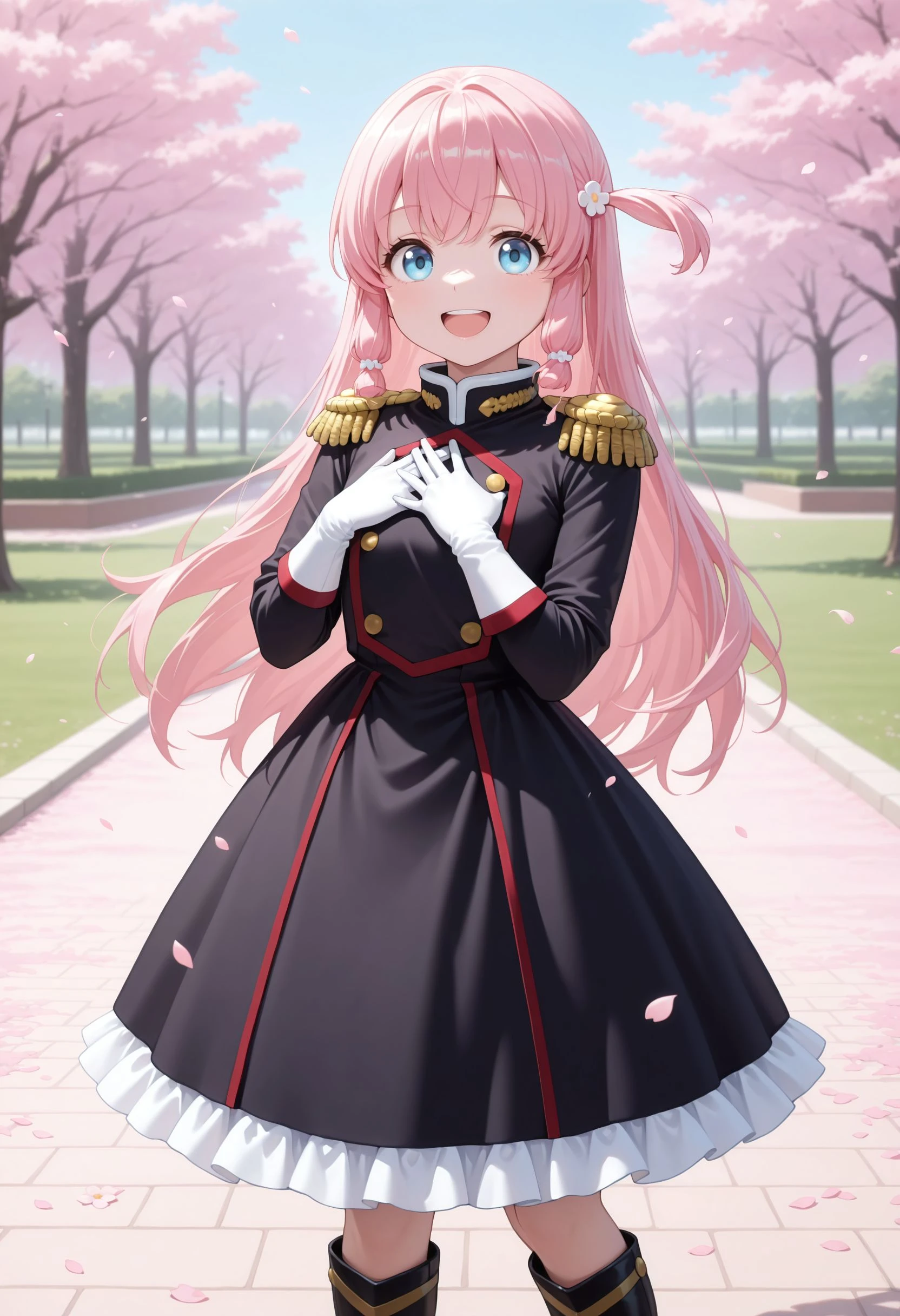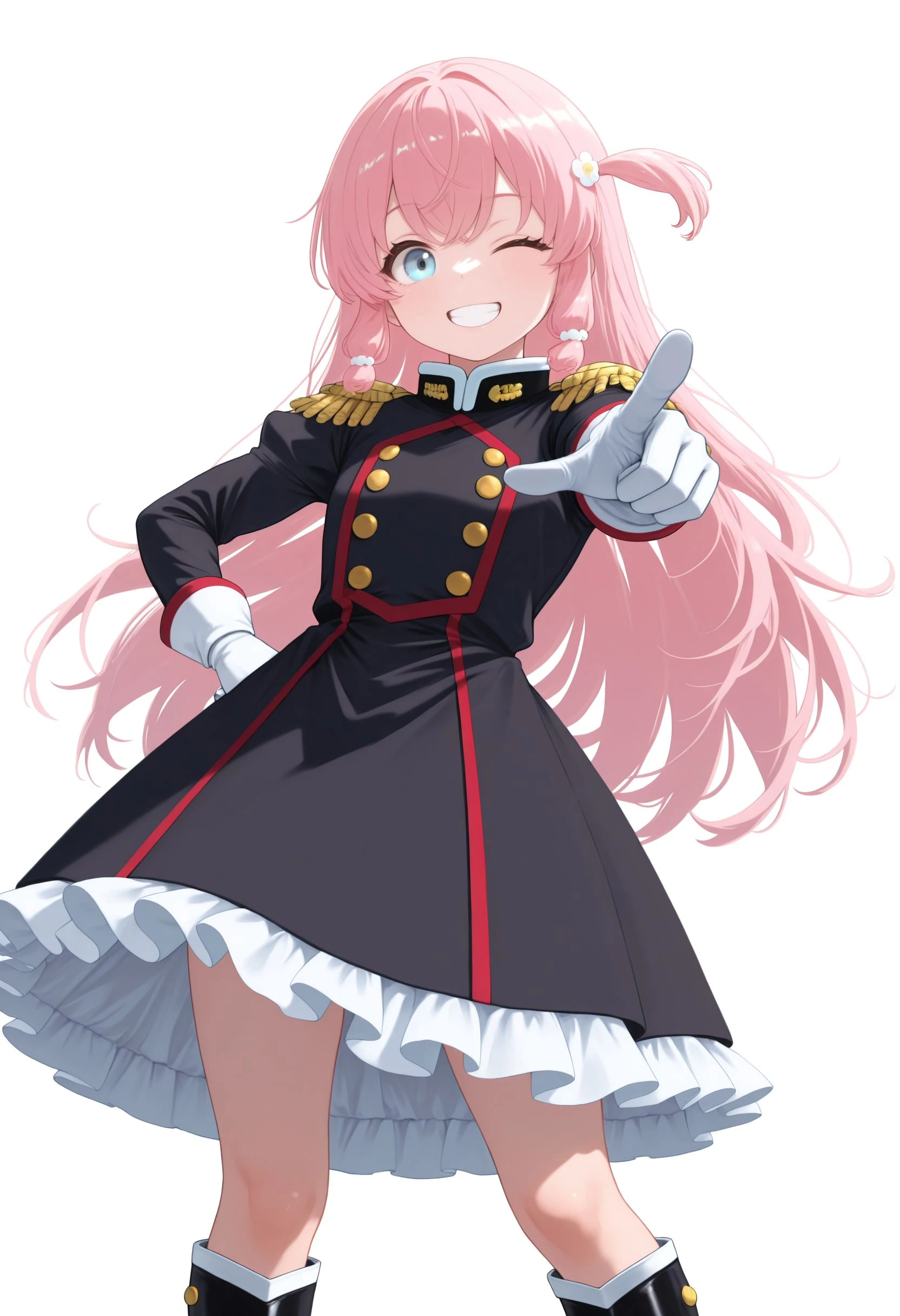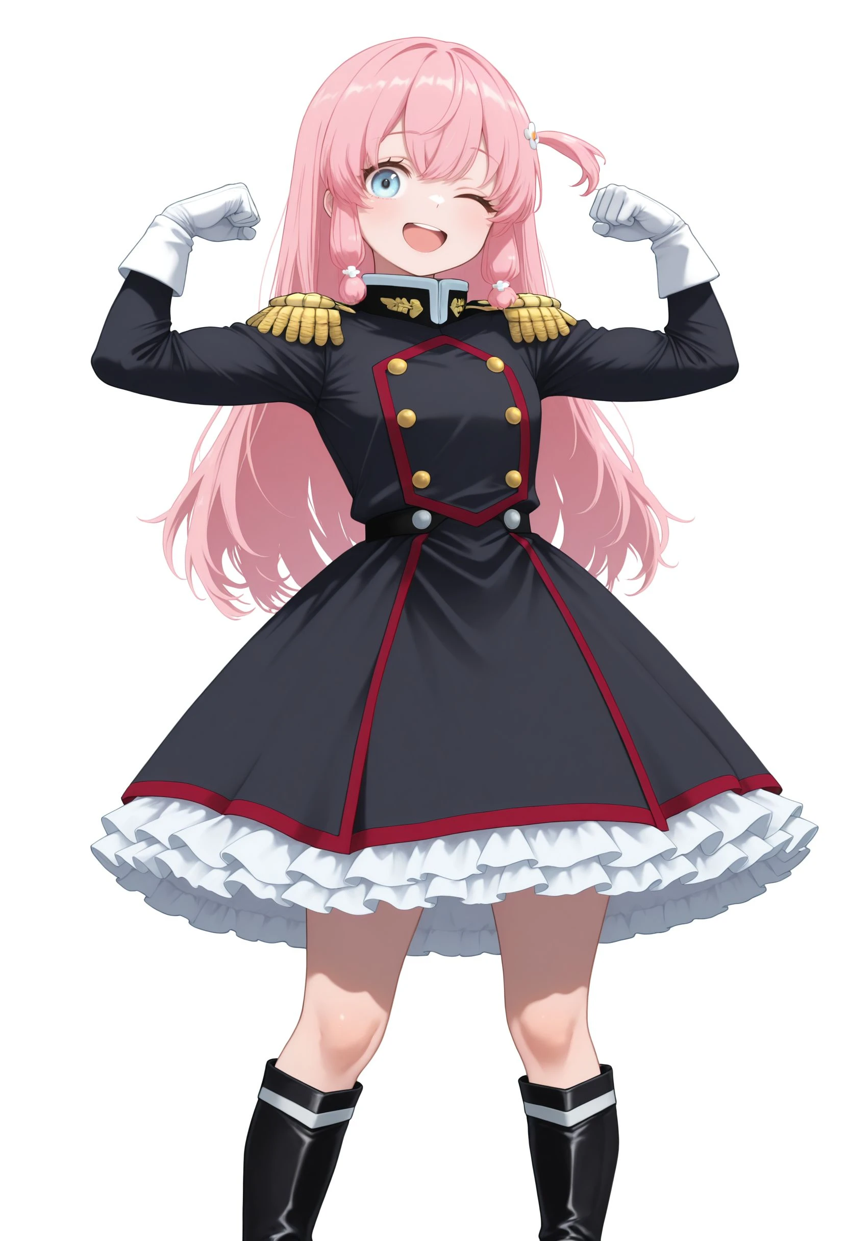 1girl, solo, long hair, pink hair, one side up, blue eyes, hair ornament, military uniform, long sleeves, epaulettes, white gloves, black dress, frilled dress, frills, knee boots, black footwear