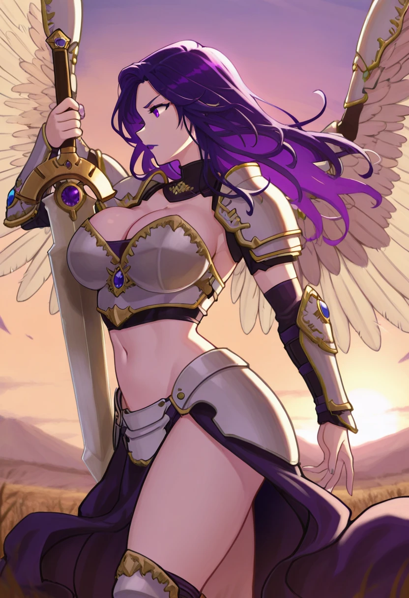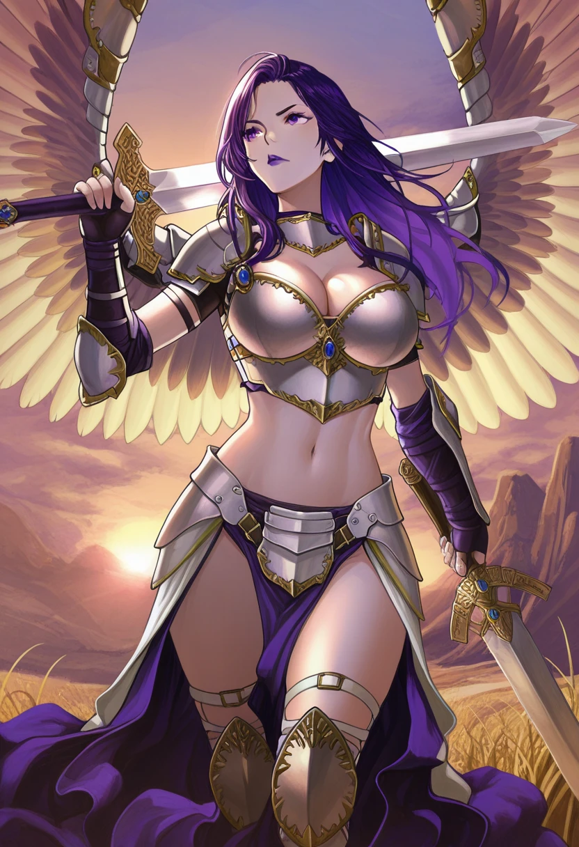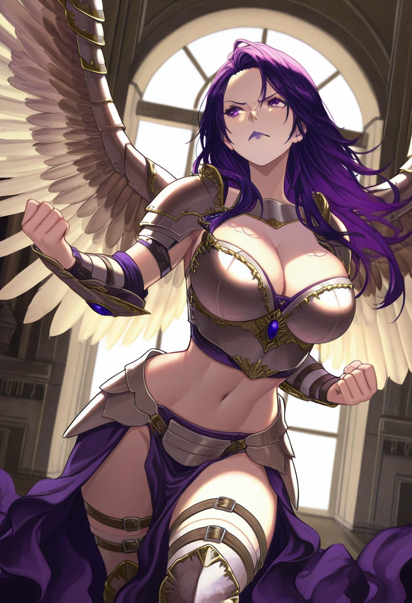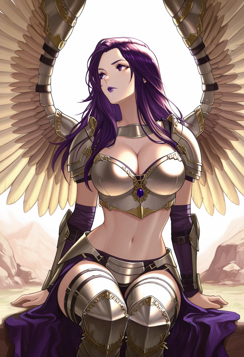 long hair, purple hair, purple eyes, purple lips, wings, feathered wings,