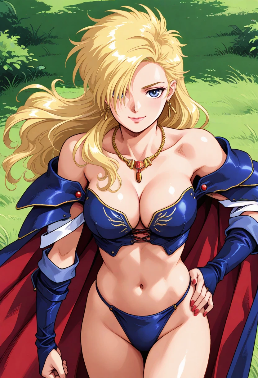 dela_armor, armor, bikini armor, off shoulder, jewelry, cape, cleavage, earrings, necklace