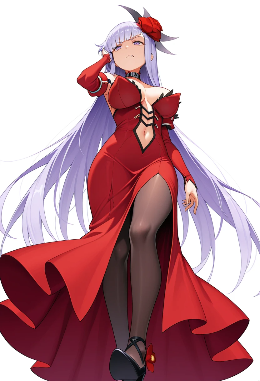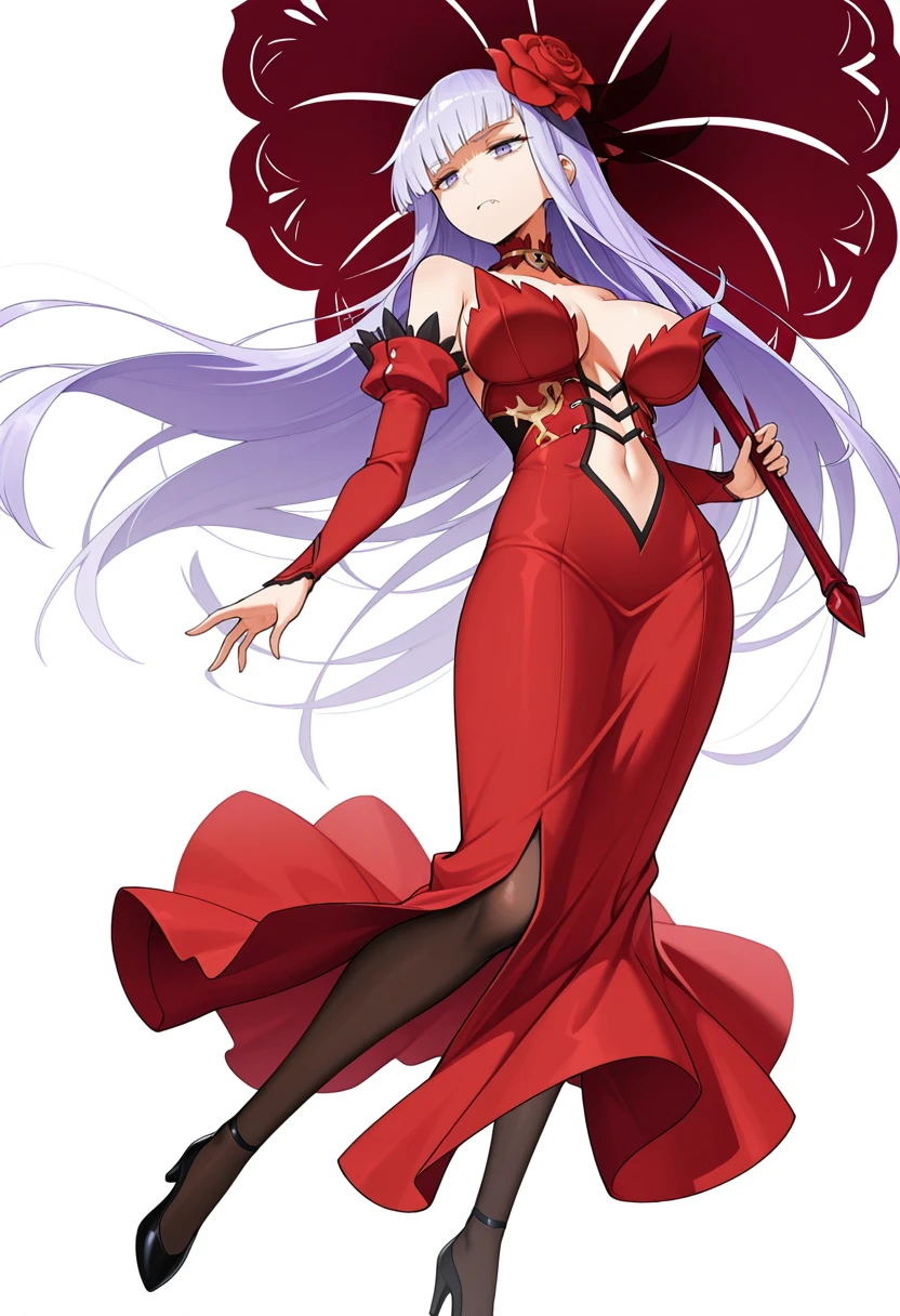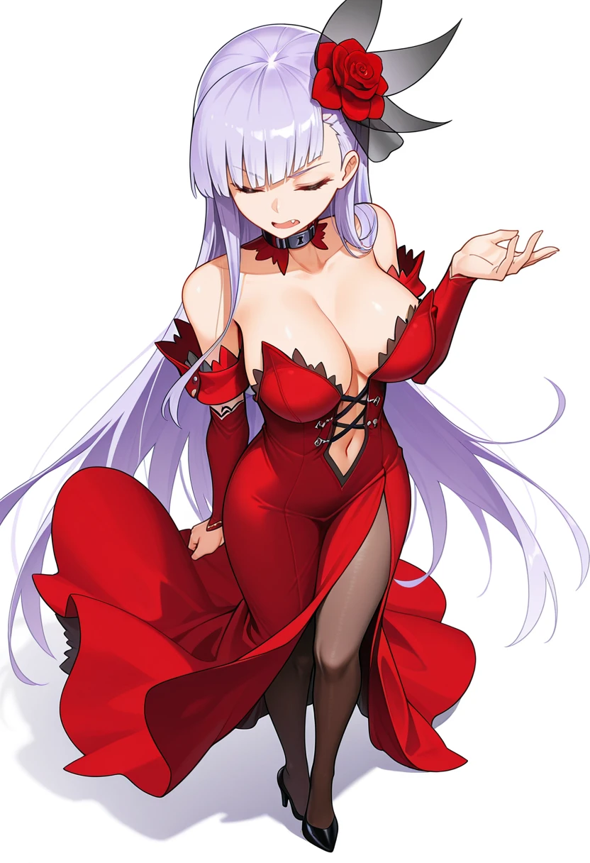 shoulders, red dress, choker, detached sleeves,collar, navel, pantyhose, high heels, long dress, sidecut,