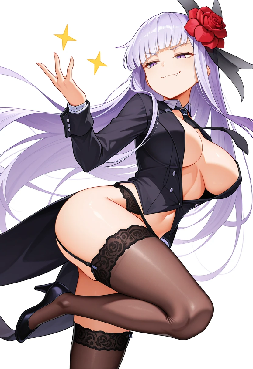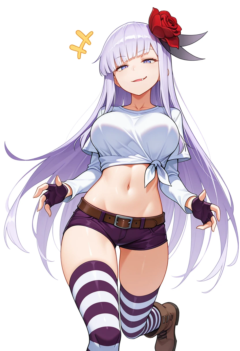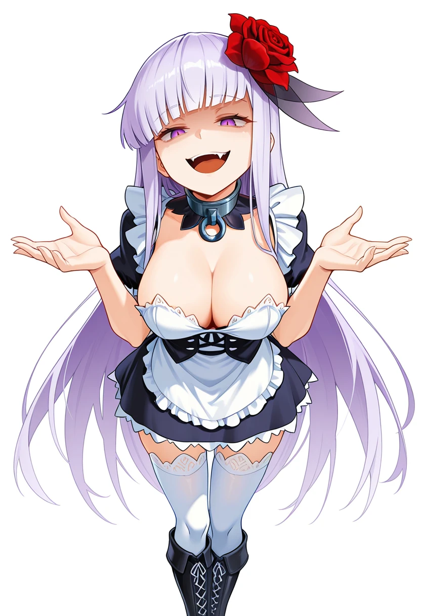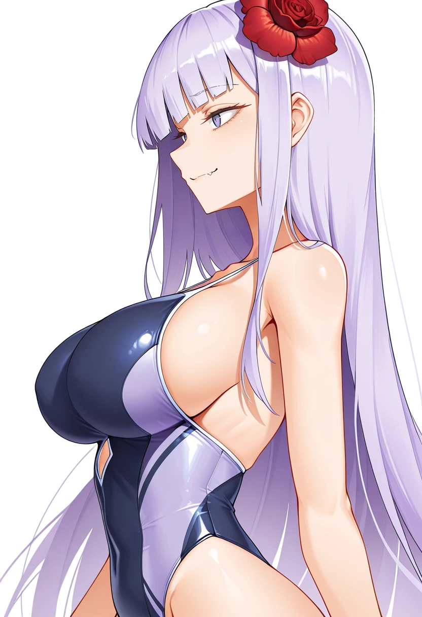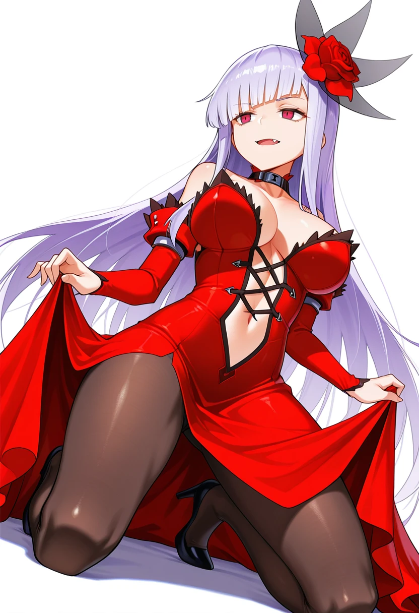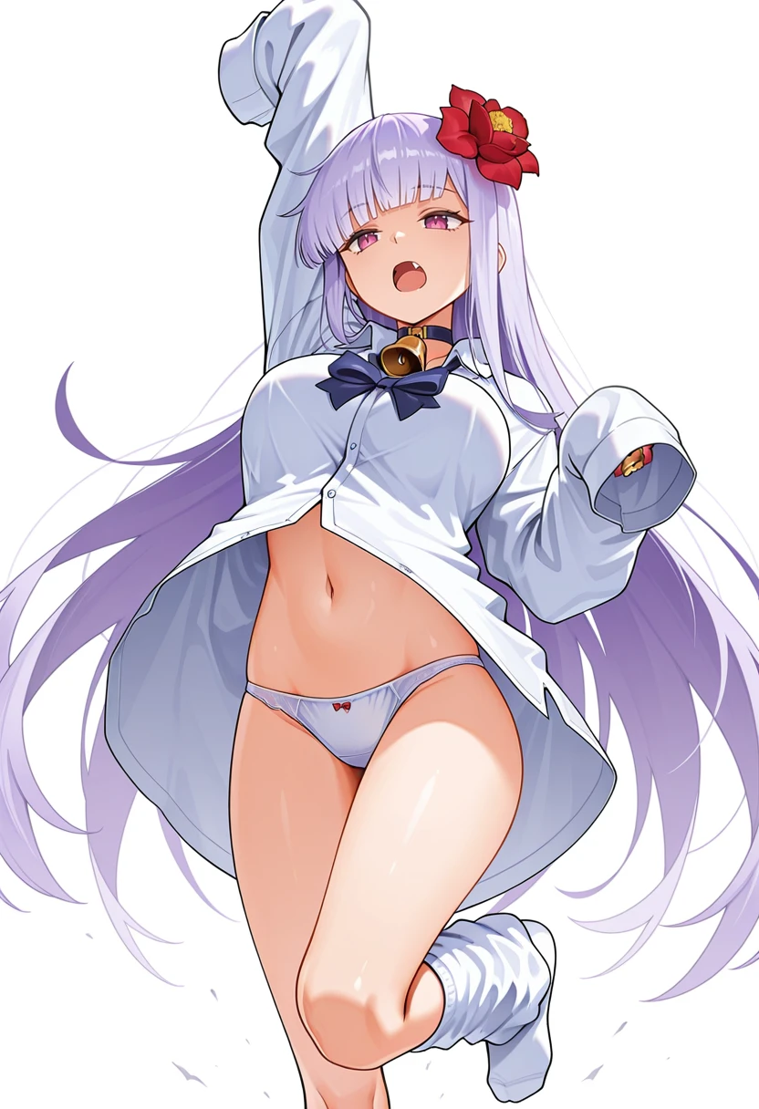 vamiline_cnr, 1girl,long hair, , blunt bangs, fang, very long hair,hair red flower,light purple hair,
