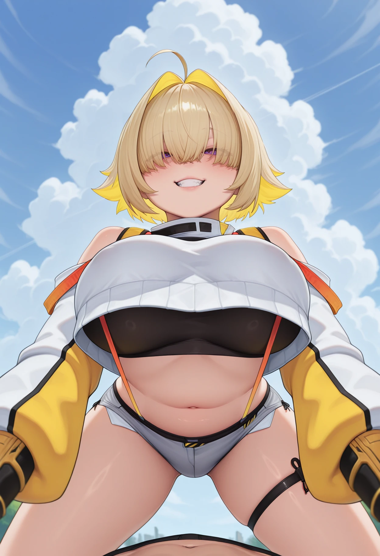 nikke_elegg,two-tone gloves, hair intakes, shorts, thigh strap, blonde hair, hair over eyes, short hair, ahoge, large breasts, long bangs, navel, multicolored hair, two-tone hair, long sleeves, micro shorts, crop top, suspenders, cropped sweater, suspender shorts, clothing cutout, shoulder cutout, exposed Pocket, black sports bra, crop top overhang